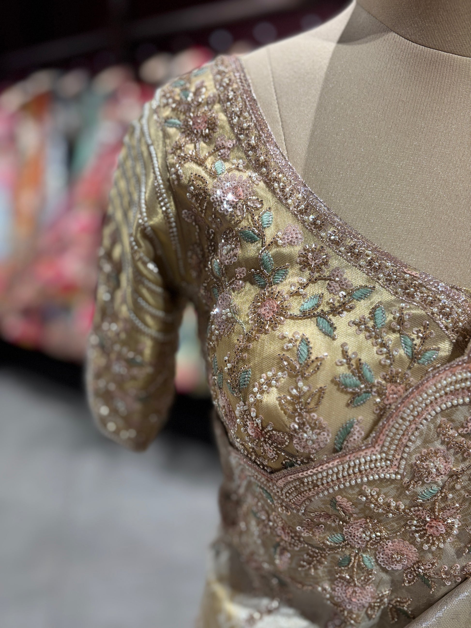 The beautifully embellished blouse enhances the royal charm, perfectly complementing the heavily worked pallu. The soft gold tones combined with delicate pink and antique zari accents create a timeless and graceful look.