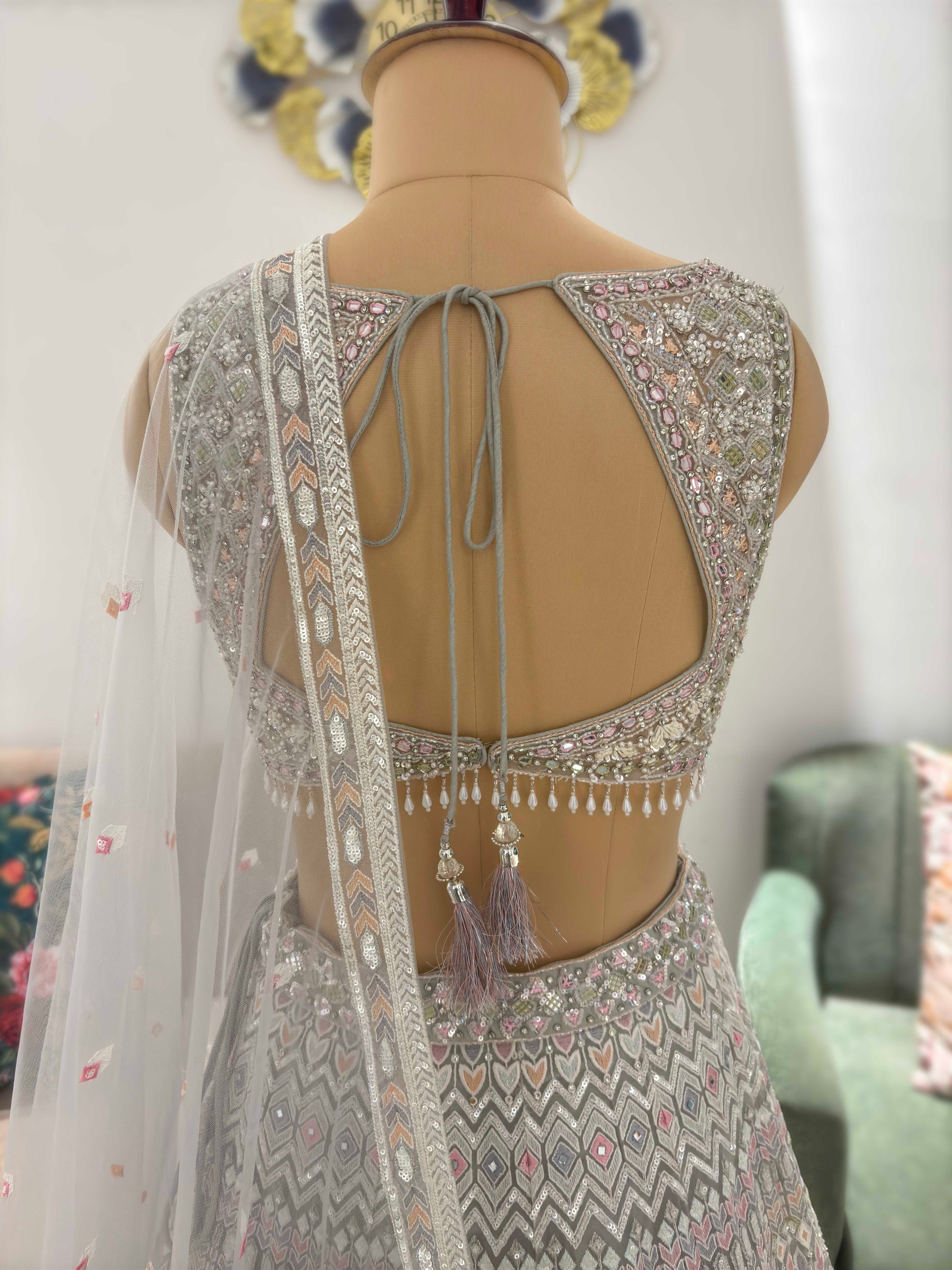 This intricately designed lehenga exudes elegance and sophistication, making it a perfect choice for grand celebrations and festive occasions. The ensemble features a heavily embroidered skirt paired with a beautifully tailored blouse, showcasing exquisite craftsmanship. A matching dupatta, draped gracefully, completes the traditional yet stylish look. Ideal for weddings and special events, this lehenga ensures you stand out with timeless charm and grace