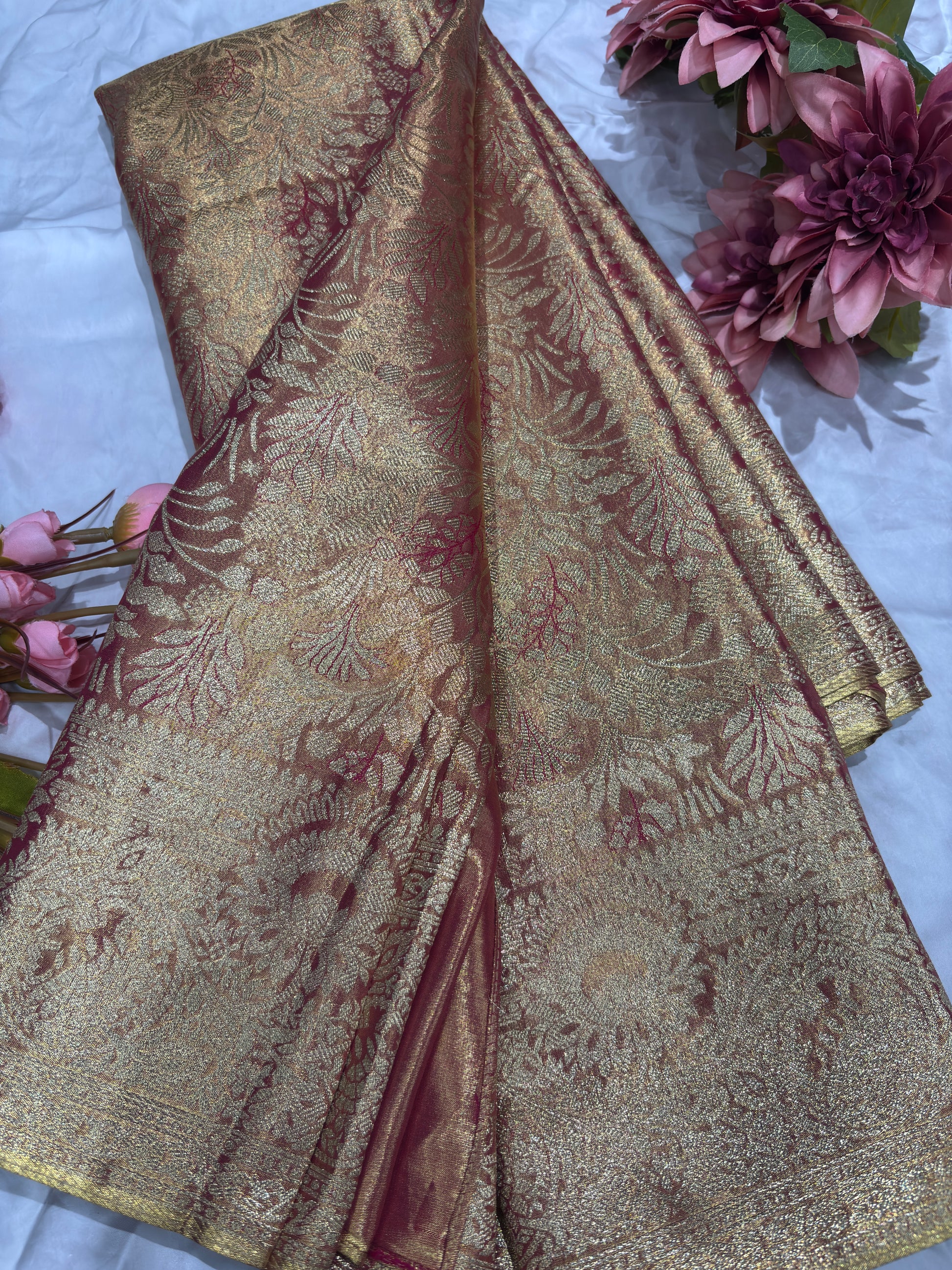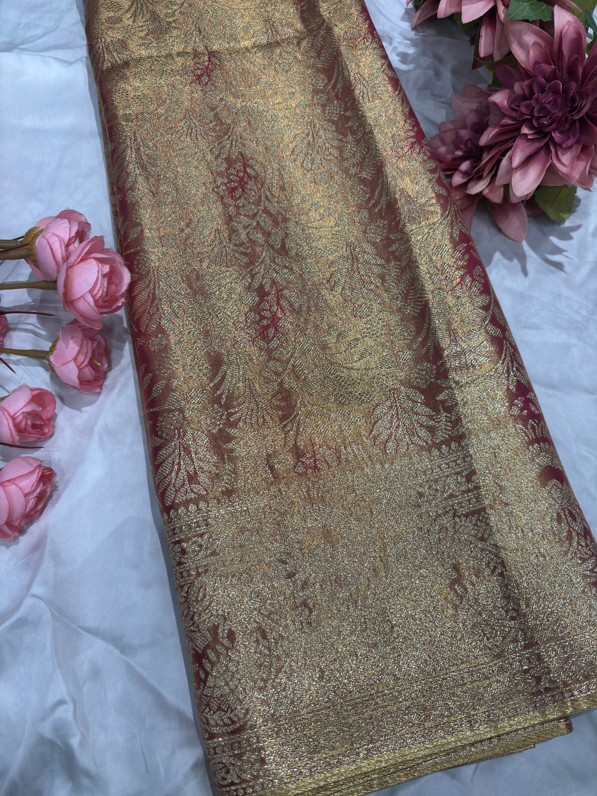 Elevate your ethnic style with this luxurious wine Kanchipuram silk saree, adorned with intricate gold zari floral weaving all over. The rich texture and elegant sheen give it a royal and timeless appeal. Designed for weddings, festive occasions, and special celebrations, this saree beautifully blends tradition with sophistication. Pair it with a statement blouse and jewelry to complete a graceful, regal look that never goes out of style.