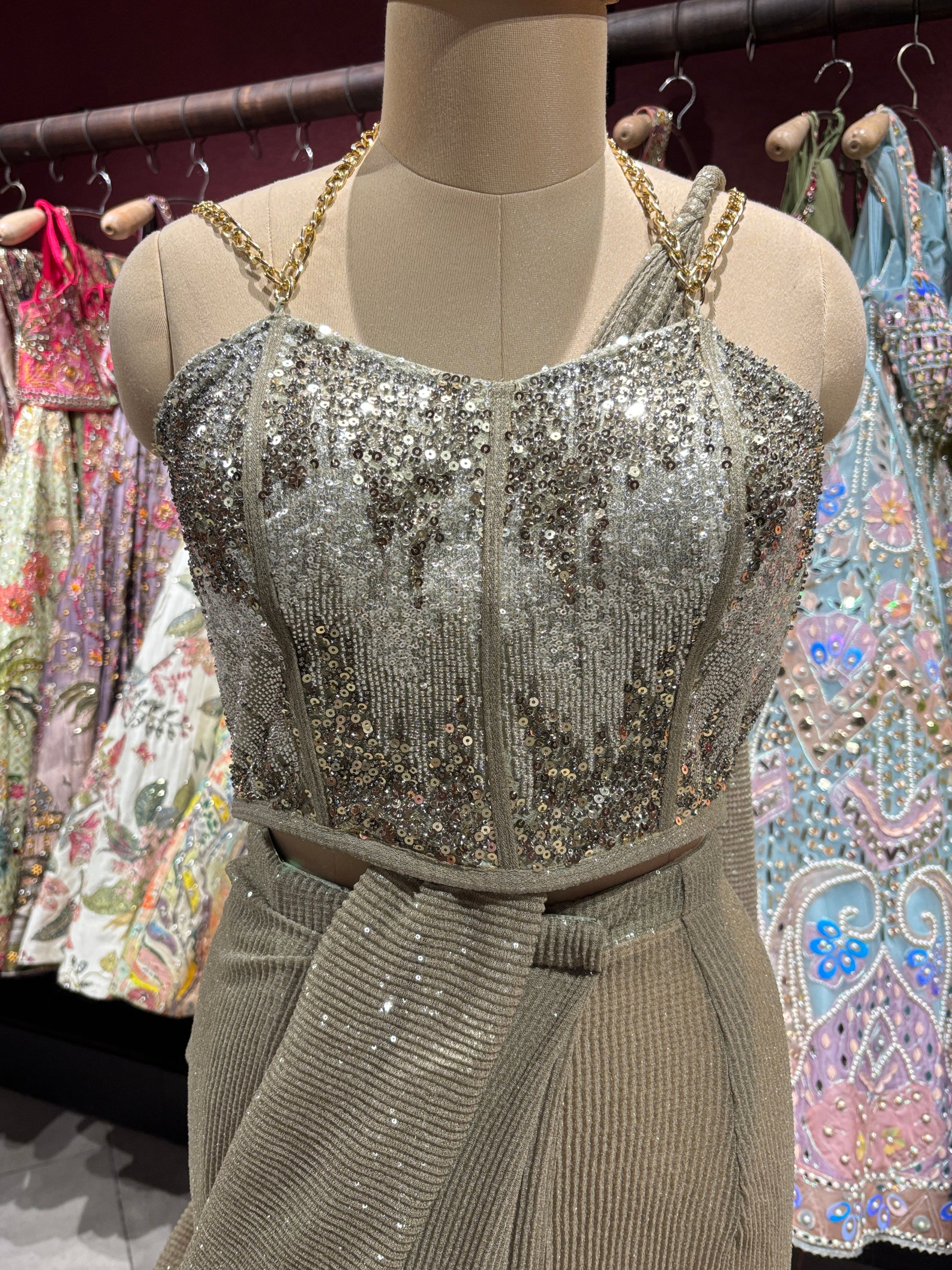 The highlight of this ensemble is the heavily sequined designer blouse featuring delicate strap detailing and a contemporary cropped fit. The sparkling embellishments add a glamorous touch, perfectly balancing the subtle shimmer of the saree.