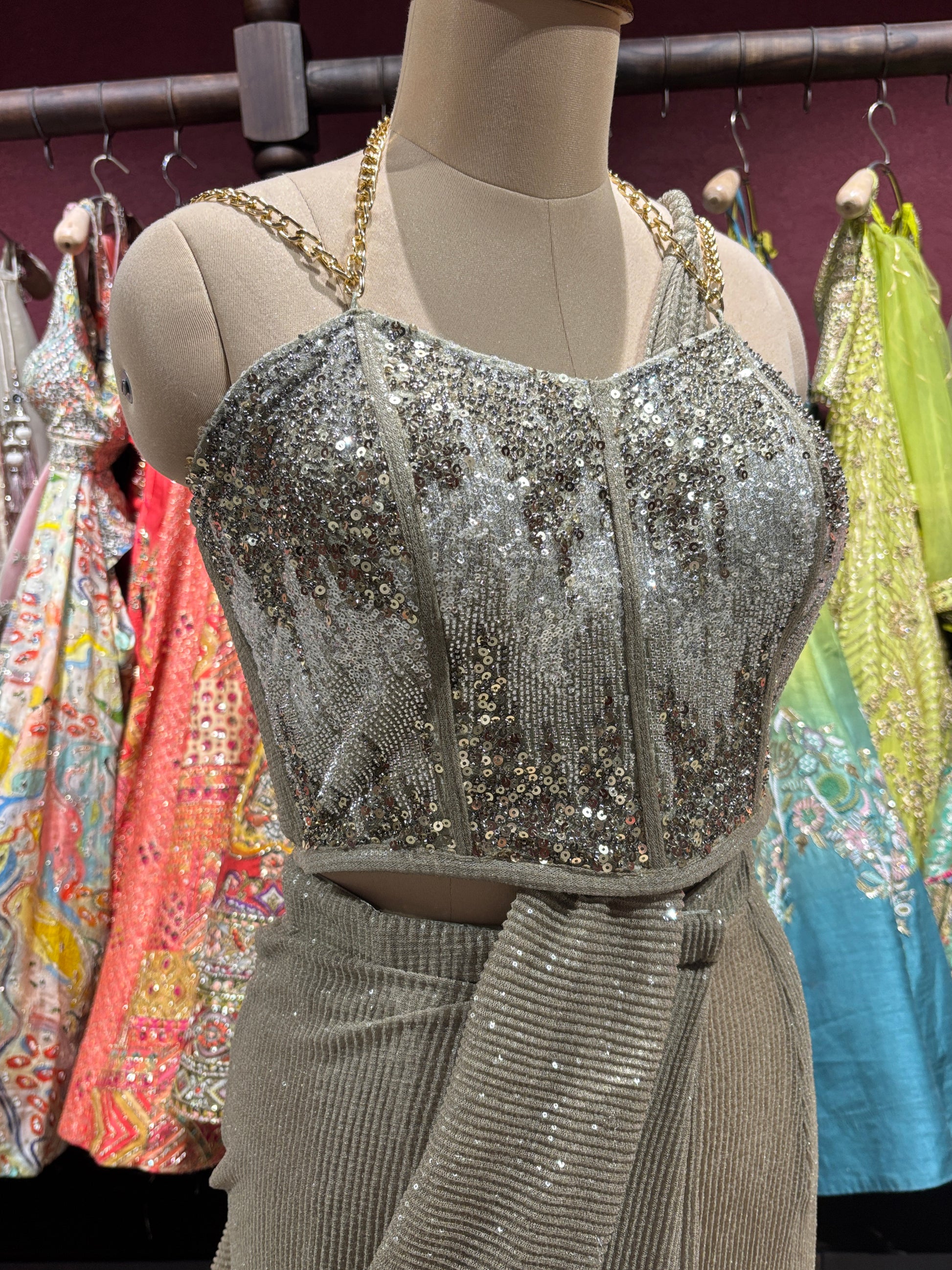 Step into effortless glamour with this stunning olive shimmer drape saree, designed for modern celebrations. Crafted in soft, pleated shimmer fabric, this saree creates a sleek and flattering silhouette that enhances your natural curves. The pre-styled drape adds structure and elegance, making it both fashionable and easy to carry.