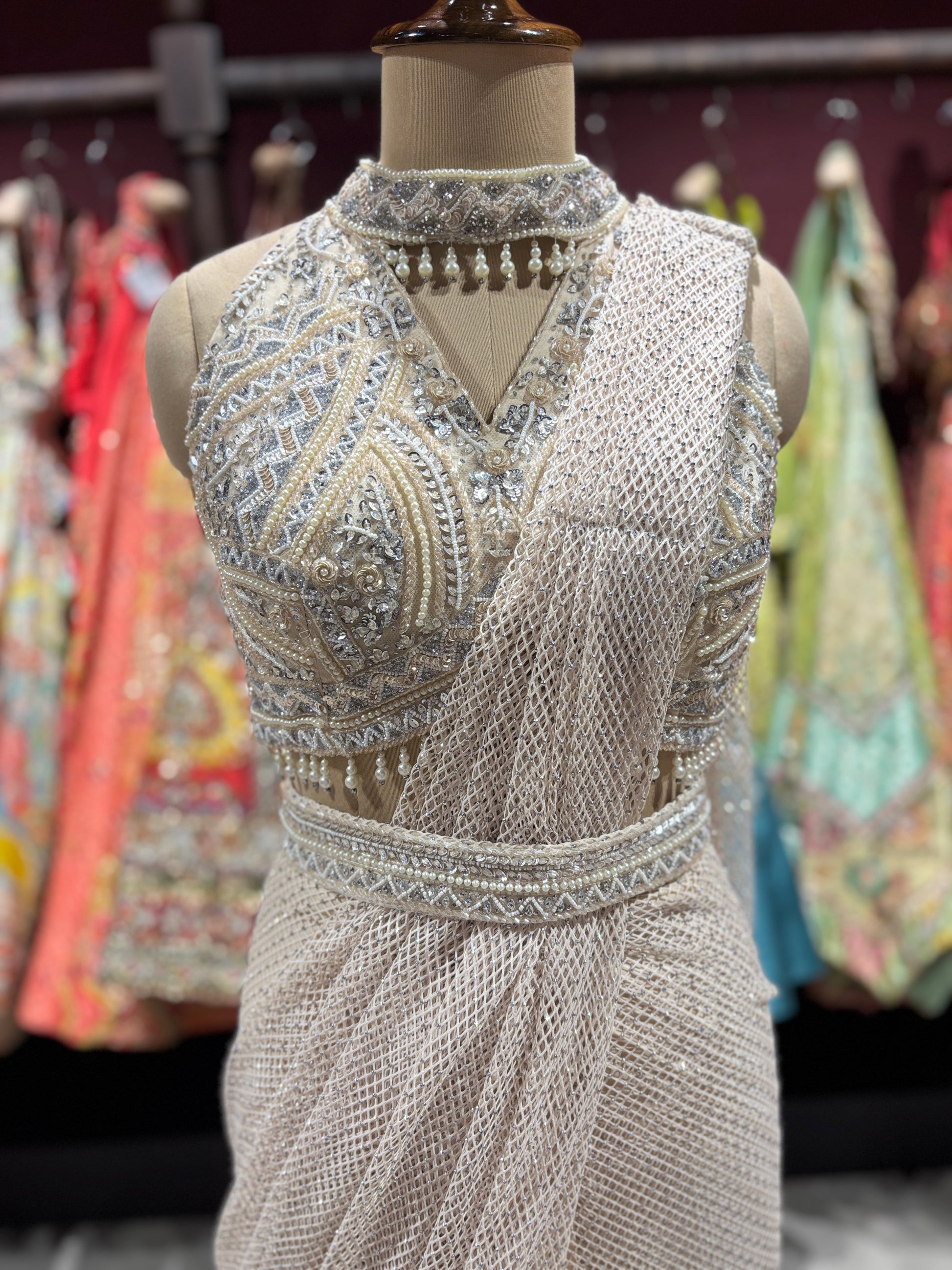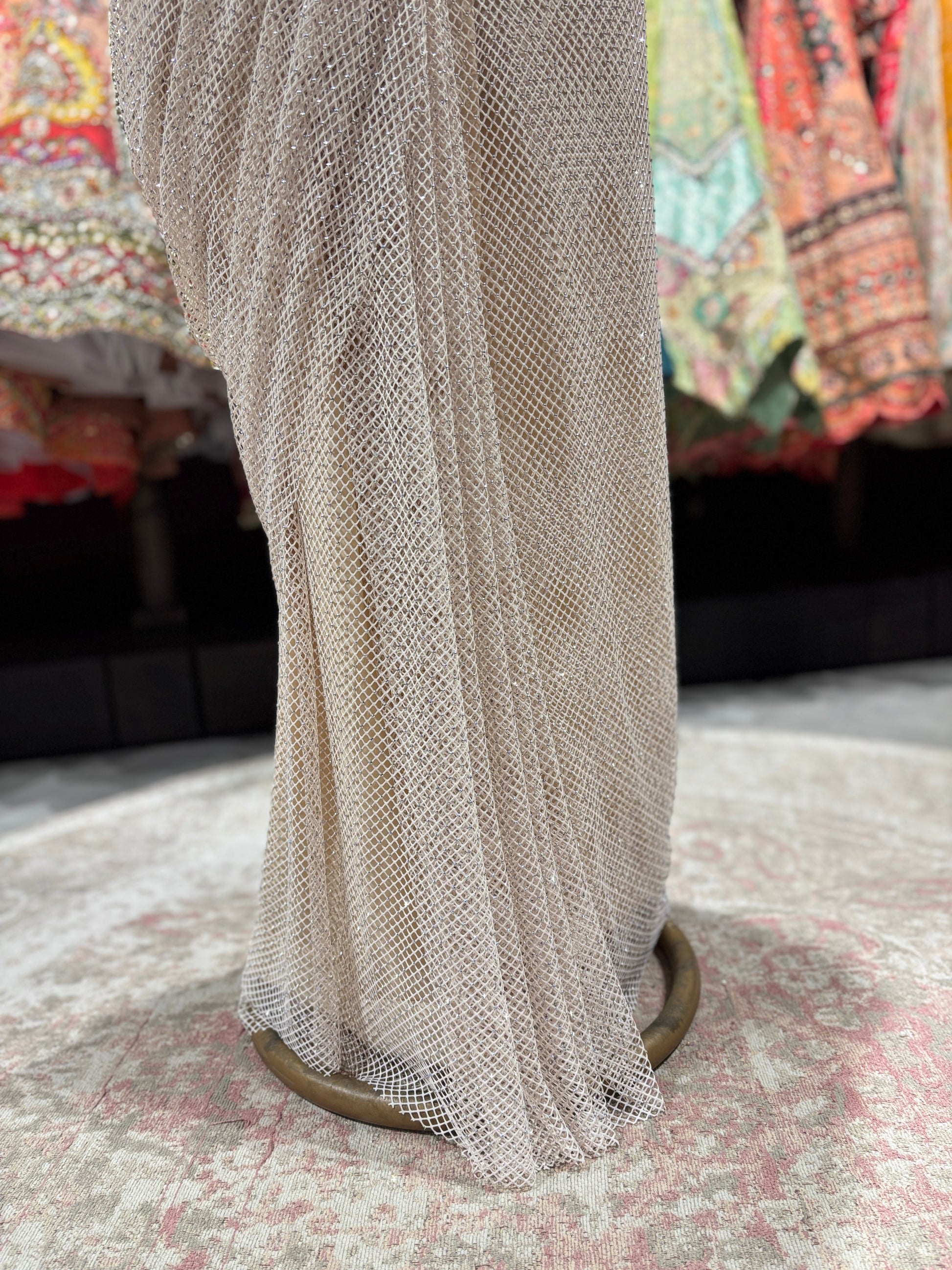 The beautifully draped net pallu enhances the silhouette, while the detailed waist border adds definition and sophistication. Its neutral champagne tone makes it a versatile choice for receptions, cocktail parties, engagement ceremonies, and festive celebrations.