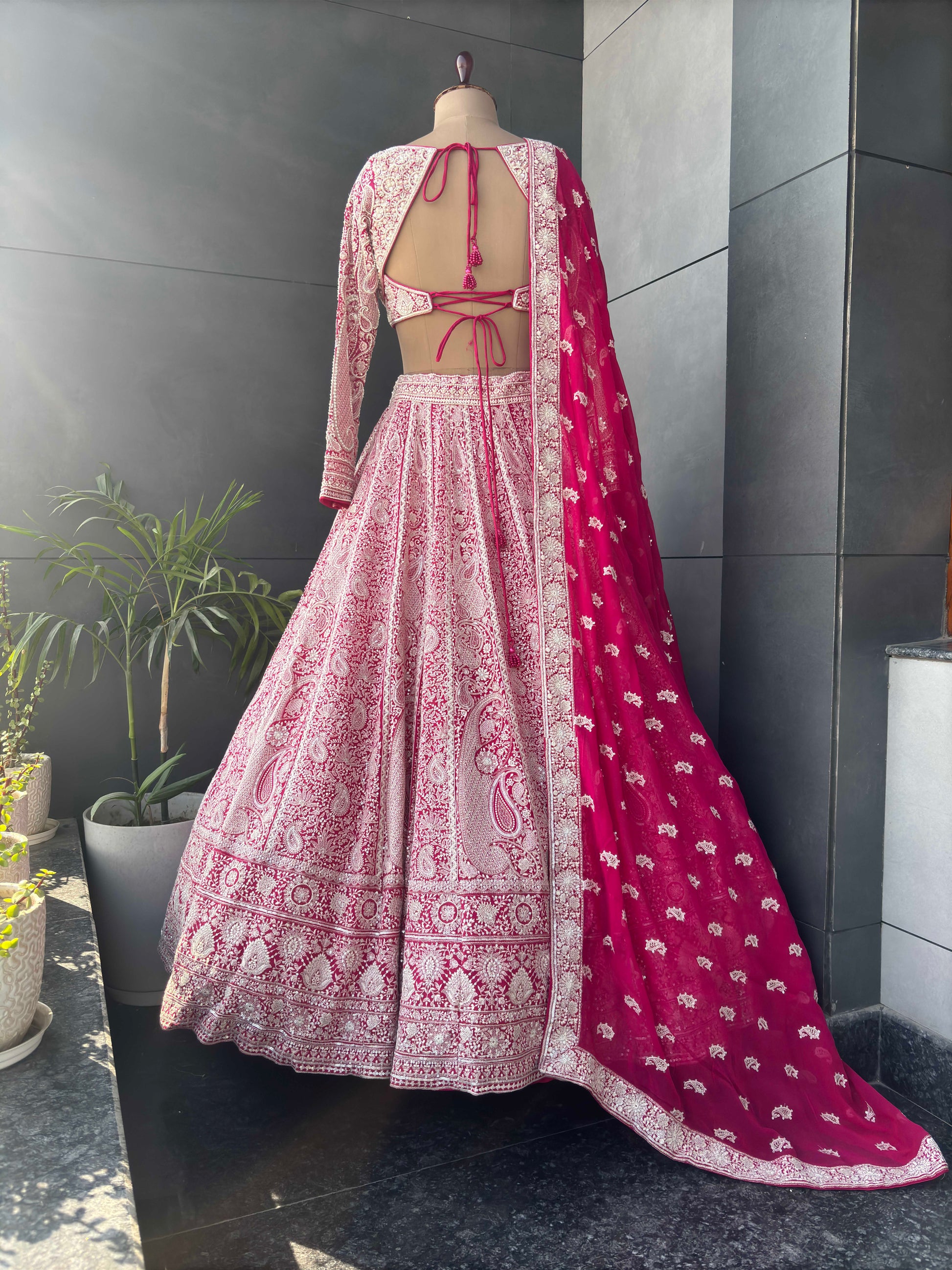 Add effortless elegance to your festive wardrobe with this stunning rose pink non-bridal lehenga, crafted for modern celebrations and special occasions. The lehenga showcases intricate all-over embroidery with paisley and floral motifs, beautifully highlighted with fine thread and zari work for a rich yet graceful look.