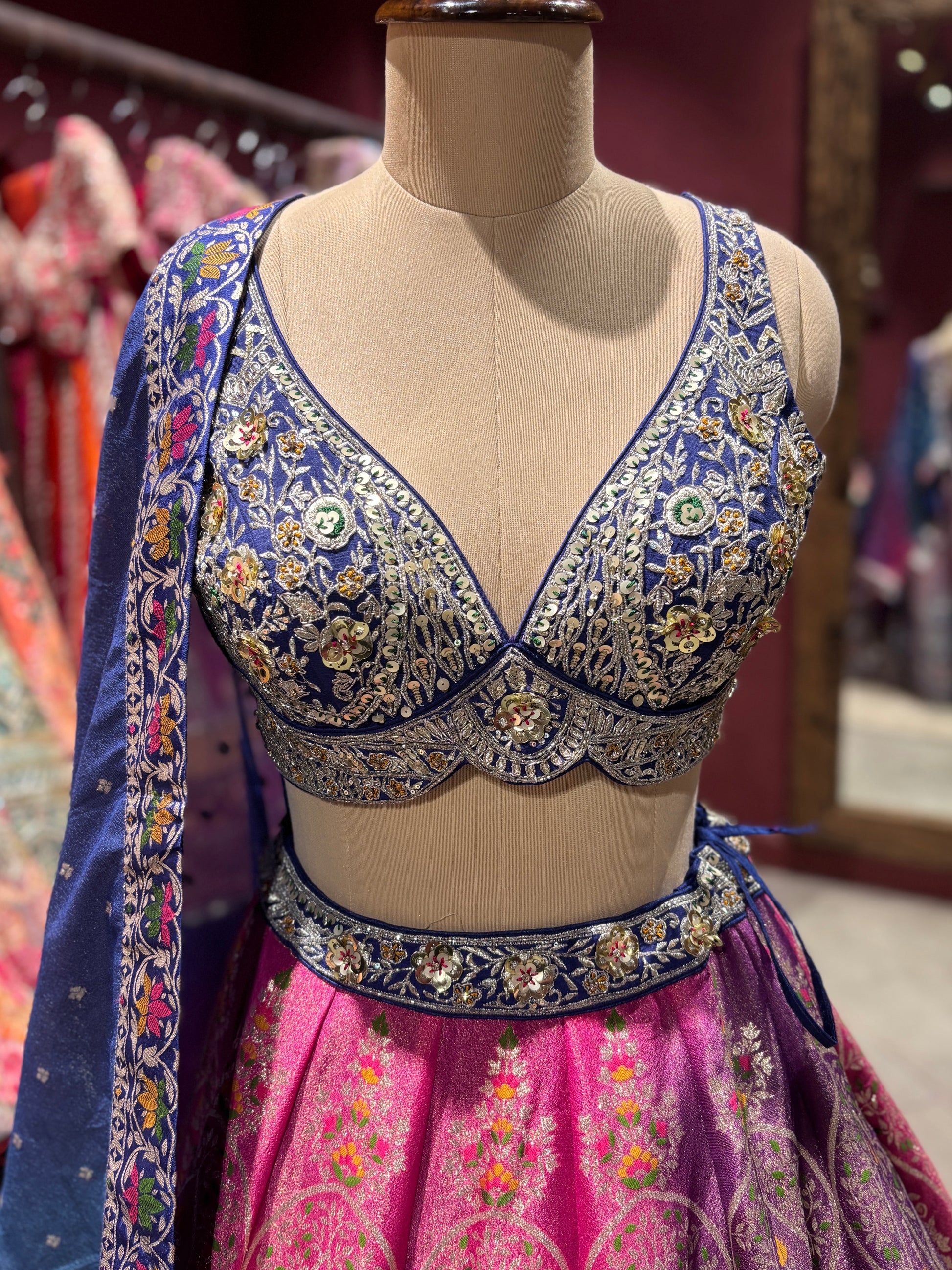 Make a vibrant style statement with this stunning multicolor designer lehenga, crafted with intricate floral weaving and rich detailing. The lehenga features a beautiful blend of pink, purple, and blue tones arranged in elegant traditional patterns, creating a lively yet regal look. The grand flare and detailed woven border enhance its luxurious appeal, making it perfect for weddings, receptions, and festive celebrations.