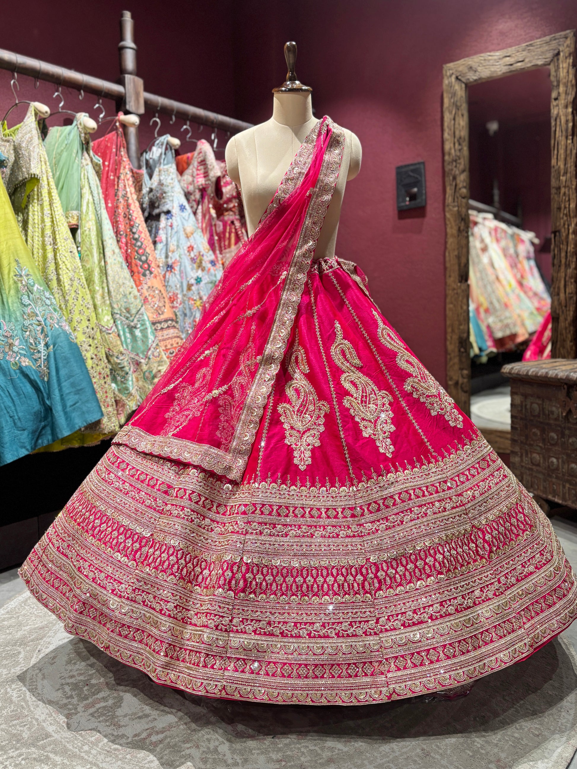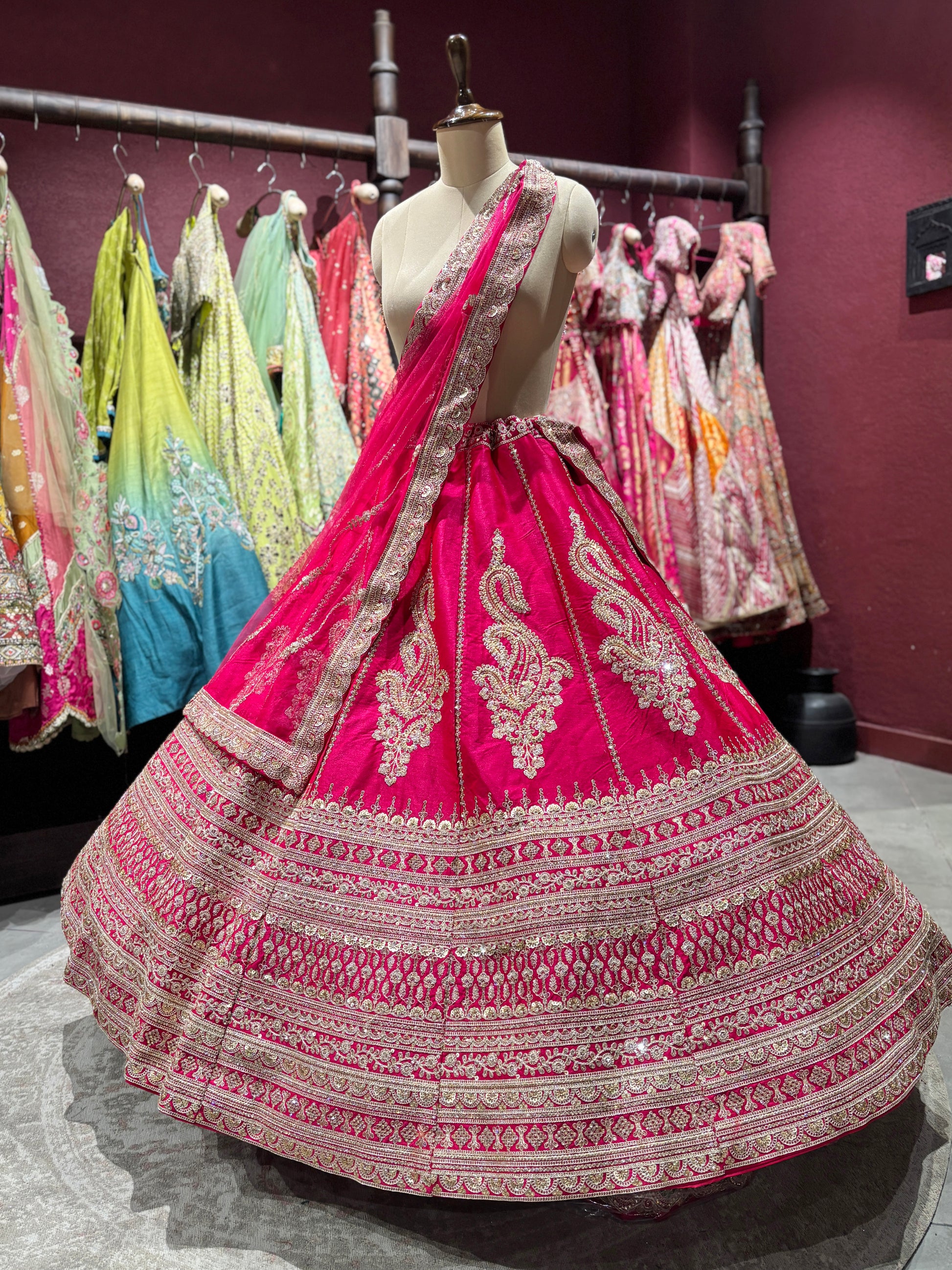 Create your dream bridal look with this stunning rani pink unstitched bridal lehenga, designed with rich zari embroidery and luxurious traditional detailing. Crafted from premium quality fabric, the lehenga features intricate gold threadwork in elegant paisley and heritage motifs, giving it a royal and timeless appeal. The grand embroidered border and detailed craftsmanship enhance its beauty, making it perfect for weddings and special bridal occasions.