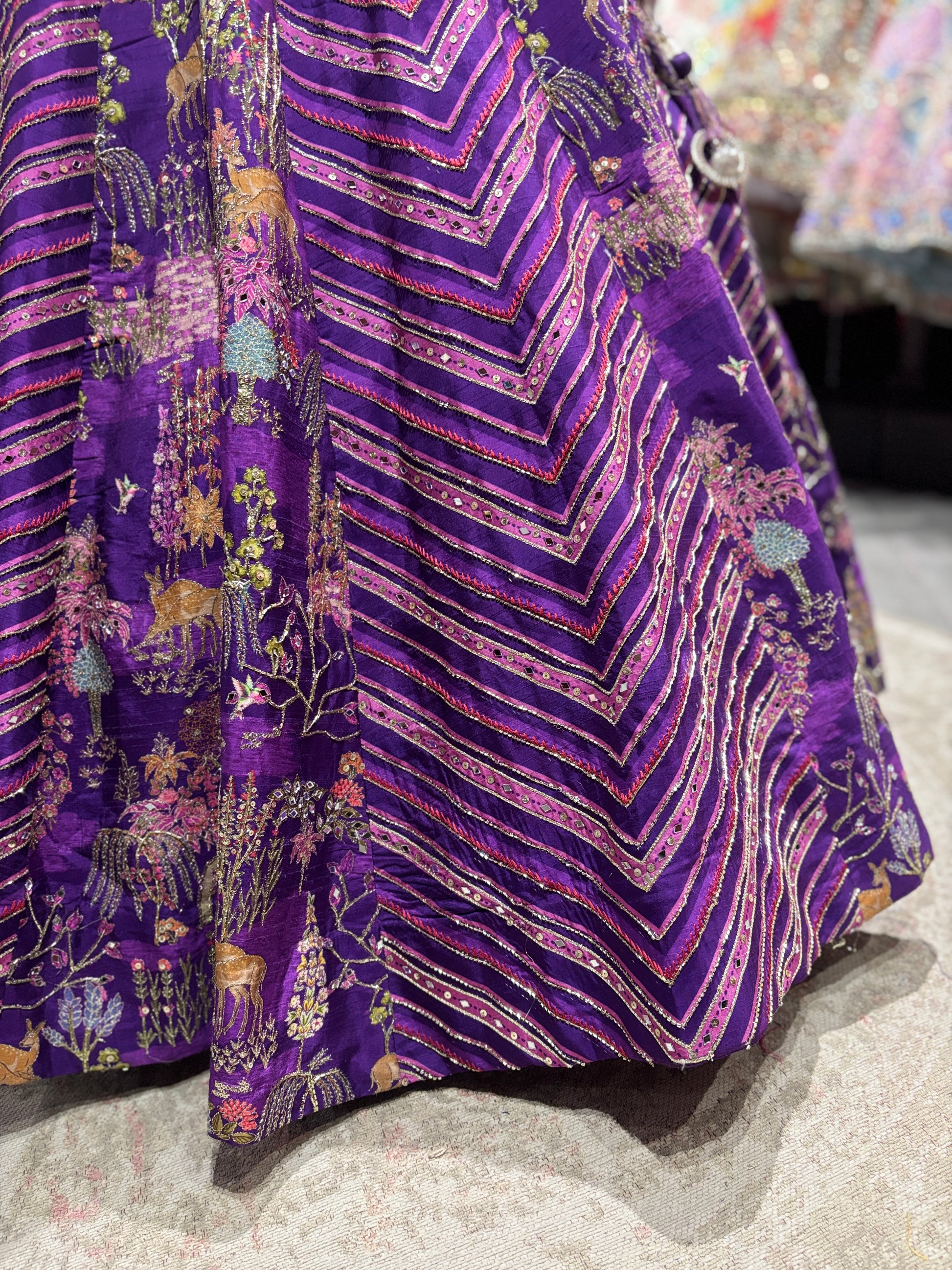 Turn heads in this stunning royal purple lehenga, designed with vibrant multi-color embroidery and striking chevron patterns. Crafted on a rich silk-blend base, the lehenga features intricate zari and thread work showcasing floral, traditional, and artistic motifs that add depth and character. The bold zigzag design enhances the flare, creating a dramatic and flattering silhouette.