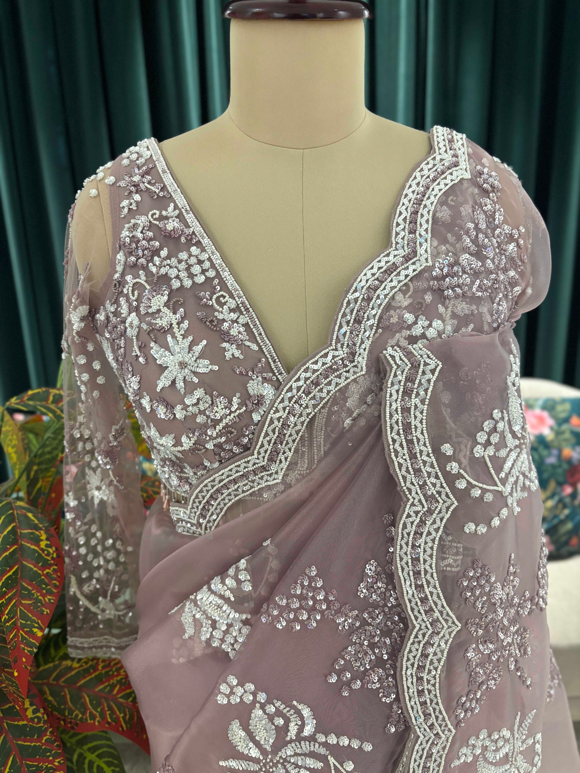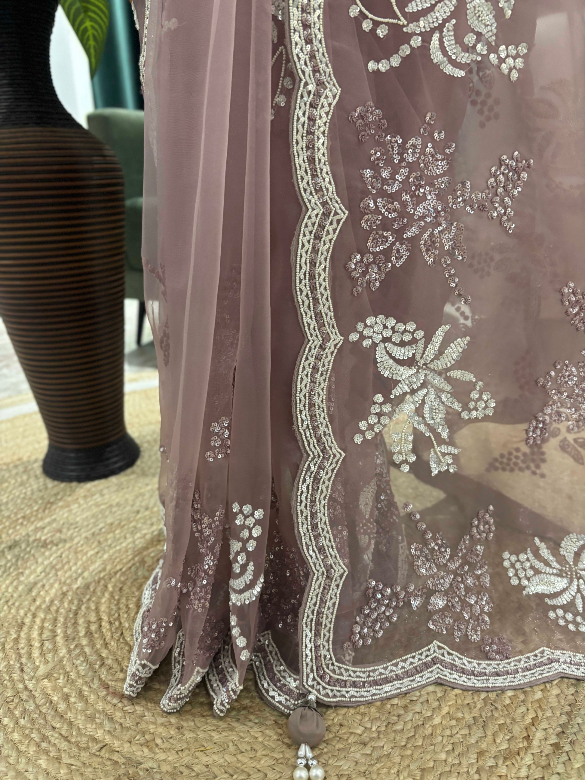 Add a touch of graceful sophistication to your ethnic collection with this beautiful mauve net saree. Designed in a soft, muted mauve tone, this saree features delicate floral embroidery spread elegantly across the sheer net fabric, creating a dreamy and refined look.