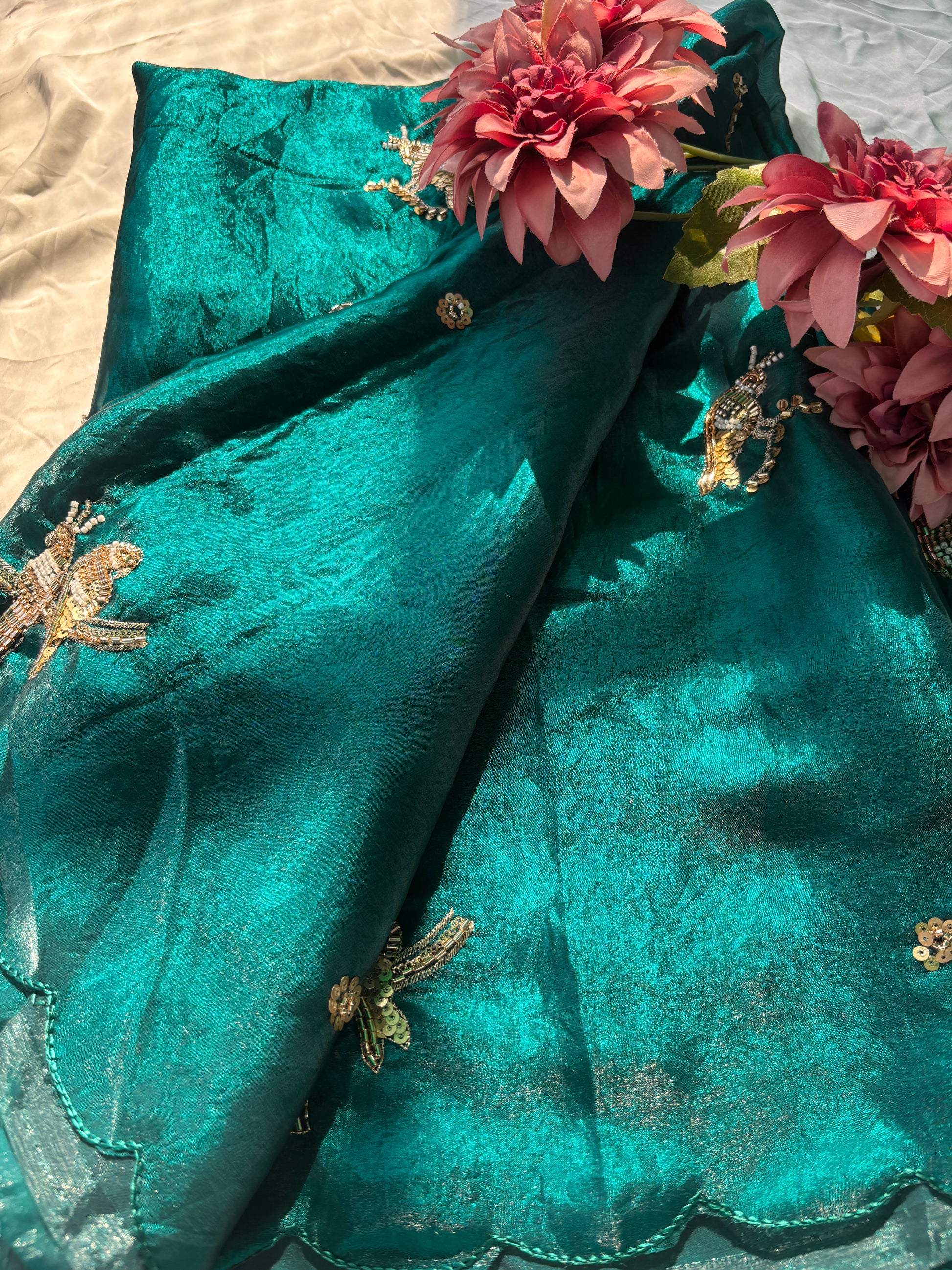 Elevate your ethnic wardrobe with this stunning emerald green saree, designed for women who appreciate subtle luxury and fine craftsmanship. The saree features delicate hand-embroidered bird motifs adorned with sequins and beadwork, adding a graceful and artistic touch. The rich, glossy texture of organza beautifully reflects light, giving the saree a soft shimmer and elegant fall.