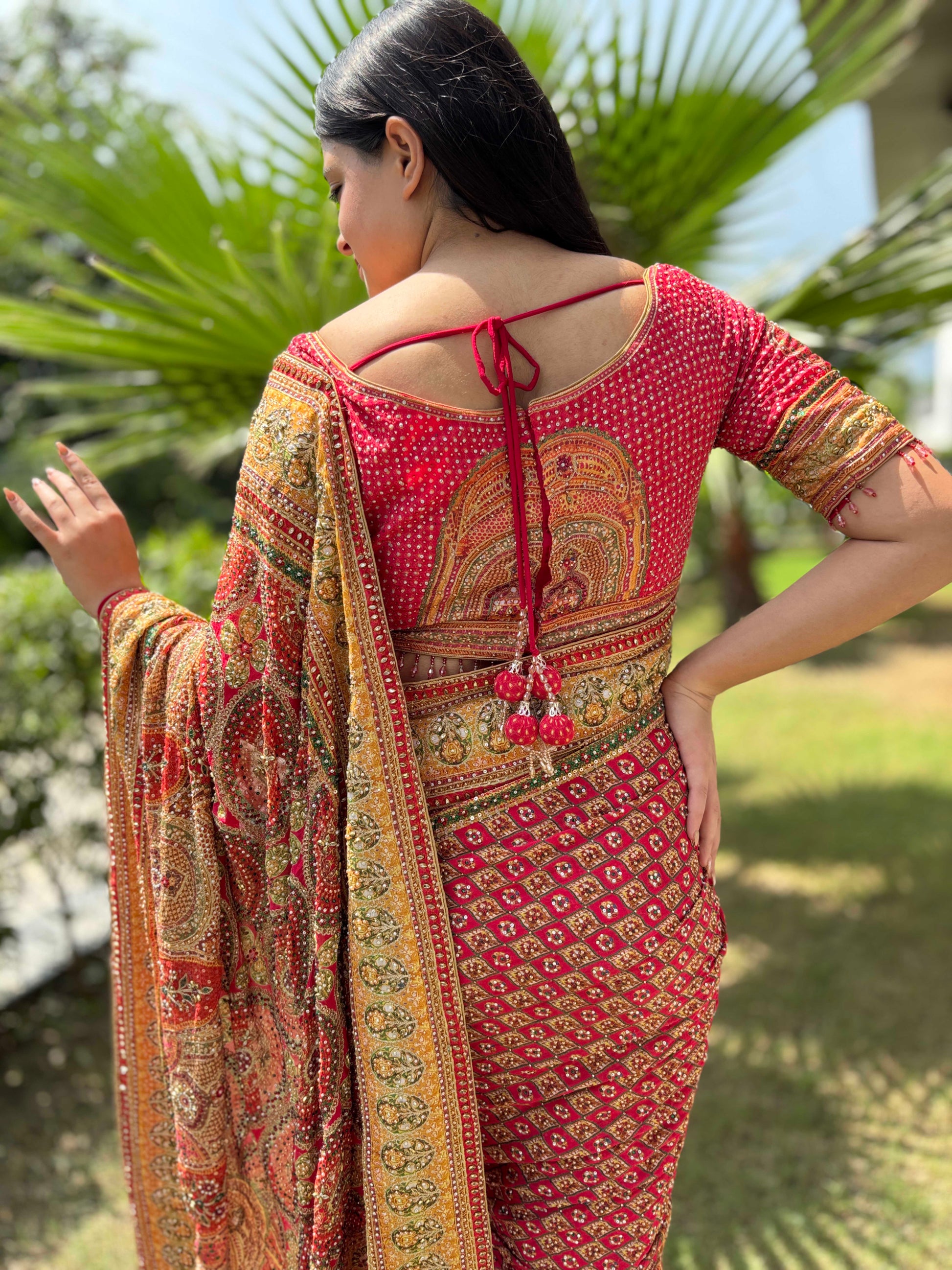 Celebrate timeless Indian elegance with this stunning red and mustard Bandhani silk saree, crafted to perfection for festive and wedding occasions. Featuring classic Bandhani-inspired motifs with intricate zari detailing, this saree showcases rich heritage artistry blended with vibrant colors.