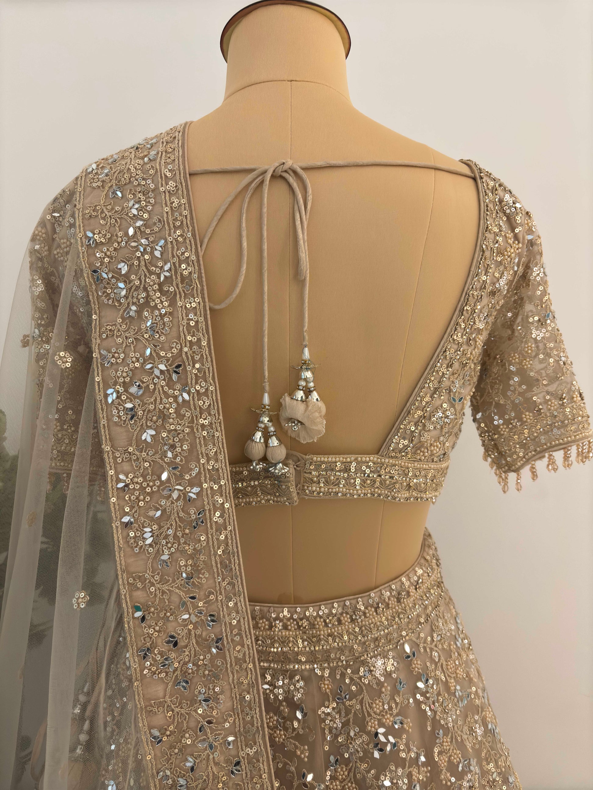 This lehenga set is a masterpiece of elegant design and intricate craftsmanship. The blouse showcases exquisite embroidery and fine detailing, beautifully complemented by the long, flared skirt adorned with ornate patterns and embellishments. Completing the look is a sheer dupatta, gracefully designed with delicate accents, adding an extra layer of sophistication. Perfect for weddings, cultural events, and festive occasions, this ensemble exudes timeless artistry and charm