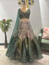 Drenched in emerald green elegance, this exquisite ensemble is a testament to timeless artistry. The delicate net fabric lends an ethereal grace, while the intricate metallic work adds a shimmering allure that catches the light beautifully. The lehenga features a mesmerizing interplay of chevron stripes and floral motifs, creating a sophisticated balance between tradition and modern charm. Paired with a matching net dupatta, the ensemble offers an enchanting drape that cascades effortlessly, accentuating its regal appeal. Perfect for grand celebrations, this outfit exudes opulence and refined craftsmanship, making it an irresistible choice for those who seek sophistication with a touch of grandeur