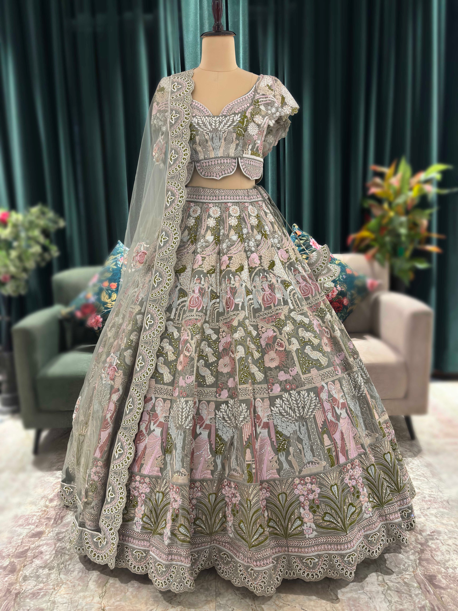 Elevate your festive wardrobe with this exquisitely designed lehenga, featuring intricate embroidery and captivating nature-inspired motifs. The ensemble includes a blouse with a sweetheart neckline, a heavily embroidered skirt, and a dupatta