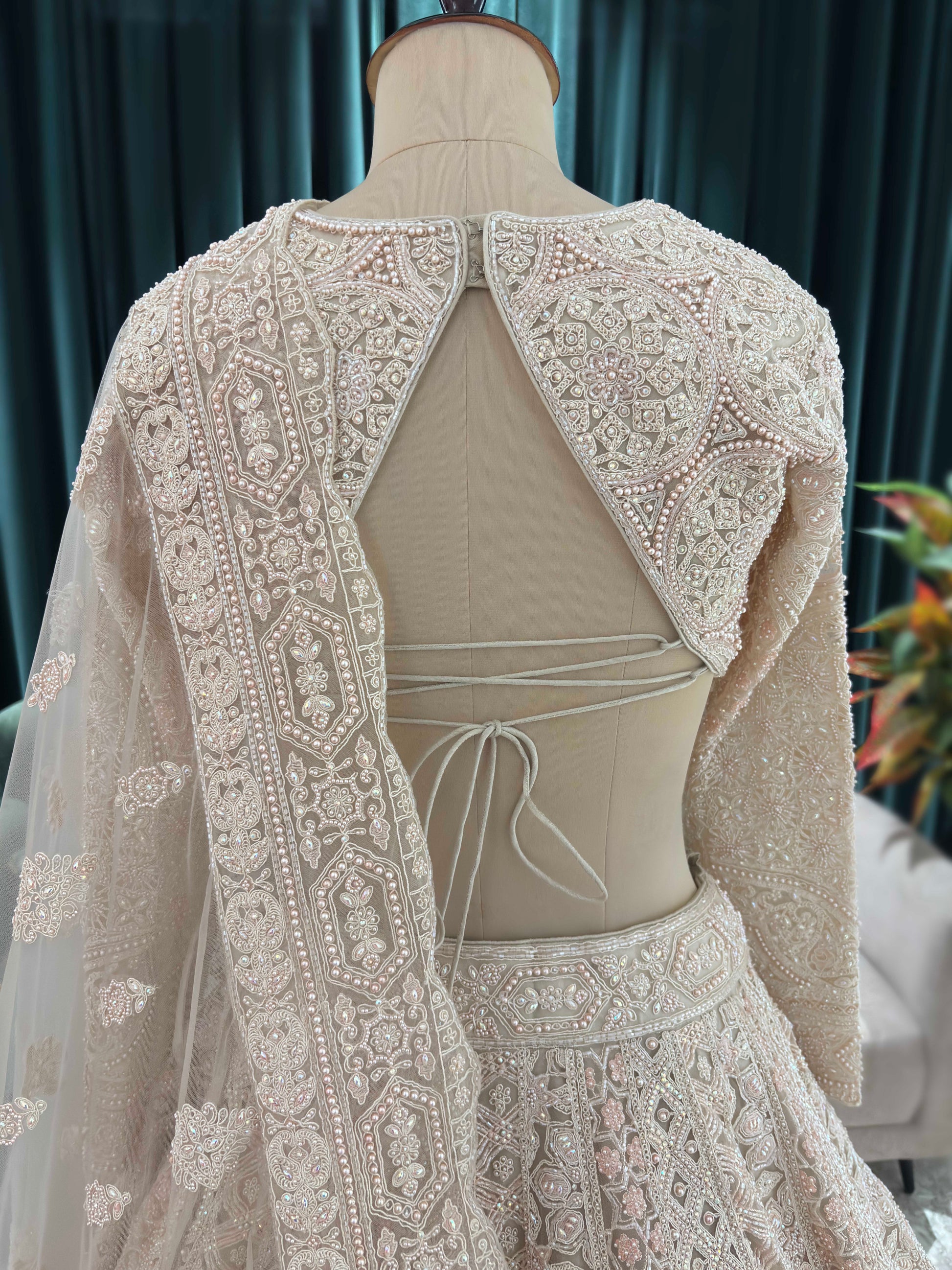 Crafted with exquisite artistry, this lehenga features intricate embroidery on the blouse, complemented by the long skirt adorned with detailed geometric and floral patterns. The dupatta, elegantly draped over one shoulder, enhances the ensemble’s grandeur, making it ideal for special occasions and celebrations. Designed with careful attention to traditional craftsmanship, this lehenga embodies sophistication and timeless elegance
