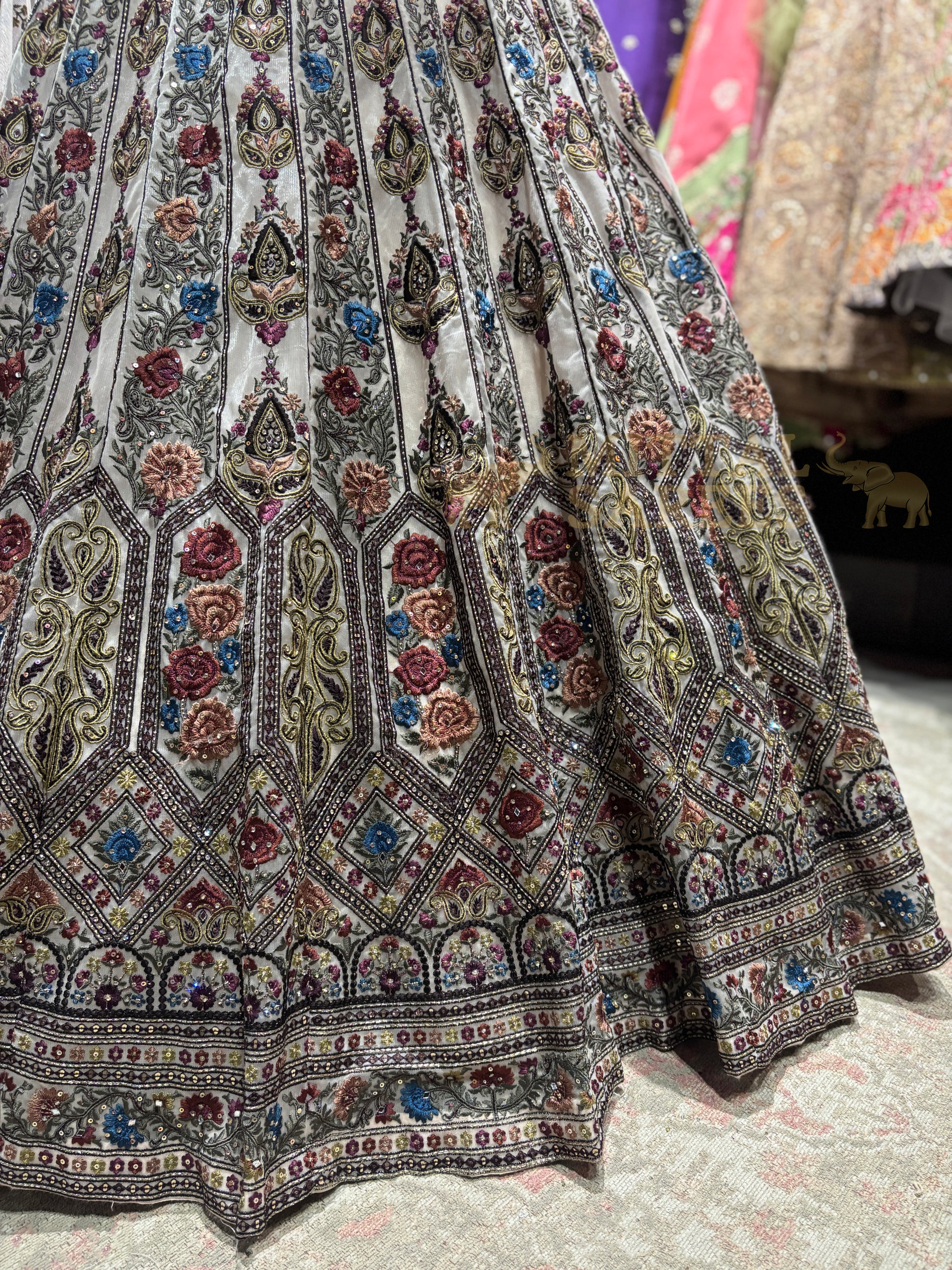 This stunning ivory bridal lehenga is crafted for brides who love detailed artistry and timeless elegance. The skirt showcases intricate multicolour zari and thread embroidery featuring floral and traditional motifs arranged beautifully across the flare. The richly embroidered blouse complements the design with its refined neckline and detailed craftsmanship. Paired with a soft net dupatta highlighted by an ornate border, this lehenga creates a graceful and luxurious bridal appearance. Perfect for weddings, receptions and grand celebrations, it blends tradition with vibrant charm effortlessly.