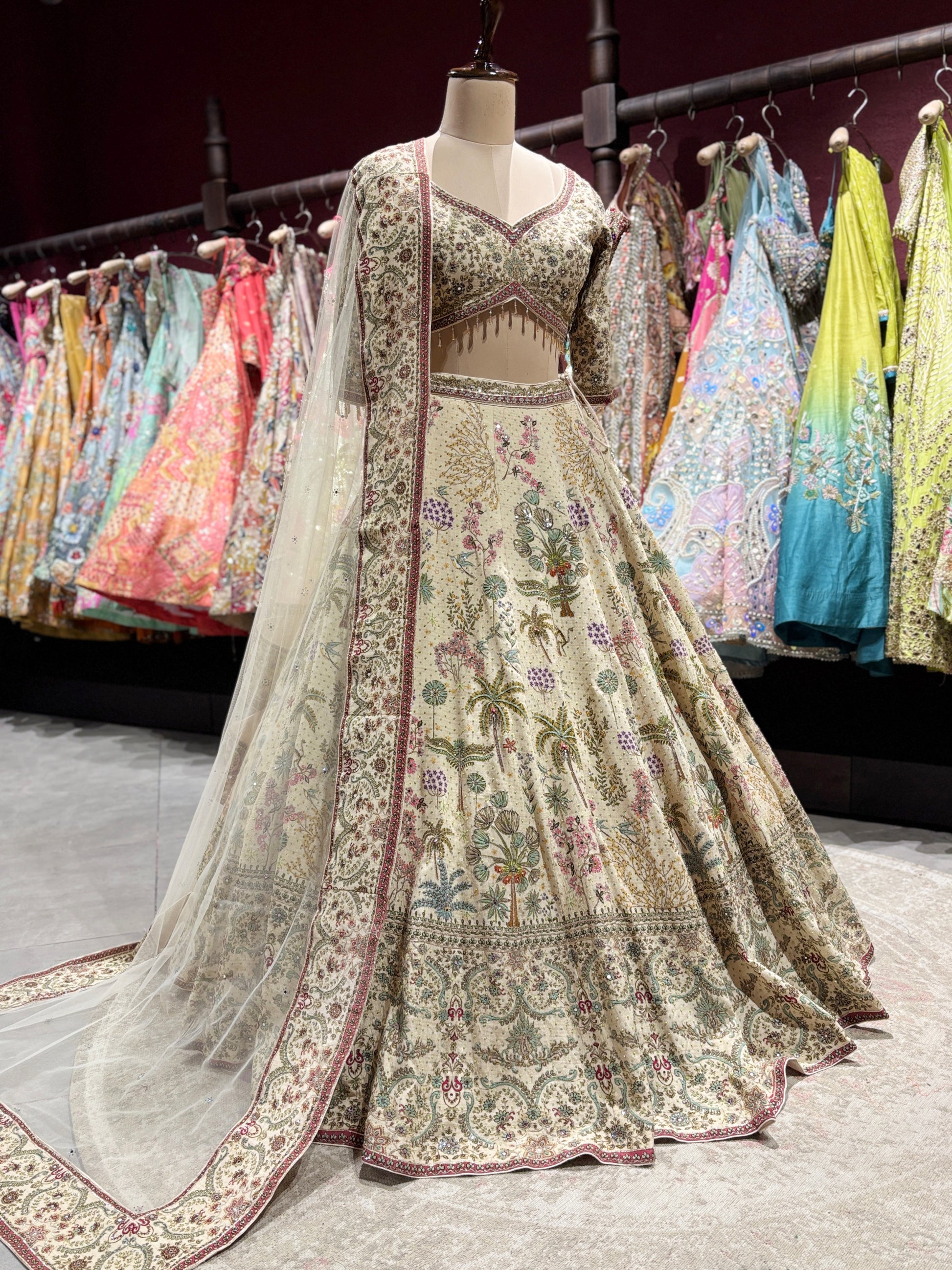 Embrace timeless elegance with this ivory bridal lehenga, beautifully crafted with delicate multi-color embroidery. Designed on a soft ivory base, the lehenga features intricate floral and nature-inspired motifs highlighted with fine thread, zari, and subtle sequin work. The detailed embroidered border adds richness while maintaining a graceful, pastel bridal charm.