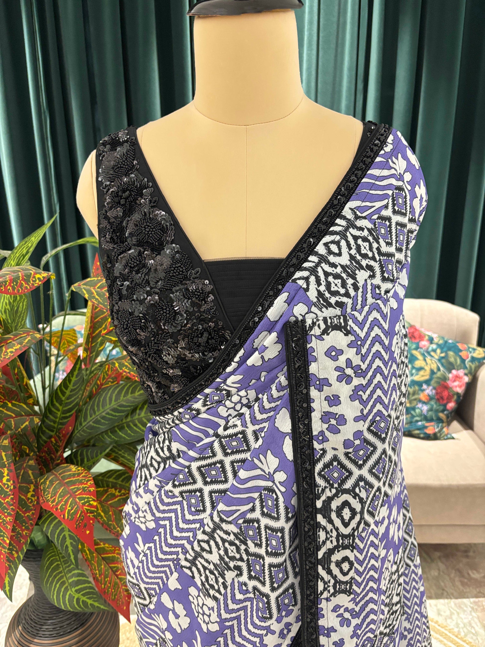 Crafted from lightweight, breathable fabric, it drapes smoothly and ensures all-day comfort, making it ideal for office wear, casual outings, festive gatherings, and daily elegance. The sleek black border adds definition and contrast, while the matching blouse piece completes the look with sophistication.