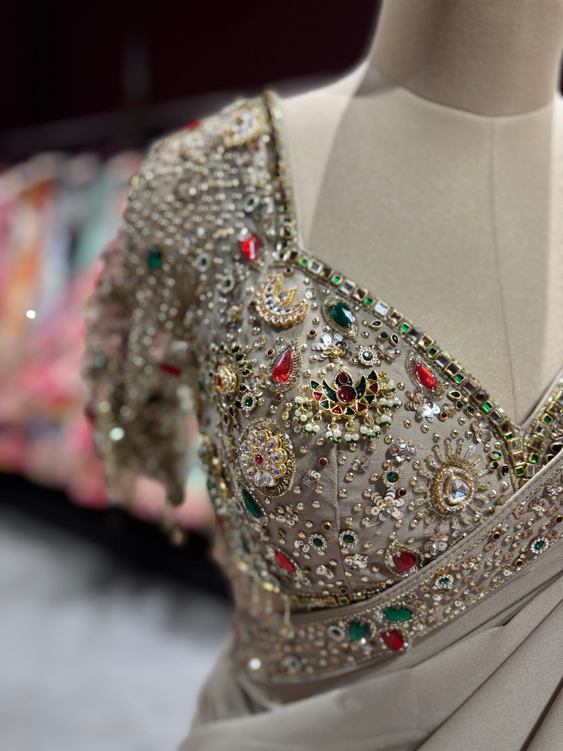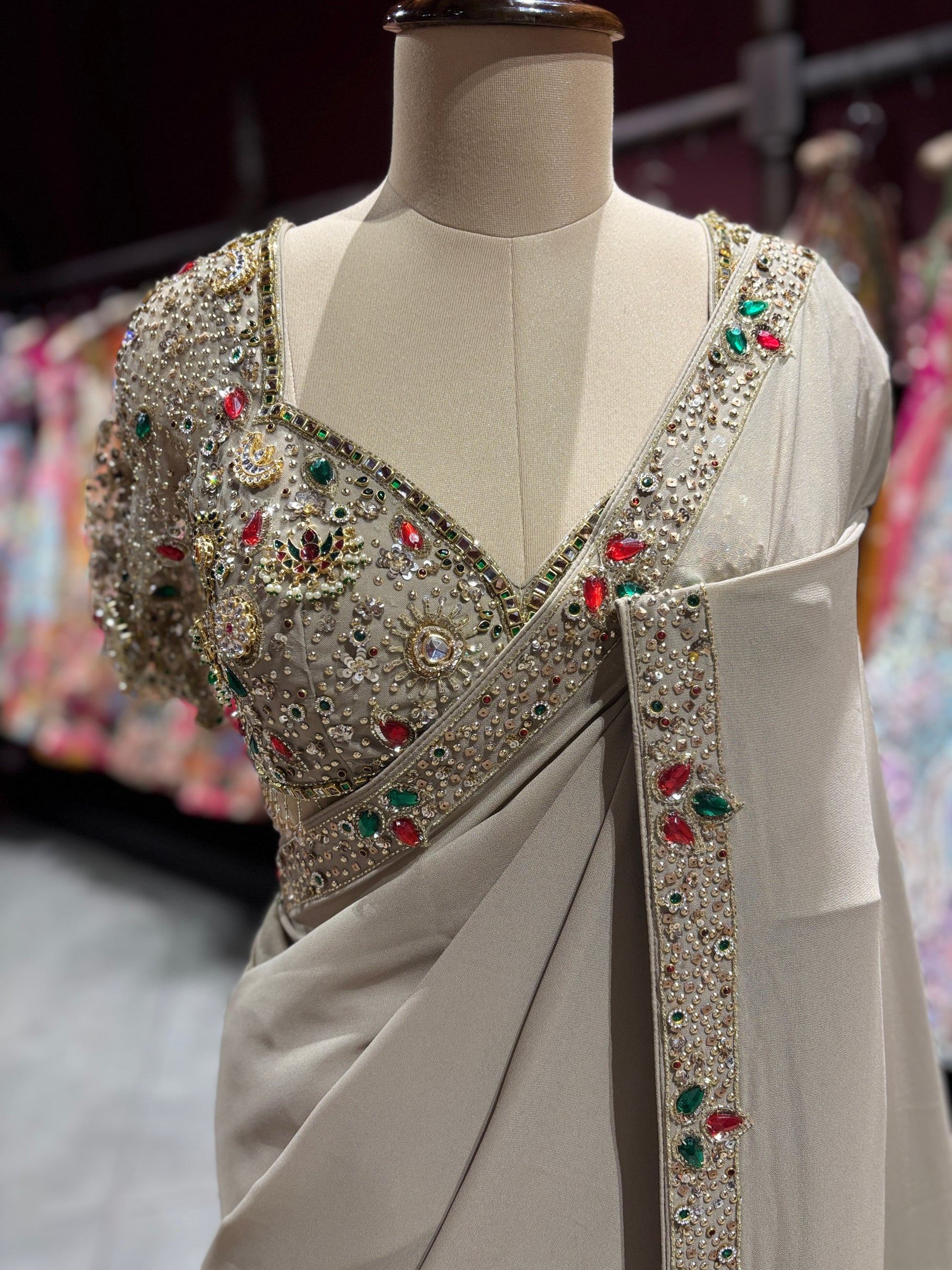Experience understated elegance with this sophisticated beige designer saree crafted in a soft, flowy fabric that drapes beautifully. The minimal base is perfectly complemented by a heavily embellished blouse featuring intricate stone, mirror, and bead work with subtle multicolor accents.