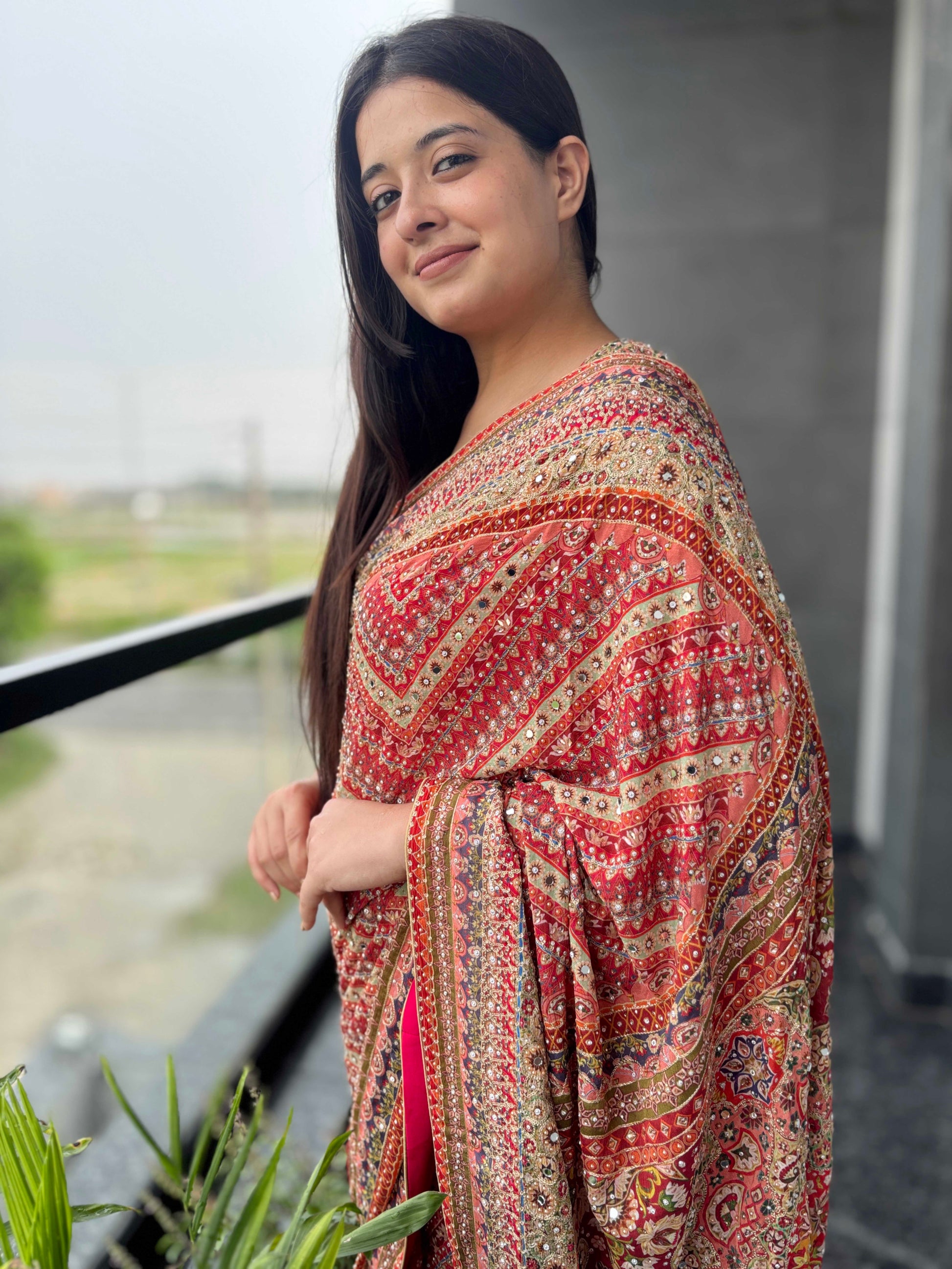 Exude regal elegance with this stunning red designer silk saree, crafted for women who love rich traditional aesthetics. The saree features intricate diagonal and floral-inspired prints, beautifully enhanced with heavy zari weaving and delicate mirror work that adds a luxurious festive sparkle.