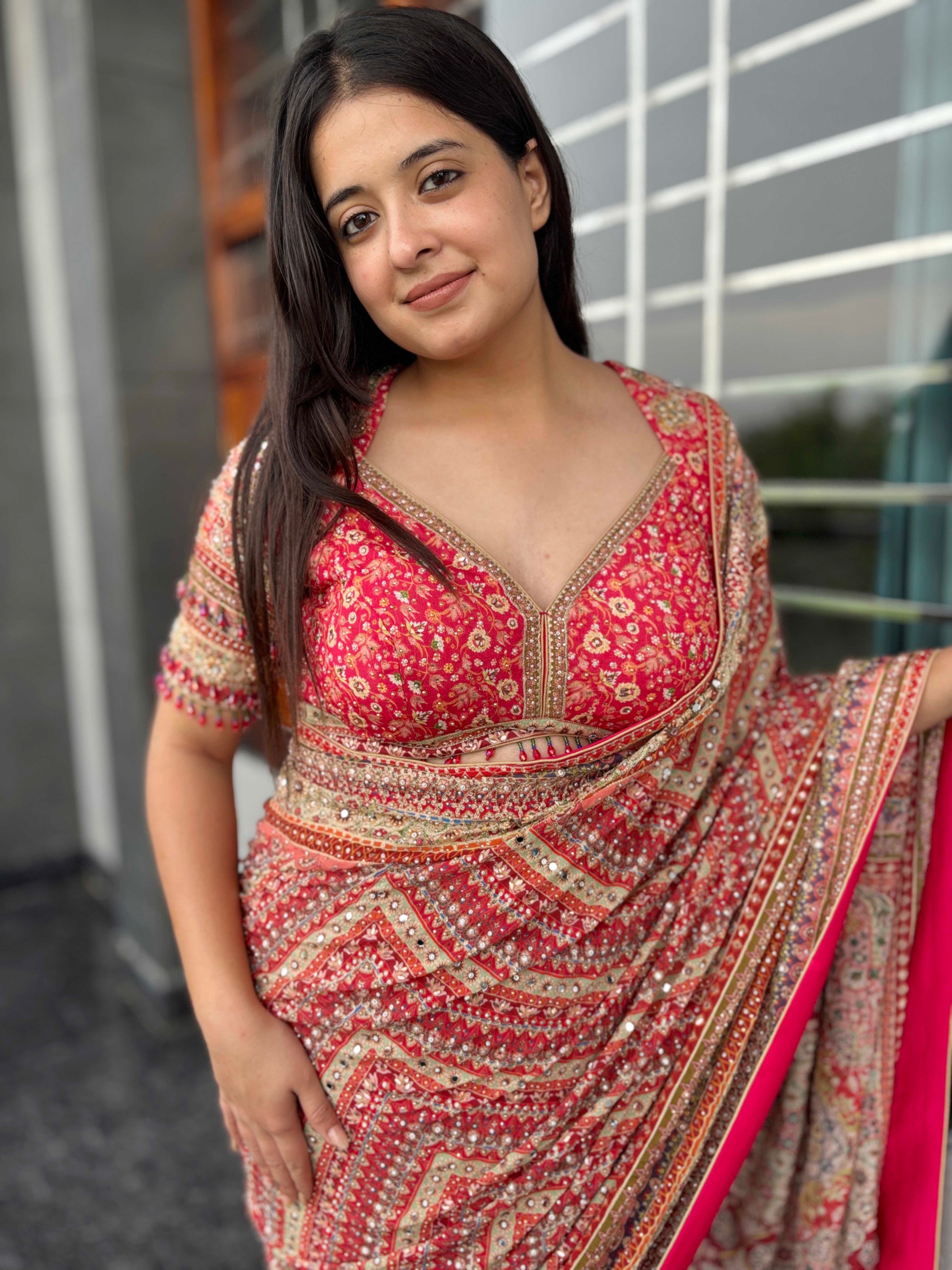 • We have sarees that're comfortable and also look very nice. We have some nice sarees that people like to wear these days like the floral saree and the floral print saree. We also have some options, such as the red georgette saree and the heavy blouse saree that can make you look great for special occasions.