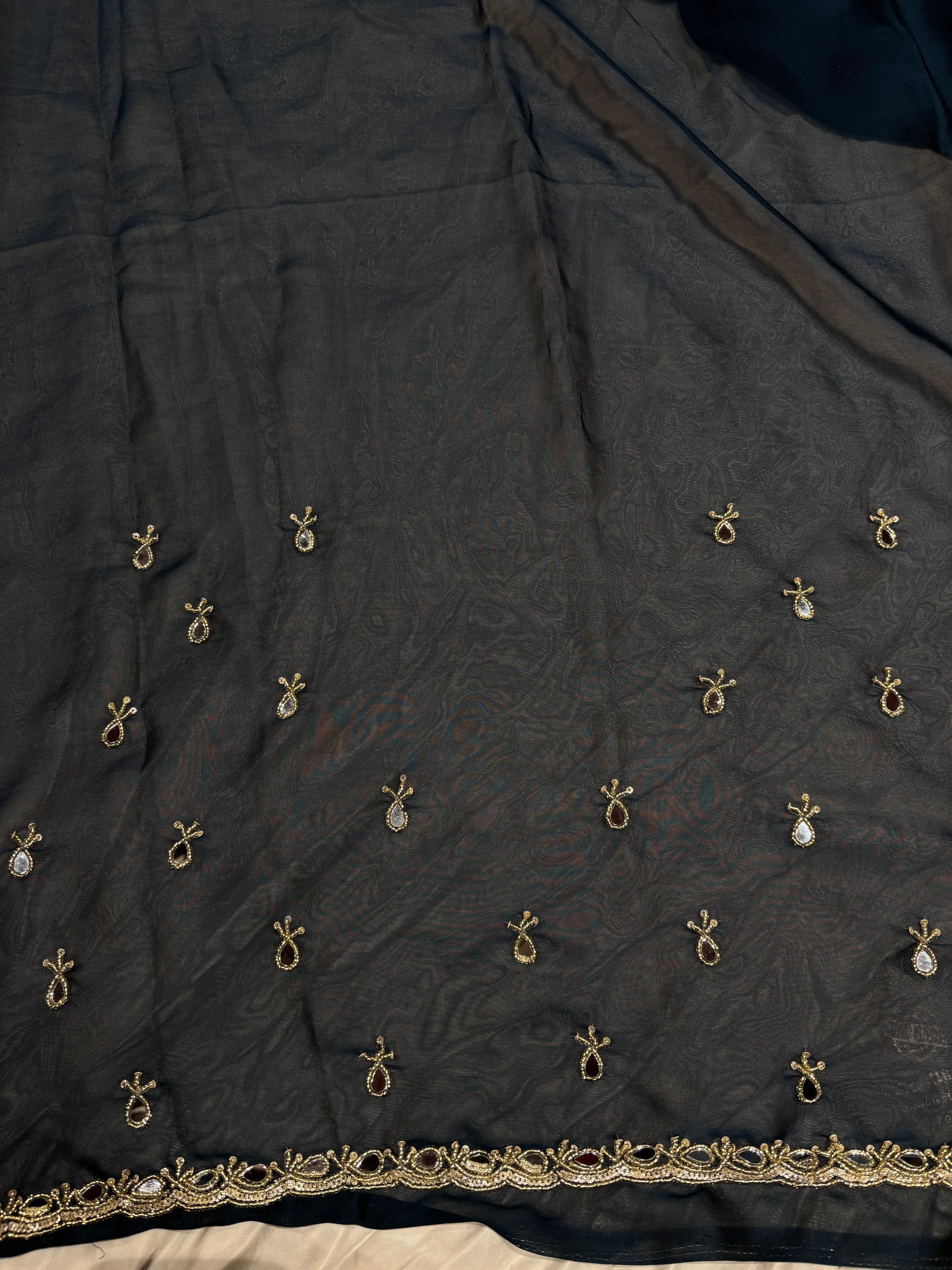 The saree is beautifully enhanced with a handcrafted stone and pearl embroidered border, featuring delicate mirror detailing and intricate beadwork. Subtle embroidered motifs on the body add a refined designer appeal without overpowering the overall look. The shimmering embellishments perfectly complement the deep blue base, creating a luxurious and classy finish.