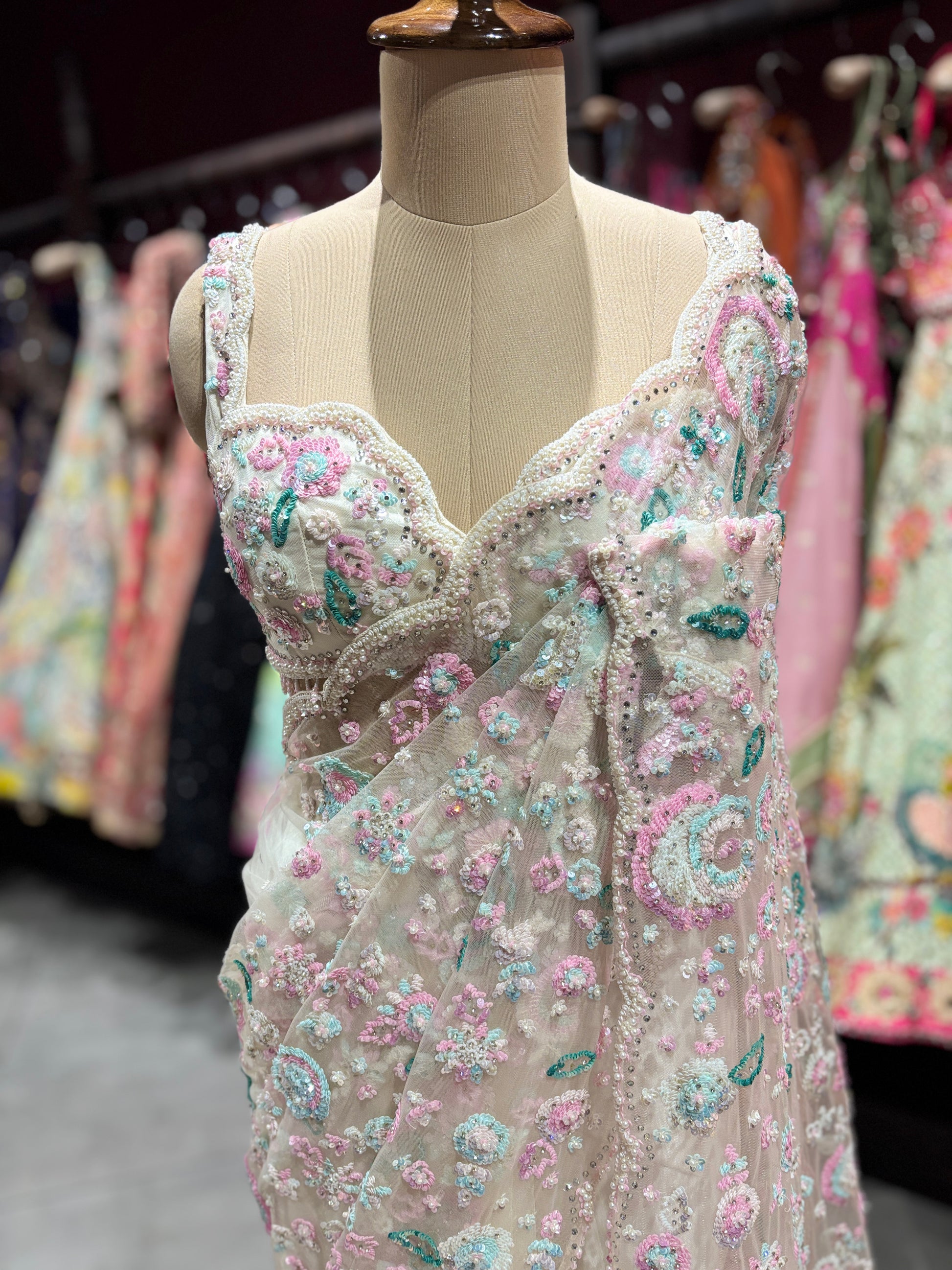 This pastel embroidered saree is a perfect blend of softness, elegance, and modern charm. Crafted in premium net fabric, it features delicate floral embroidery in soothing pastel shades of pink, mint, and ivory, enhanced with subtle sequins for a graceful shimmer. The detailed all-over work and finely finished border give this saree a luxurious yet lightweight feel.