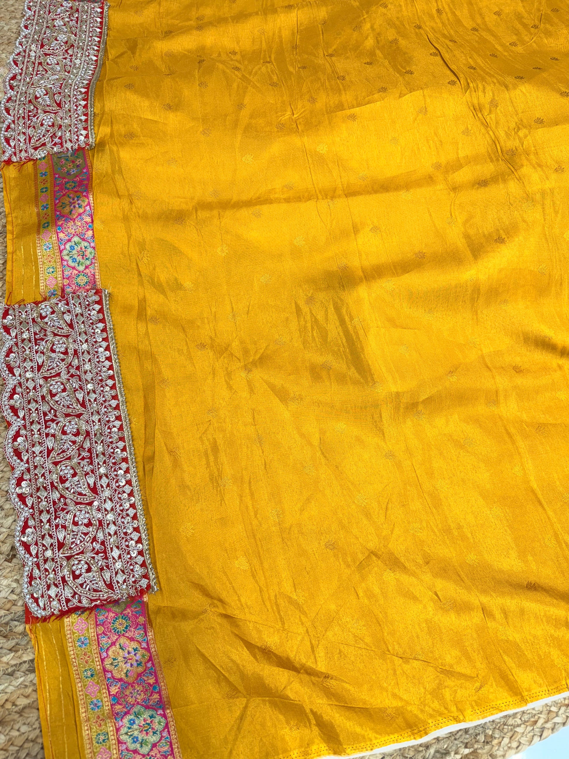 This royal yellow Banarasi saree radiates elegance, joy, and festive warmth. Designed with intricate floral weaving throughout the fabric, it beautifully represents traditional Indian artistry. The richly embroidered border adds depth and opulence, making it stand out in any celebration. The bright yellow hue symbolizes happiness and prosperity, making it an ideal pick for haldi ceremonies, weddings, and festive gatherings. Lightweight yet luxurious, this saree ensures graceful draping and timeless appeal for women who love classic ethnic fashion.