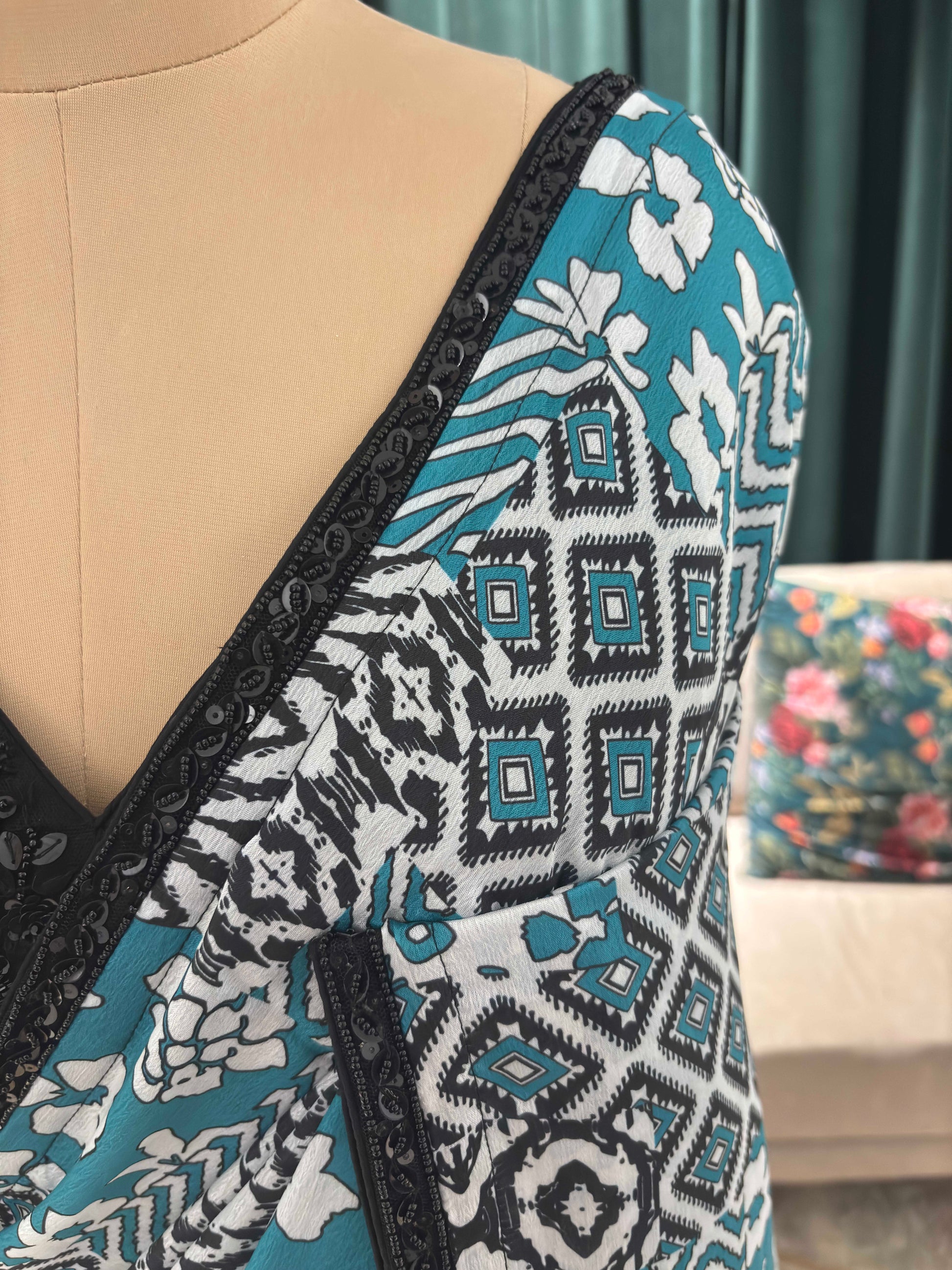 Add effortless charm to your everyday style with this elegant teal ikat print saree. Designed with a beautiful mix of traditional geometric and floral patterns in teal, white, and black tones, this saree offers a perfect balance of modern and ethnic appeal. The sleek black border enhances the overall look, giving it a clean and classy finish.