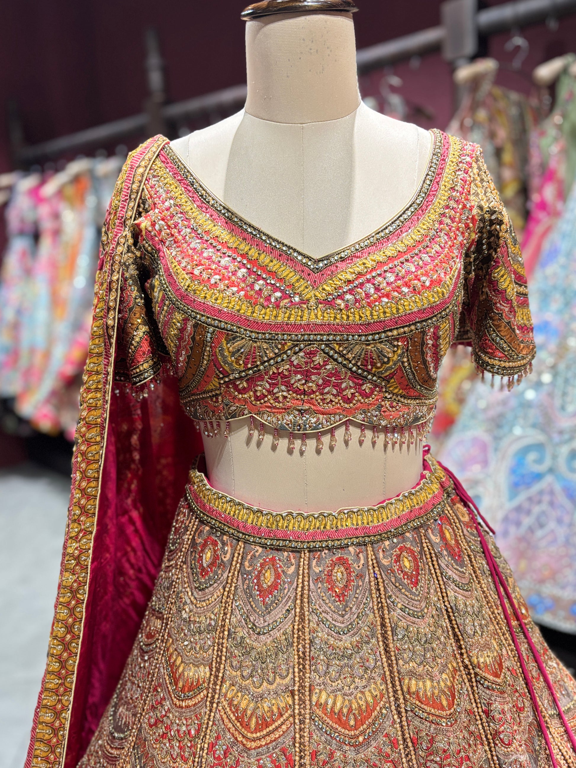 Perfect for weddings, receptions, and traditional ceremonies, this lehenga is ideal for brides who love vintage hues blended with detailed artistry. Style it with traditional gold jewelry to create a powerful and unforgettable bridal presence.