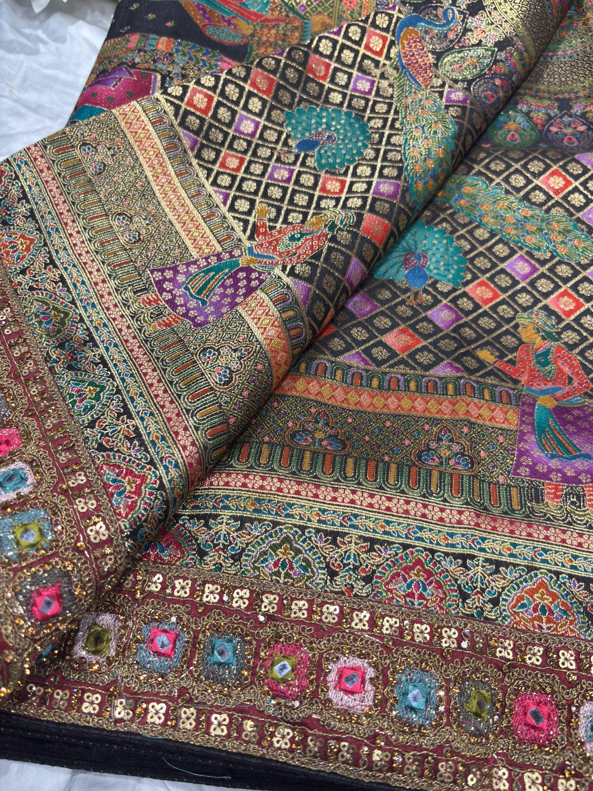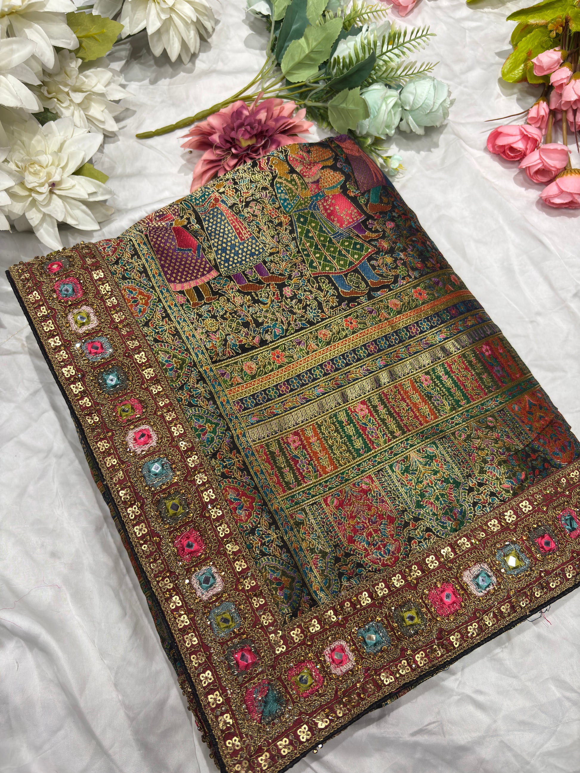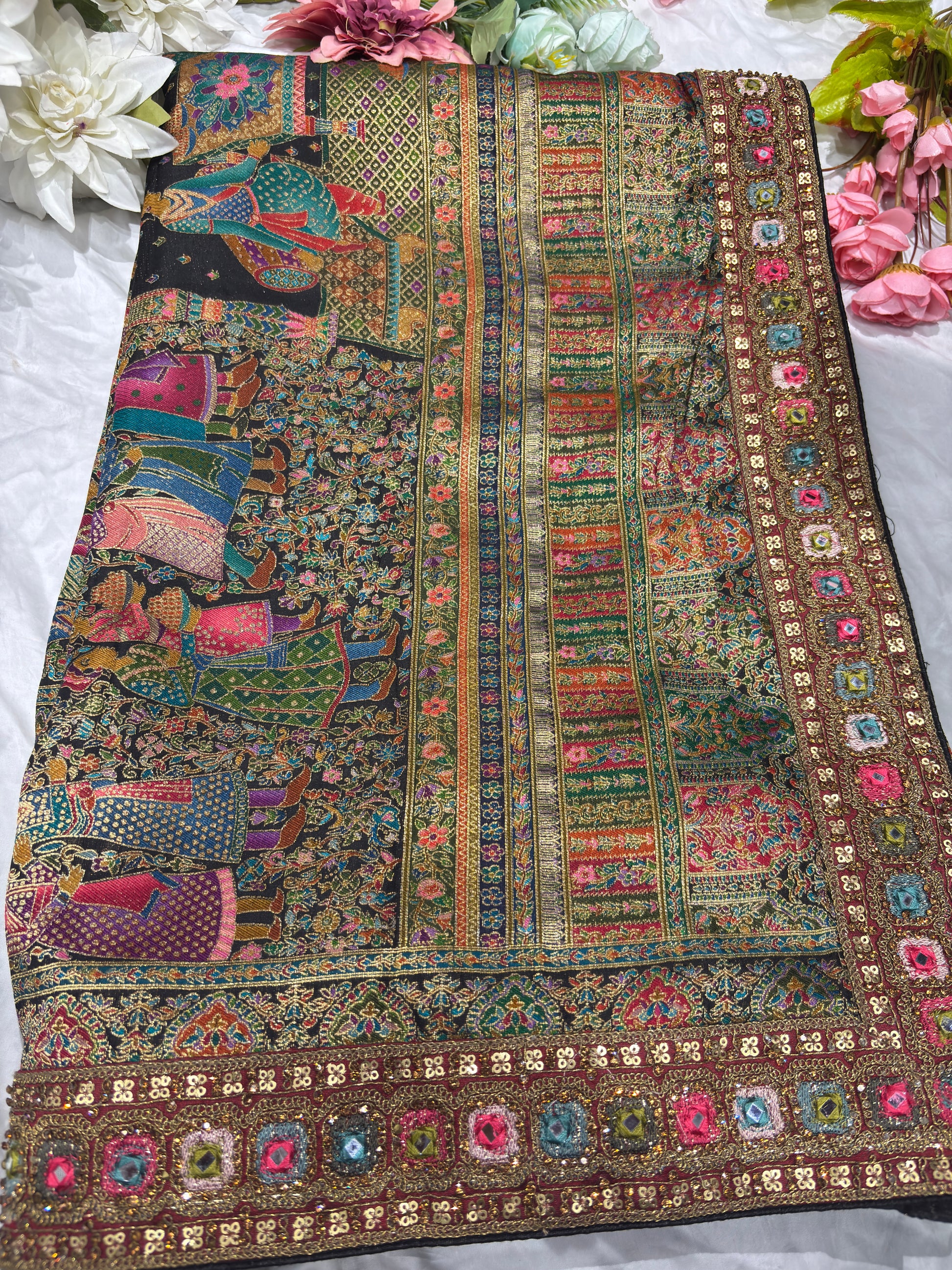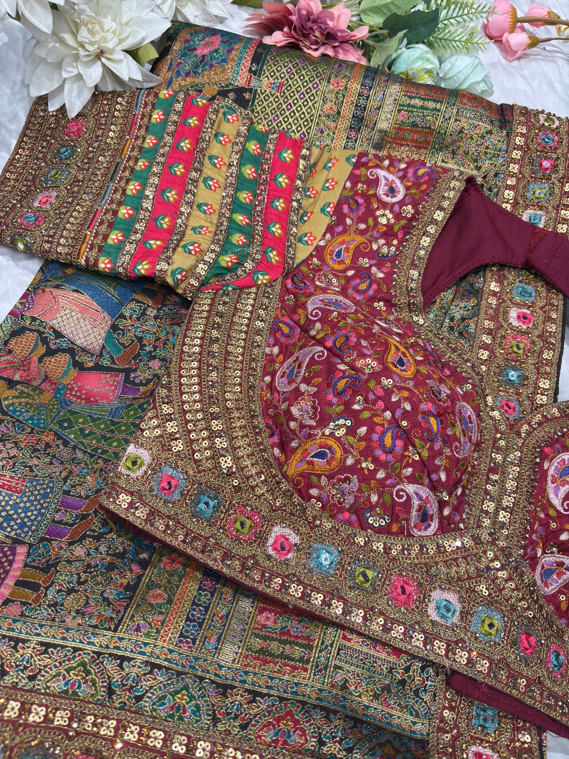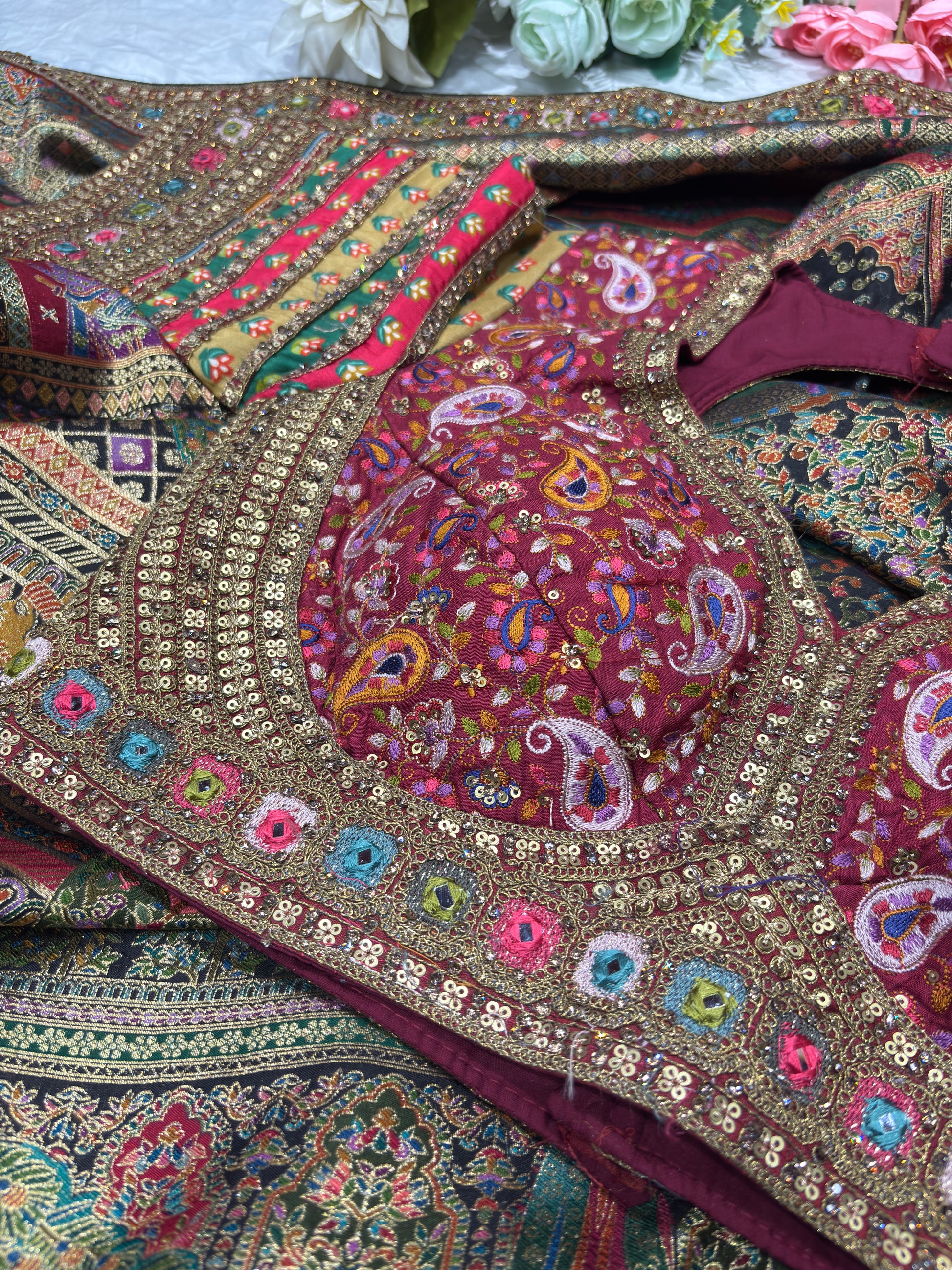 Make a royal statement with this exquisite maroon Banarasi silk saree, beautifully crafted with intricate traditional weaving and rich multicolor patterns. The saree features a luxurious zari border adorned with vibrant detailing, giving it a regal and festive appeal. Paired with a heavily embroidered designer blouse showcasing elegant paisley motifs, fine threadwork, and mirror embellishments, this ensemble is perfect for weddings, festive celebrations, and special occasions. A perfect blend of tradition and modern elegance, designed to stand out.