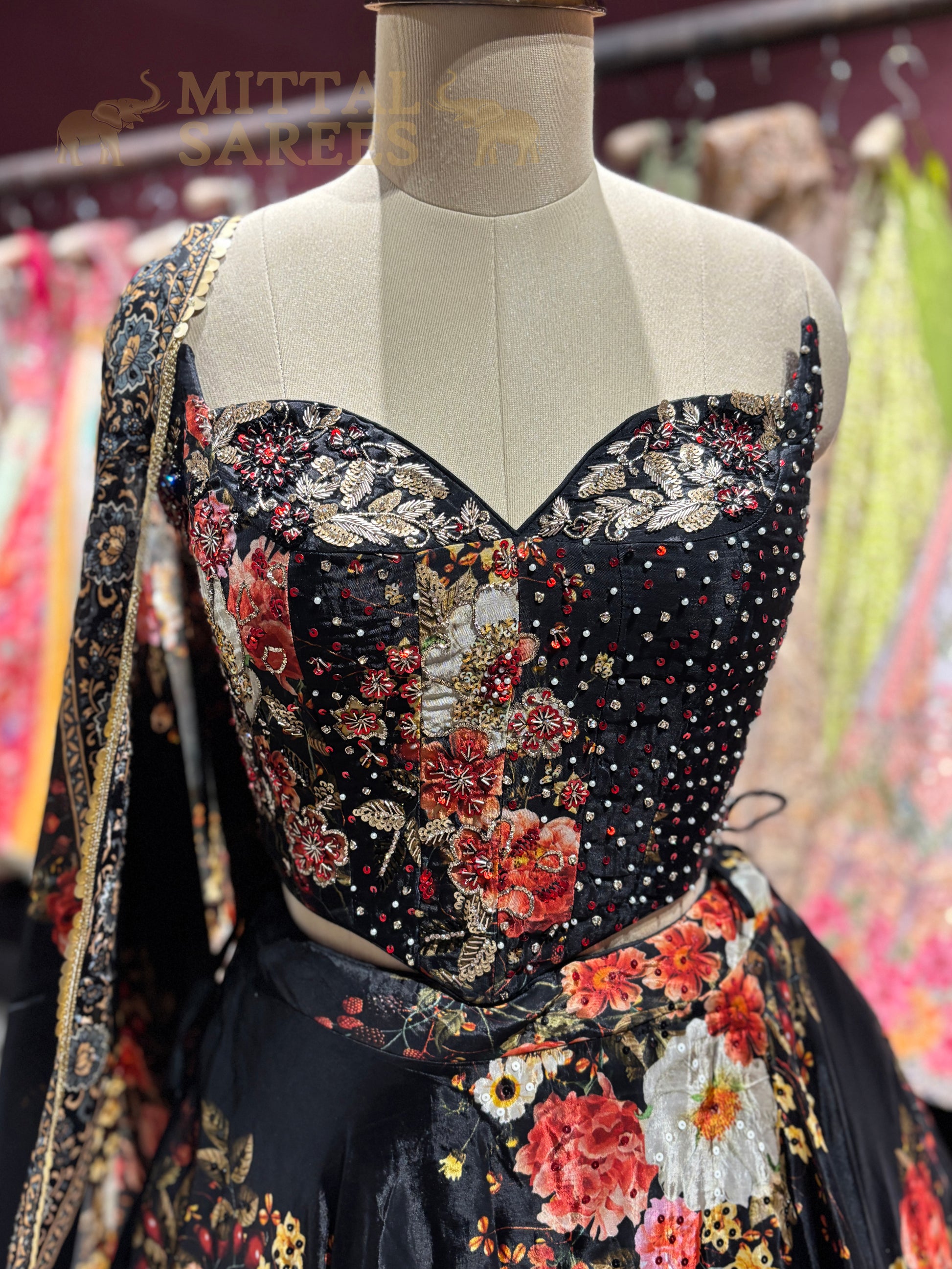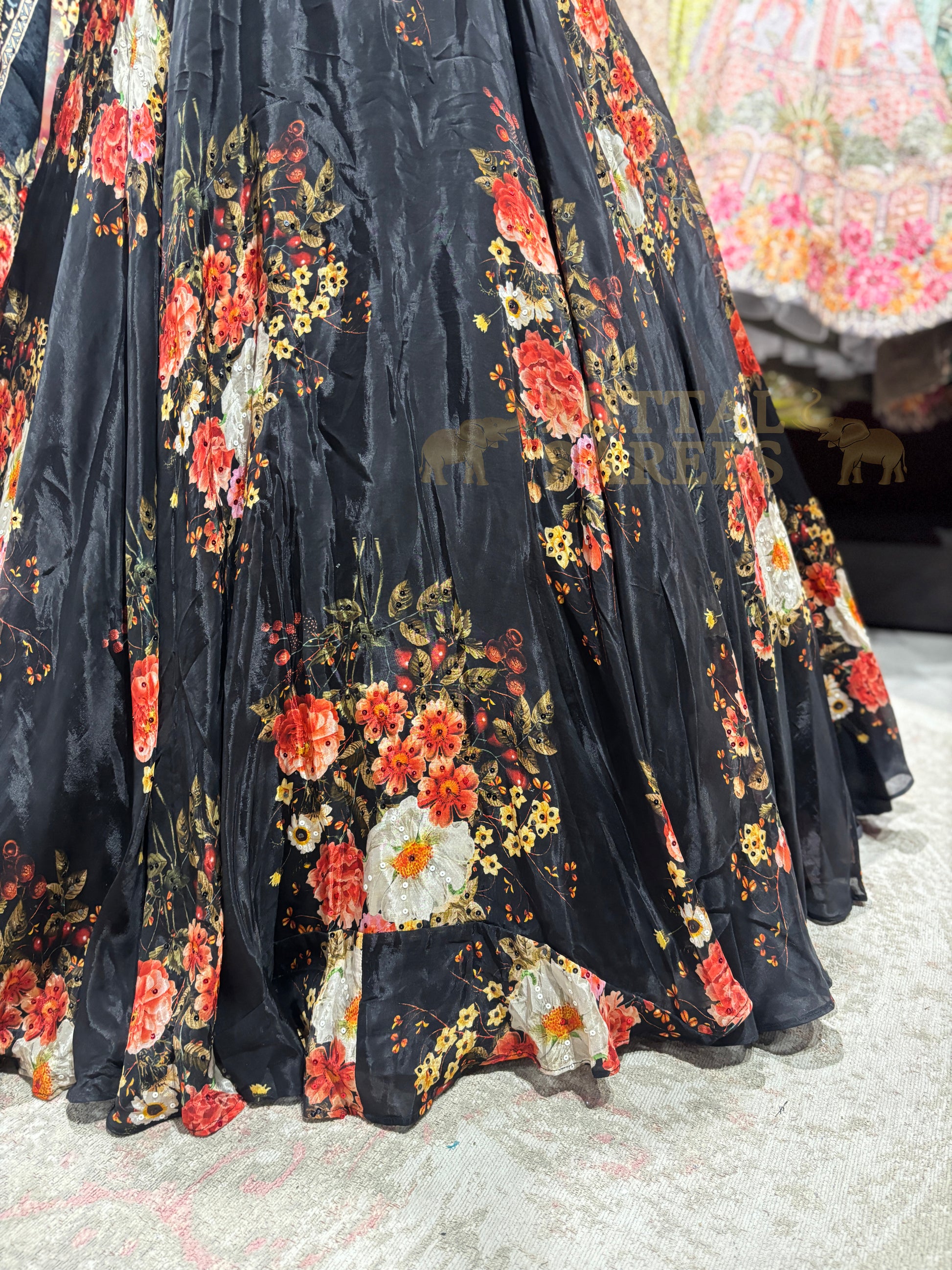 This elegant black lehenga is designed for those who love bold florals with glamorous detailing. The flowing skirt features vibrant red, peach and ivory floral prints that stand out beautifully against the rich black base. The fitted blouse is adorned with intricate embellishments and delicate embroidery, adding sparkle and sophistication to the look. Paired with a coordinated dupatta finished with an ornate border, this lehenga is perfect for receptions, cocktail nights and festive occasions, offering a perfect blend of modern charm and timeless elegance.