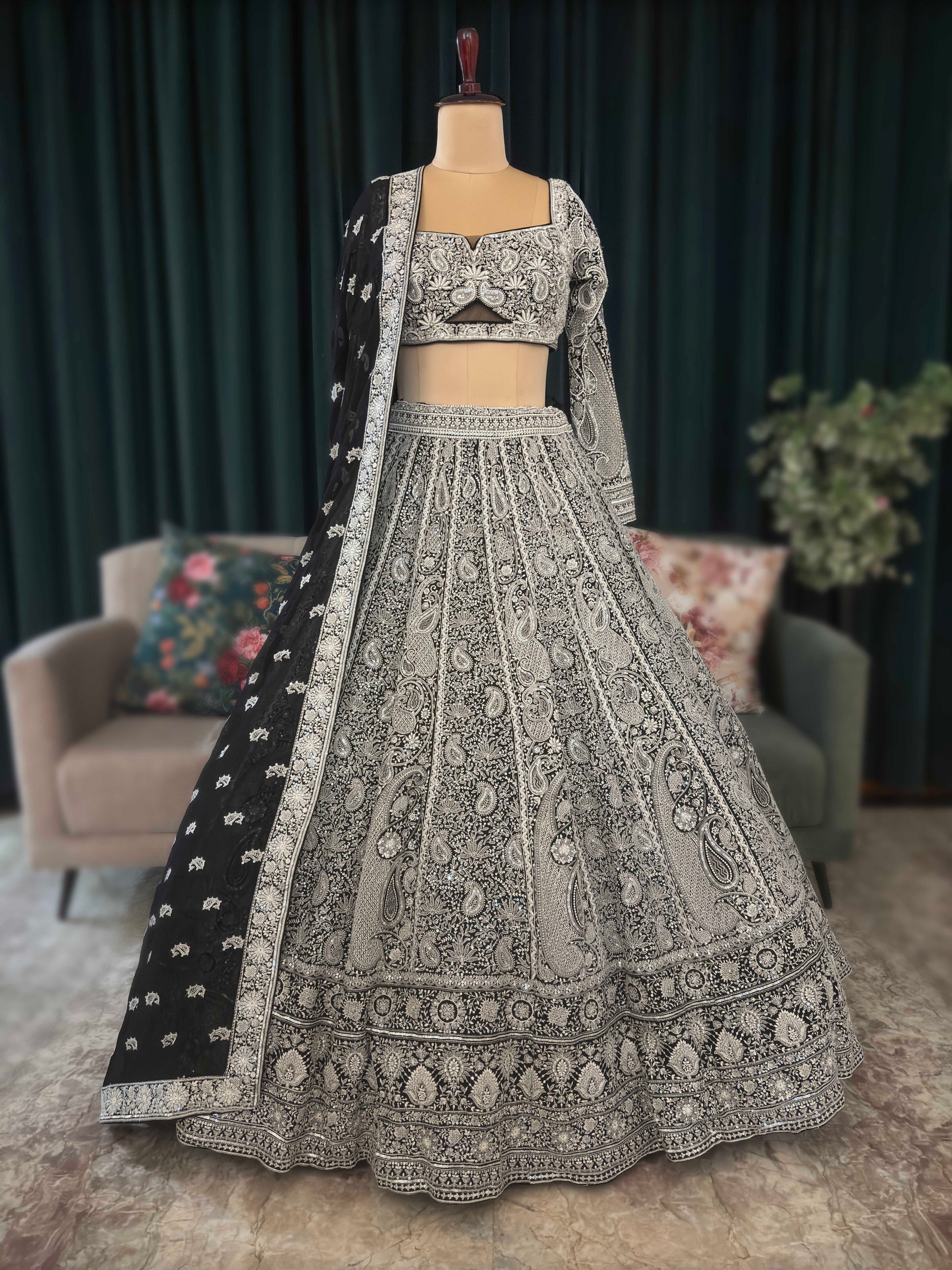 Make a bold yet elegant statement with this exquisite black and silver non-bridal lehenga, crafted for modern celebrations with a touch of regal charm. The lehenga features intricate all-over paisley and floral embroidery, highlighted with fine silver thread and sequin work that creates a rich, luminous effect against the deep black base.