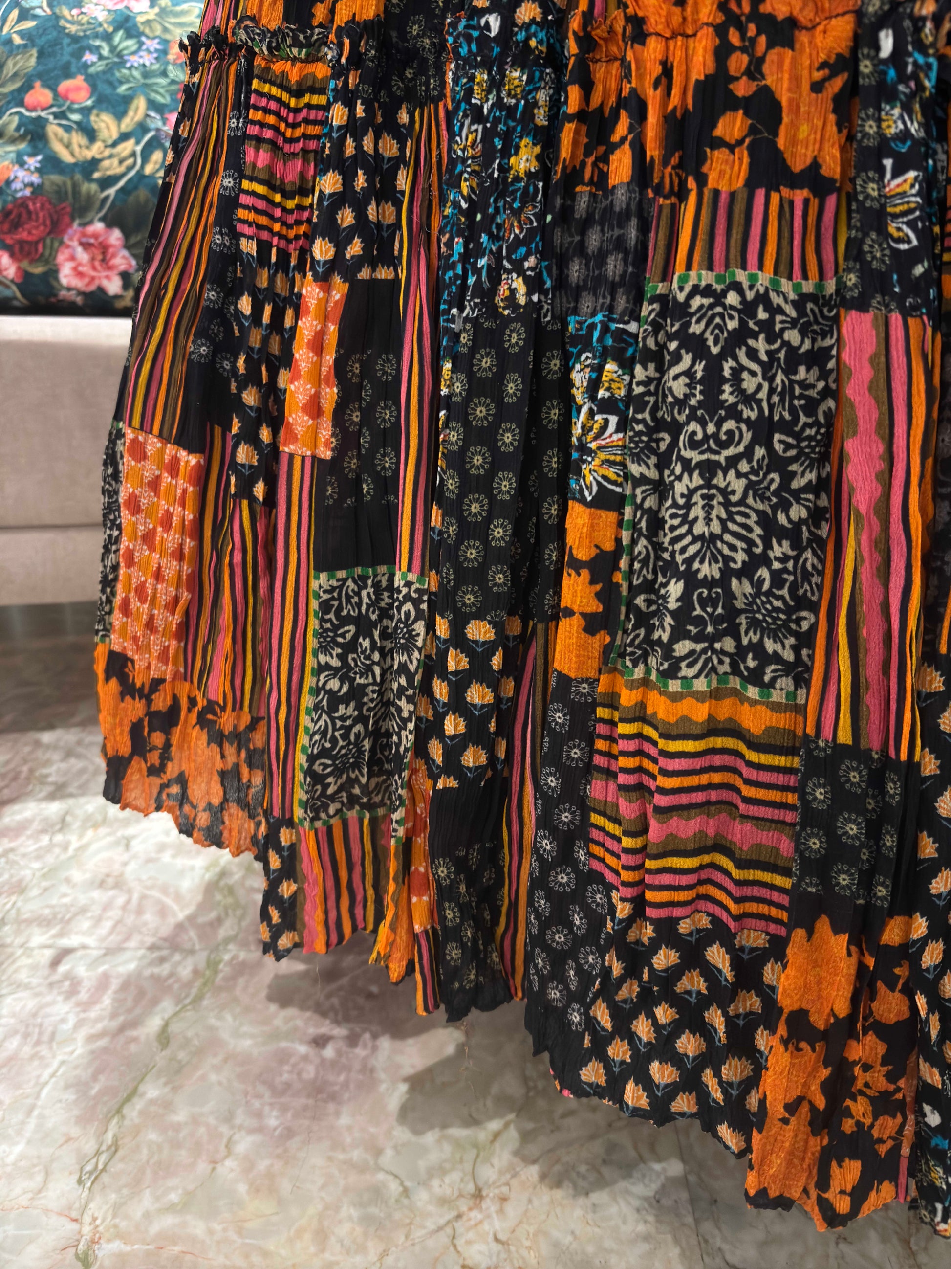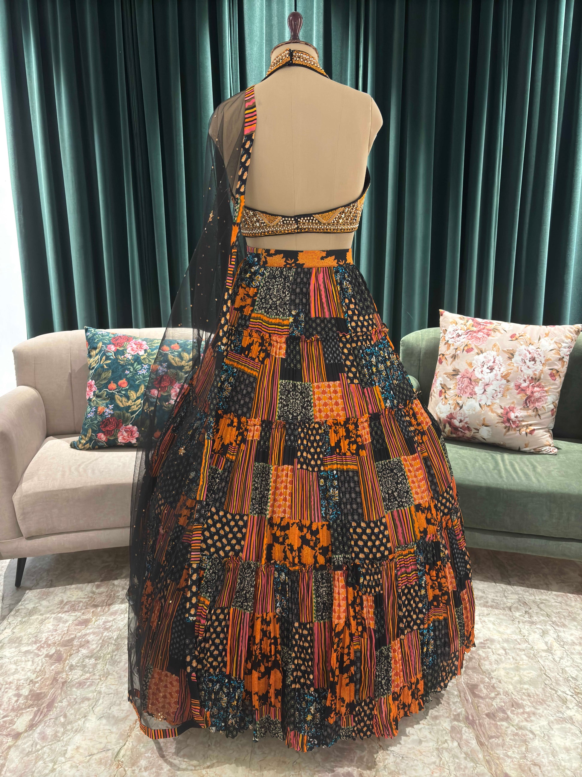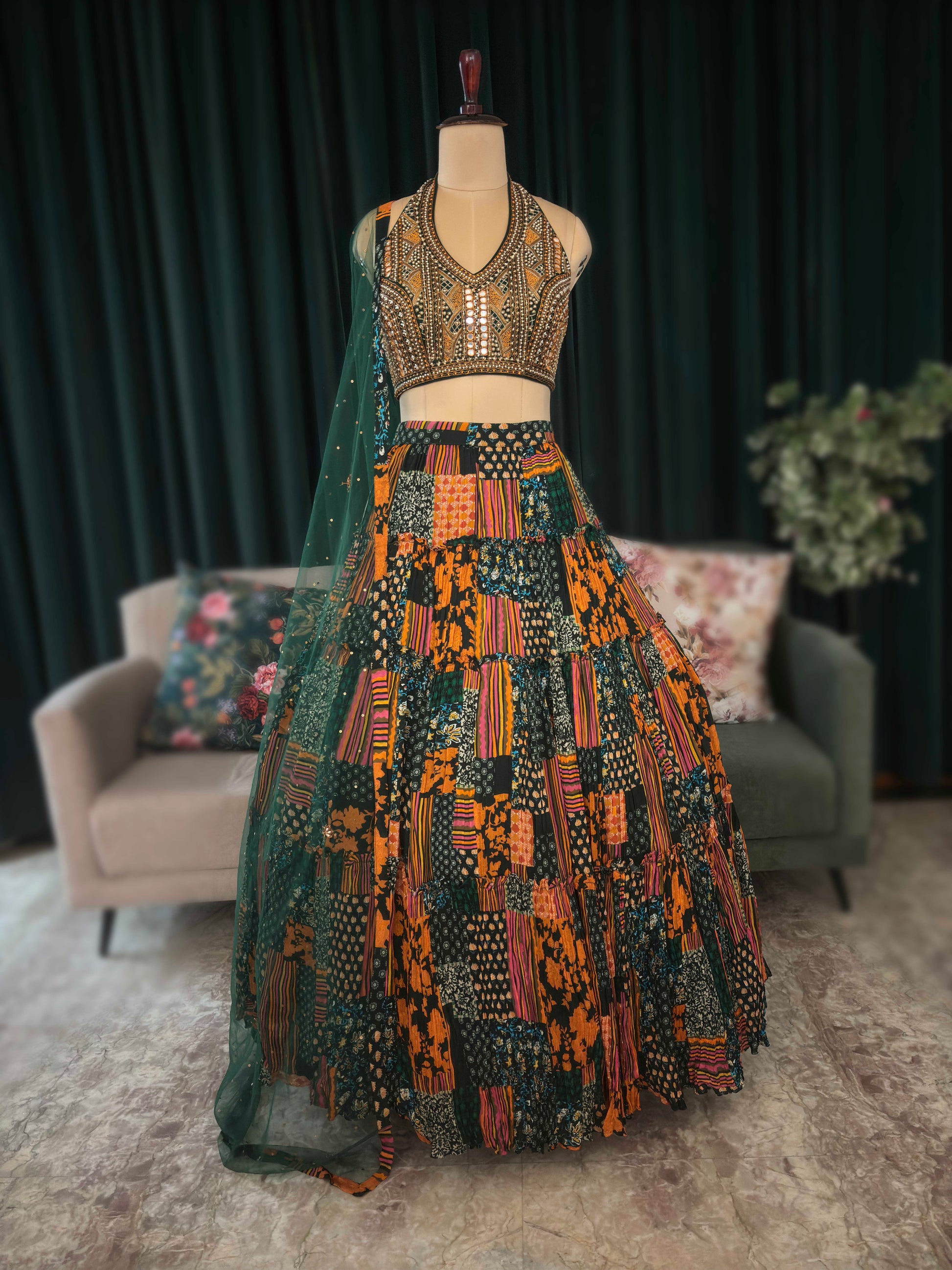 This black patchwork lehenga choli showcases rich multicolor prints paired with a heavily mirror embroidered blouse. Finished with a contrasting green net dupatta, it creates a striking festive look for weddings and special occasions.