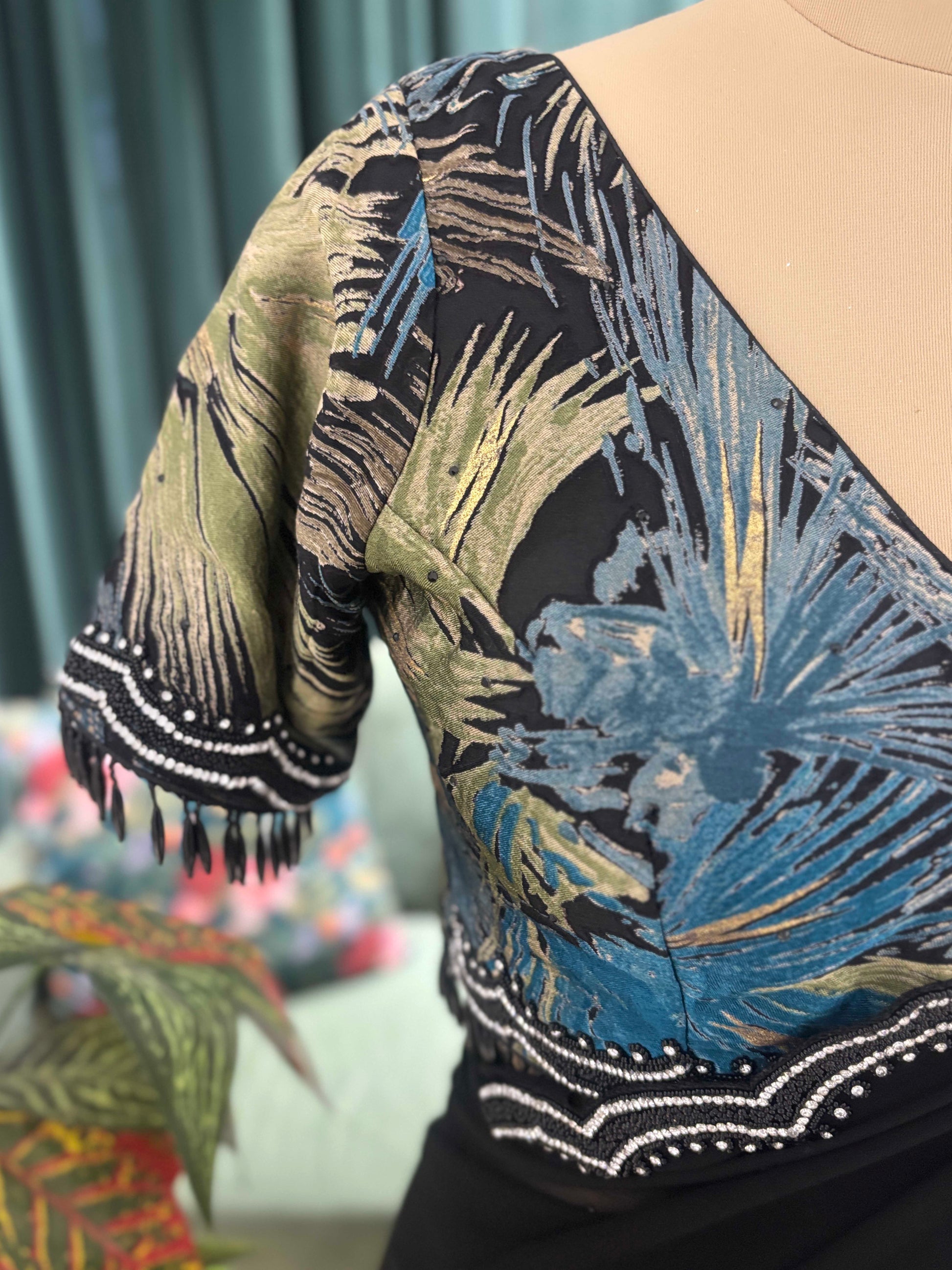 The saree is paired with a stylish printed blouse featuring artistic leaf-inspired patterns and subtle fringe detailing on the sleeves, bringing a contemporary contrast to the classic black base. Tiny scattered embellishments across the saree add a soft shimmer, making it perfect for evening wear.
