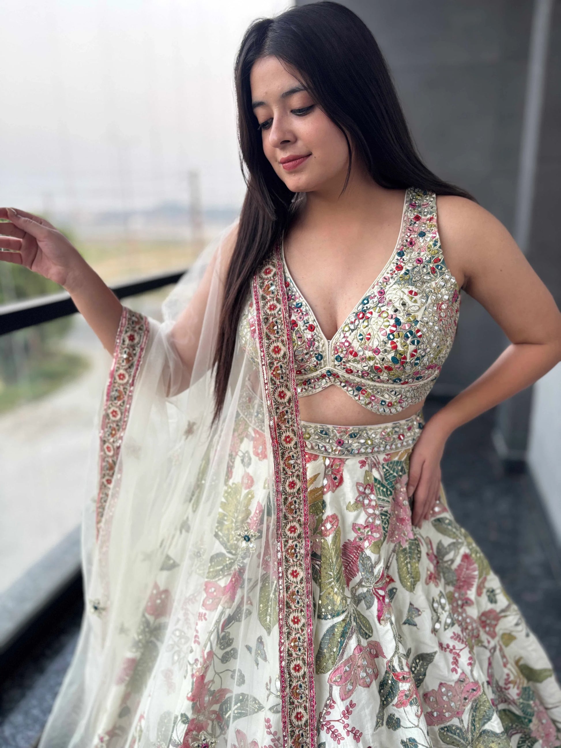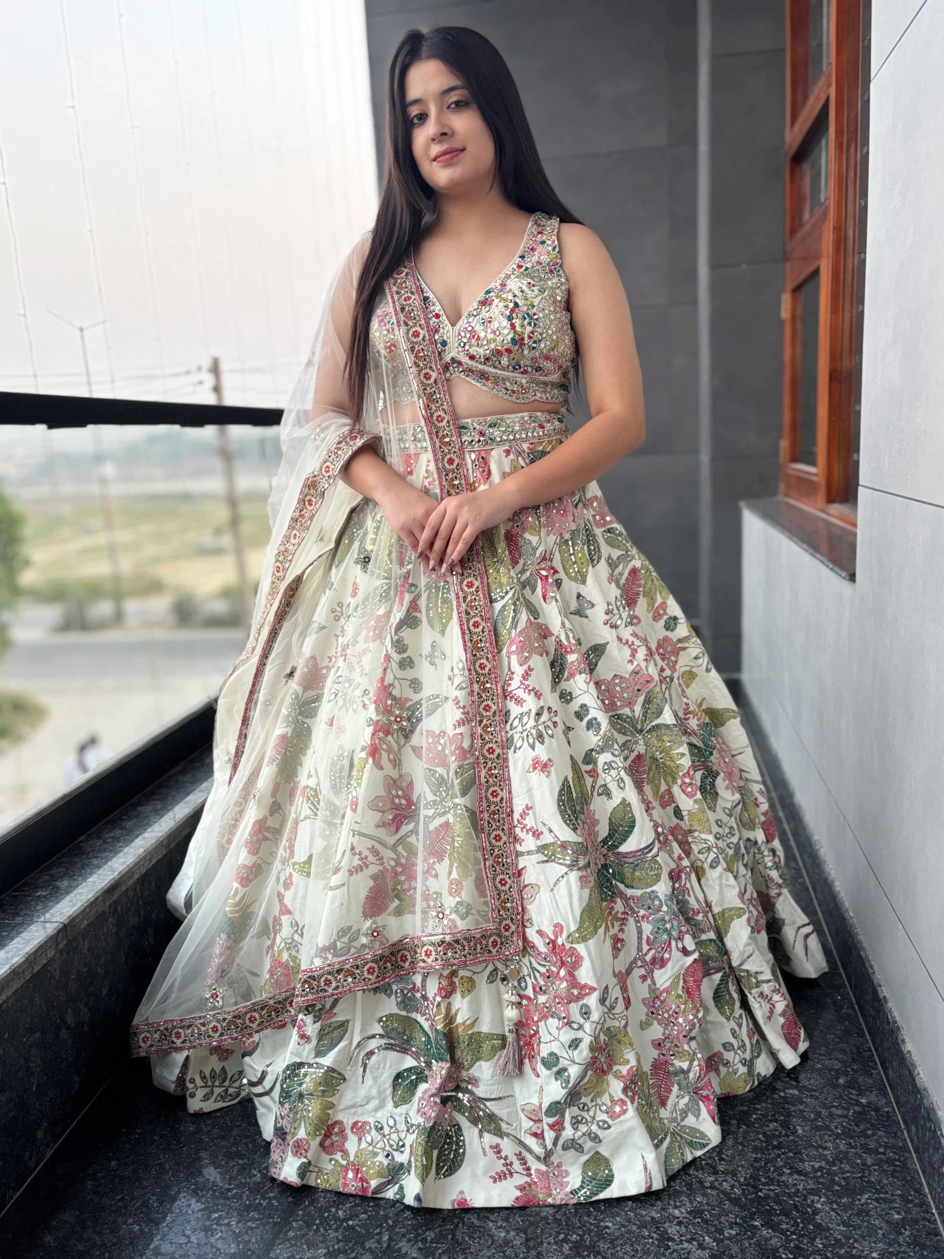 Elevate your bridal elegance with this exquisite silk off-white lehenga, a timeless masterpiece crafted for the modern bride who cherishes tradition. Intricately adorned with zari, sequins, mirror, and multi-thread embroidery, this ensemble radiates regal charm and artisanal finesse. The delicate shimmer of mirror work paired with the richness of thread detailing creates a harmonious blend of heritage and haute couture—perfect for your grand celebration. Whether you're seeking a Reception Lehenga that turns heads, a Bridal lehenga for reception that captures your story, or a Designer reception lehenga that speaks luxury, this piece delivers unmatched sophistication. Its graceful silhouette and luminous embellishments make it an ideal Lehenga for wedding reception, promising elegance in every frame.
