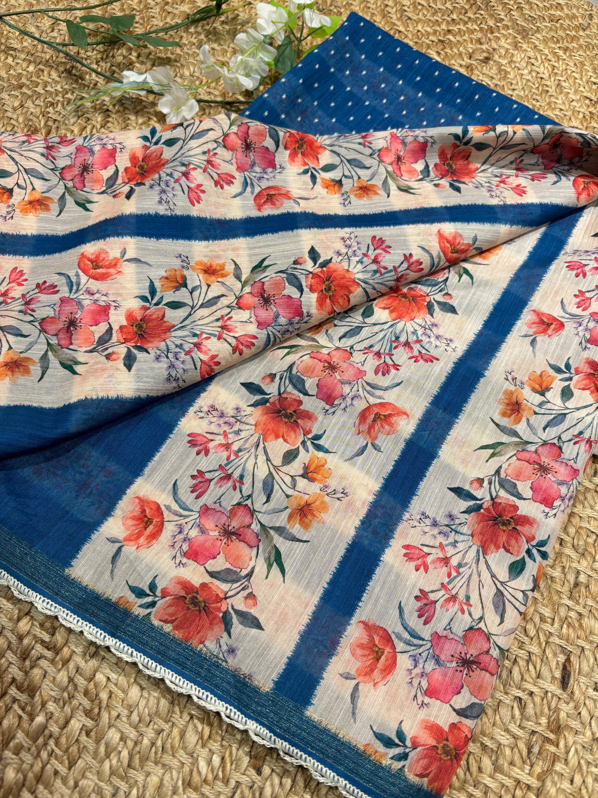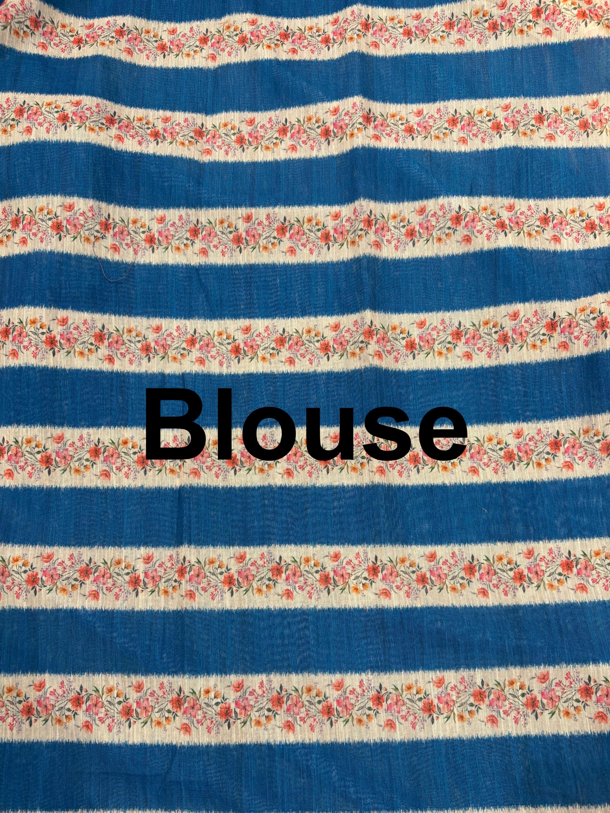 Add a touch of effortless elegance to your everyday wardrobe with this blue floral printed cotton saree. Crafted from breathable cotton fabric, this saree features a beautiful combination of delicate floral prints and a classic ikat-inspired dotted pattern. The contrasting floral panel enhances the overall look, while the subtle border gives it a refined and graceful finish.
