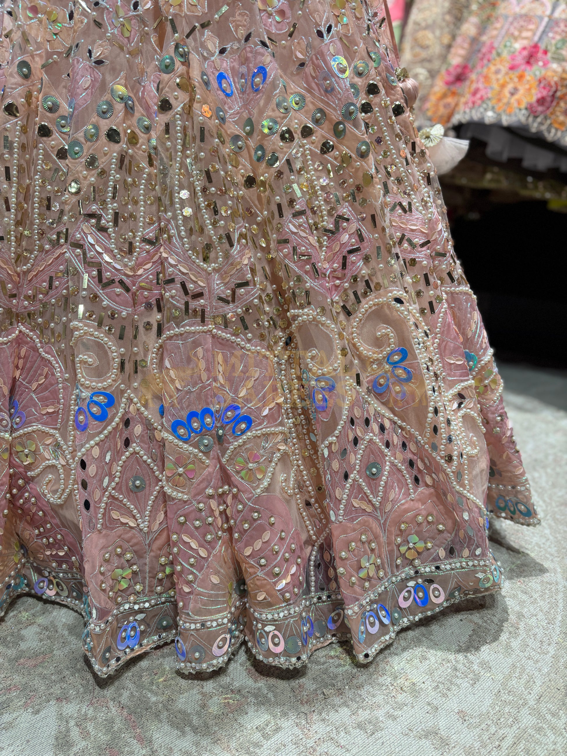 This beautiful blush pink bridal lehenga is designed for brides who love soft pastel shades with vibrant detailing. The flared skirt is adorned with intricate mirror work, delicate thread embroidery and colourful floral motifs that create a stunning visual appeal. The stylish blouse features heavy embellishment with coordinated mirror and bead work, adding sparkle and glamour. Paired with a matching sheer dupatta finished with subtle embroidered accents, this lehenga is ideal for weddings, receptions and grand celebrations, blending contemporary charm with traditional craftsmanship beautifully.