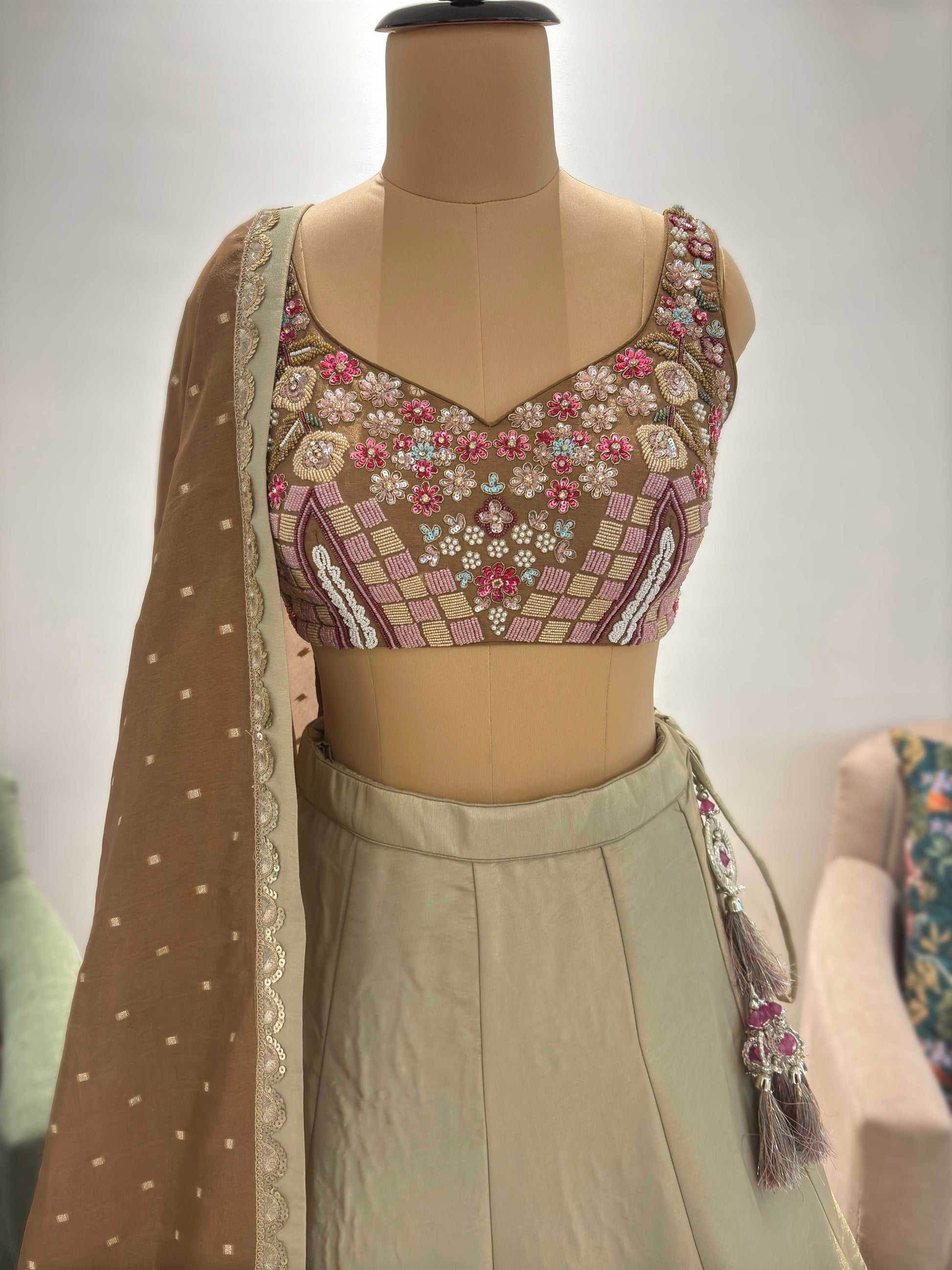 This exquisite lehenga is a perfect blend of elegance and tradition. Featuring intricate embroidery on the blouse, a beautifully embellished long skirt, and a delicately draped dupatta, it is designed to make a statement at any special occasion. The craftsmanship highlights detailed patterns and embellishments, showcasing a timeless appeal. Ideal for weddings, festive celebrations, or grand events, this lehenga is a standout piece that embodies sophistication and charm