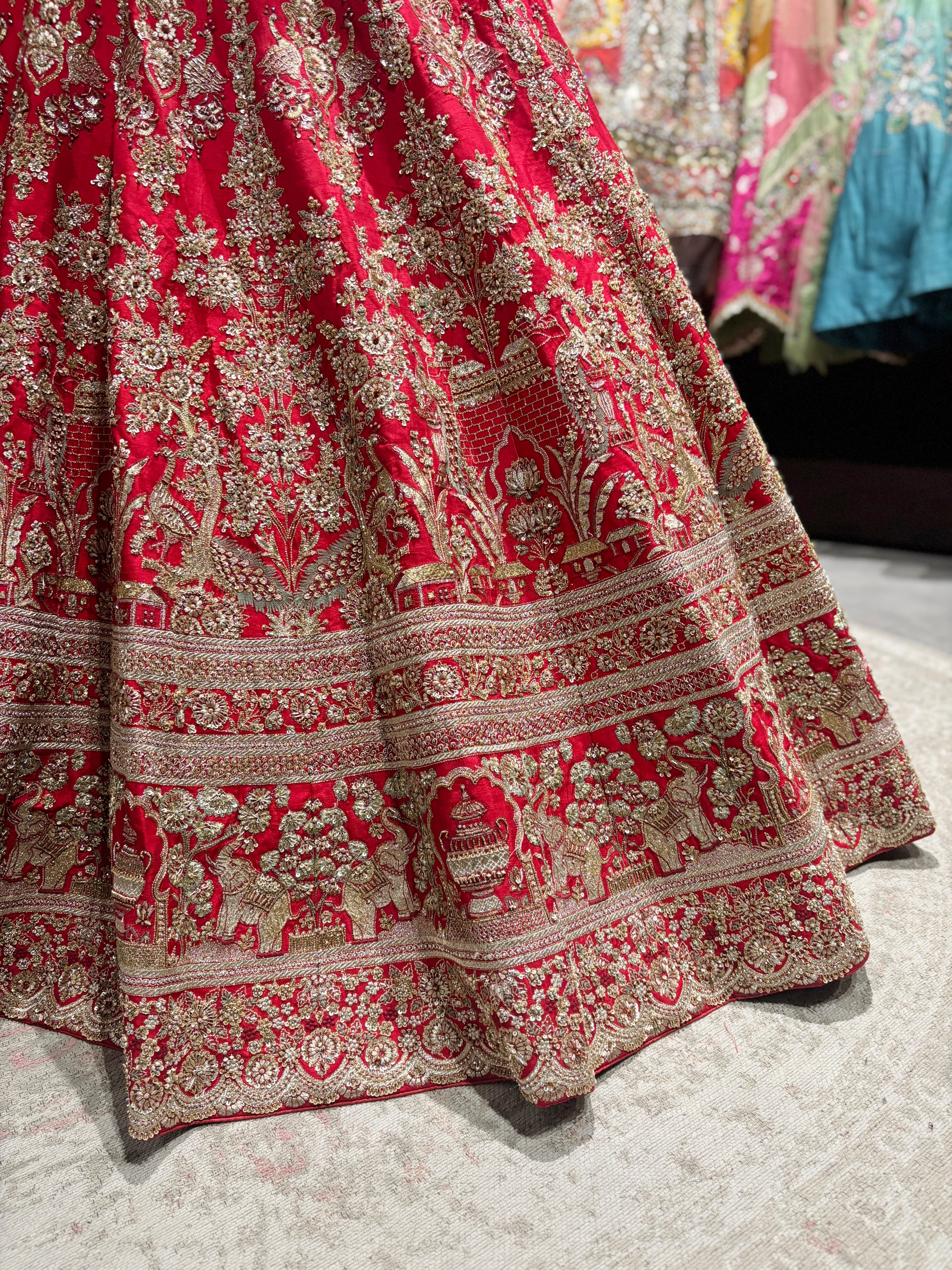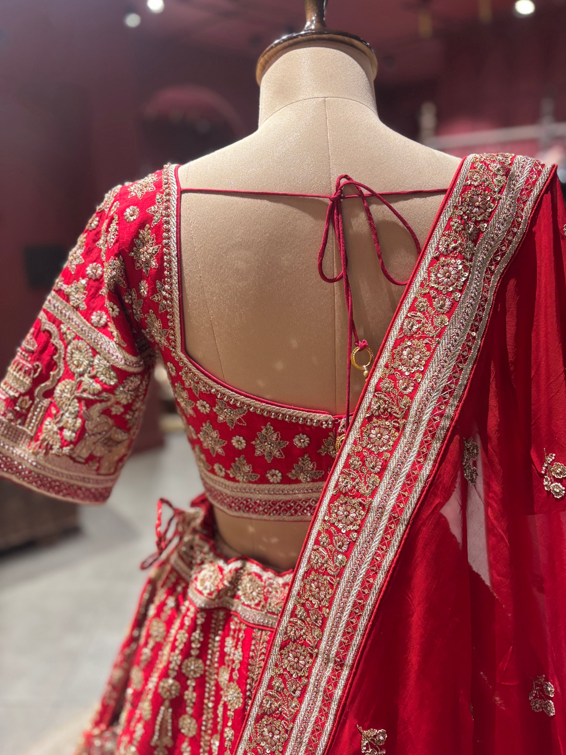 Celebrate your special day with timeless elegance in this classic red bridal lehenga, beautifully designed with intricate zari embroidery and luxurious detailing. Crafted from premium fabric, the lehenga features rich gold threadwork arranged in traditional floral and heritage motifs, creating a majestic and royal look. The heavily embroidered border and grand flare enhance its bridal charm, making it perfect for weddings and grand celebrations.