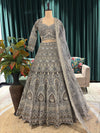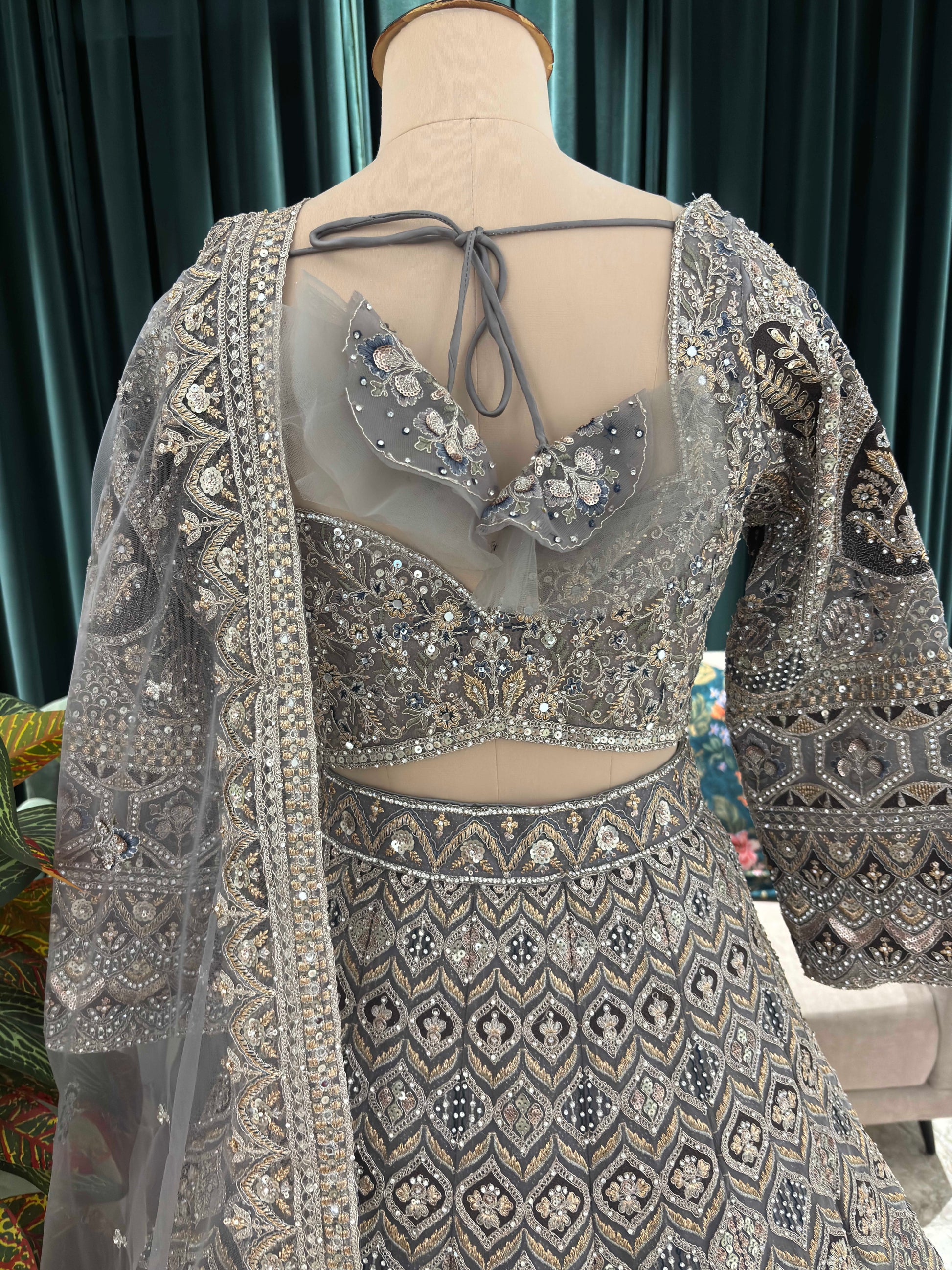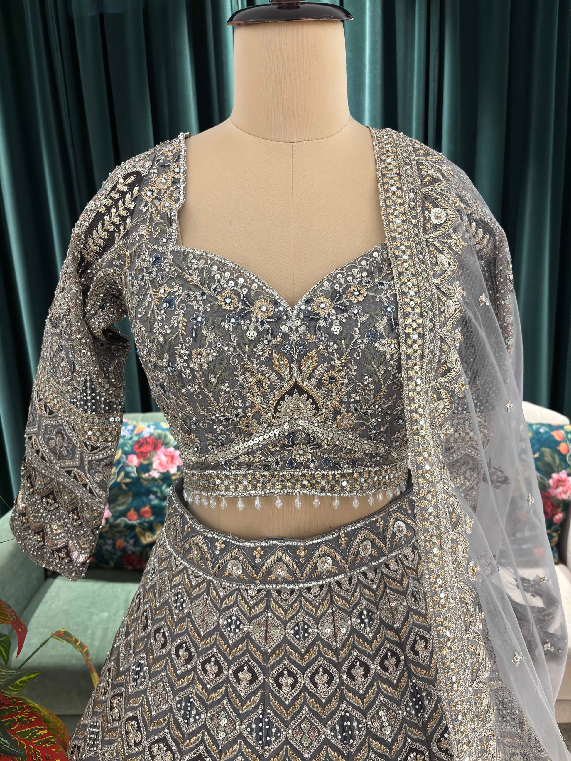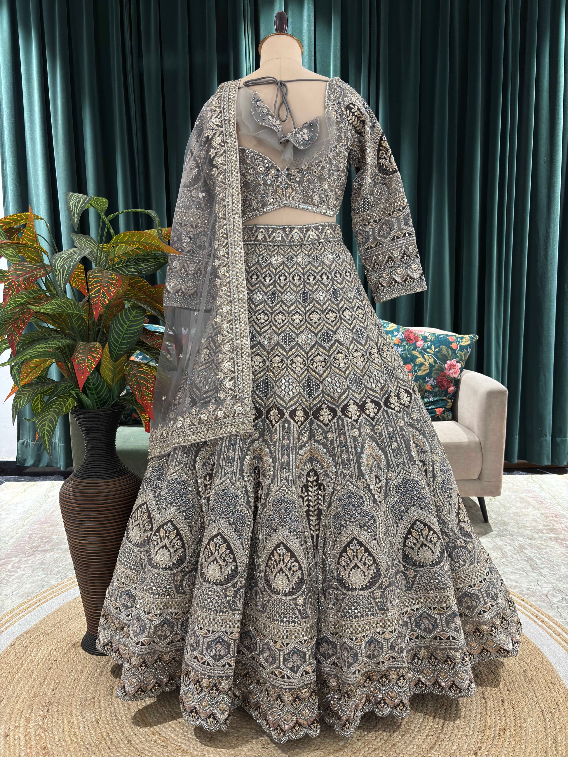 Bathed in a dreamy shade of lavender purple, this exquisite net lehenga is a celebration of regal charm and artistic finesse. The silhouette comes alive with a symphony of zari embroidery, shimmering sequins, and twinkling American diamond embellishments, meticulously arranged to capture light and attention with every step. Intricate multi-thread work flows across the ensemble like poetry in motion—featuring peacock and floral motifs that lend a touch of heritage to the contemporary palette. The blouse, with its deep V neckline and ornate beadwork, complements the heavily embroidered skirt in perfect harmony. A sheer dupatta edged with matching detailing completes the look, adding ethereal grace.