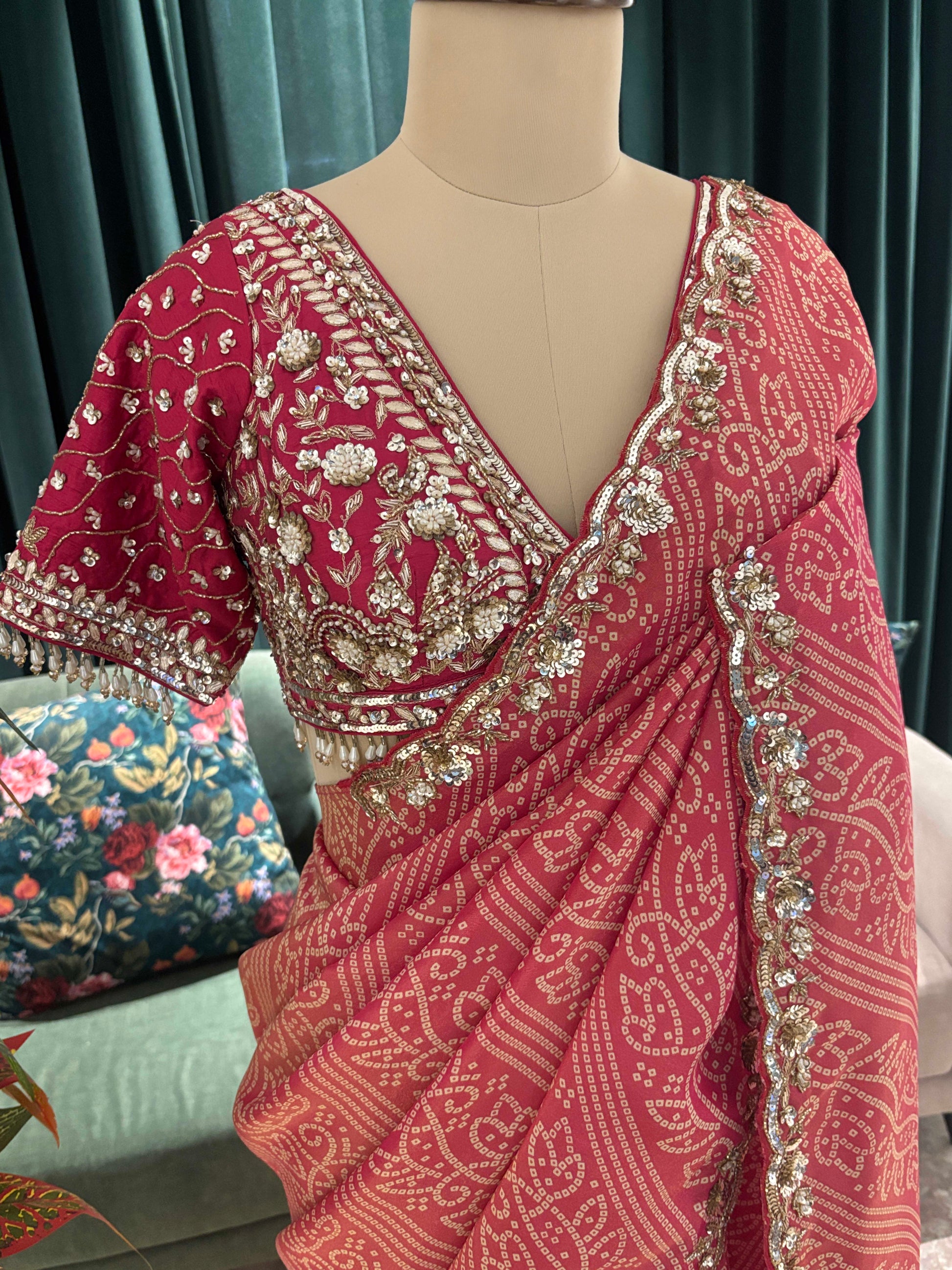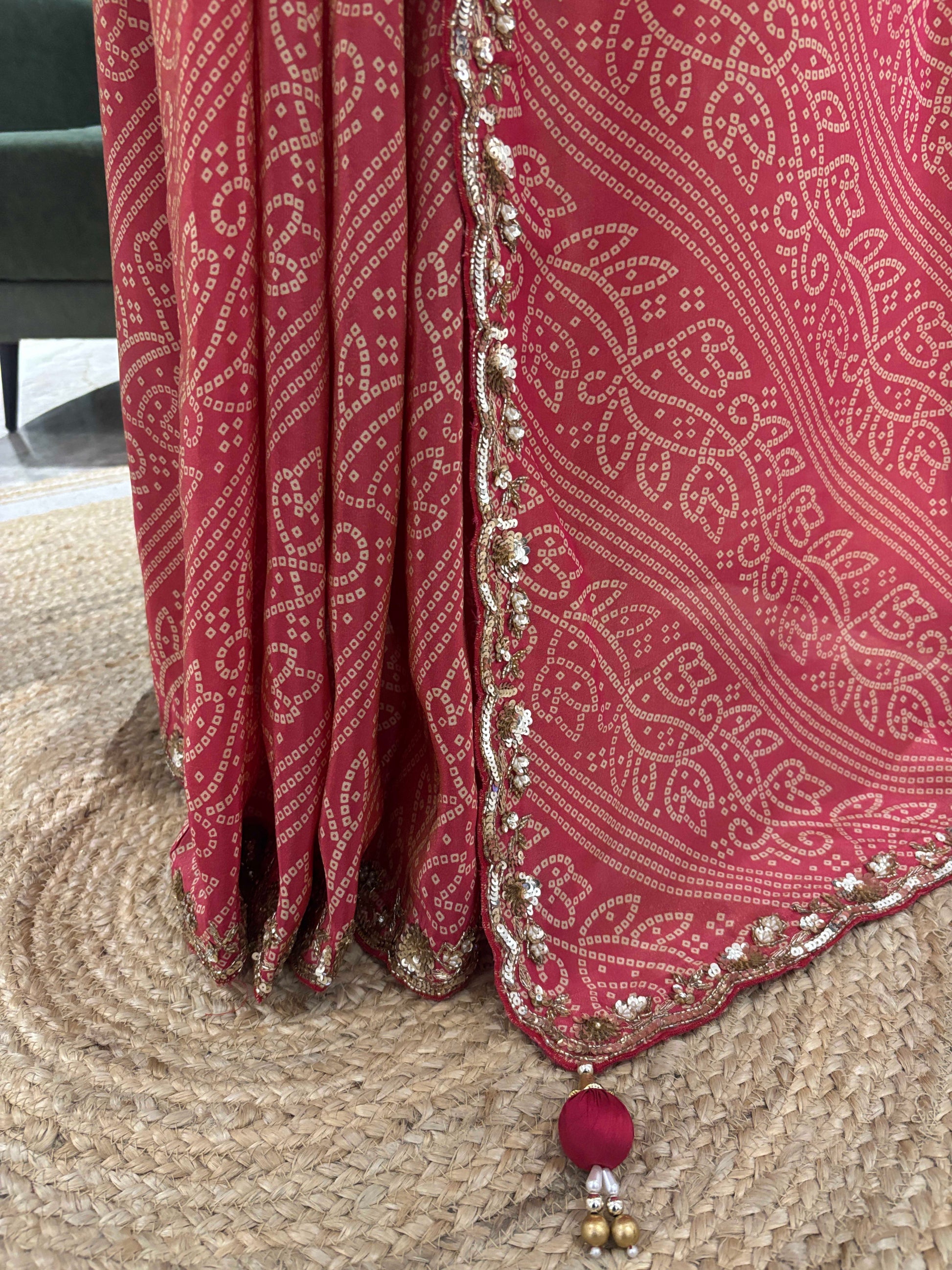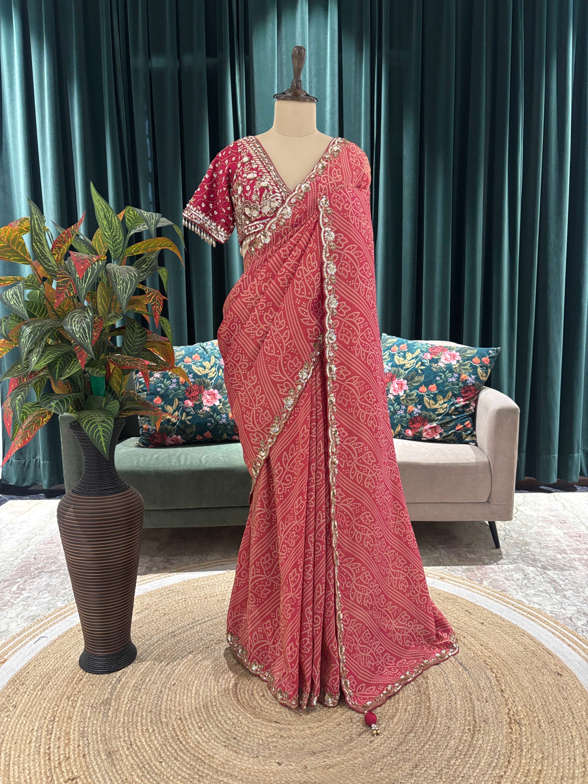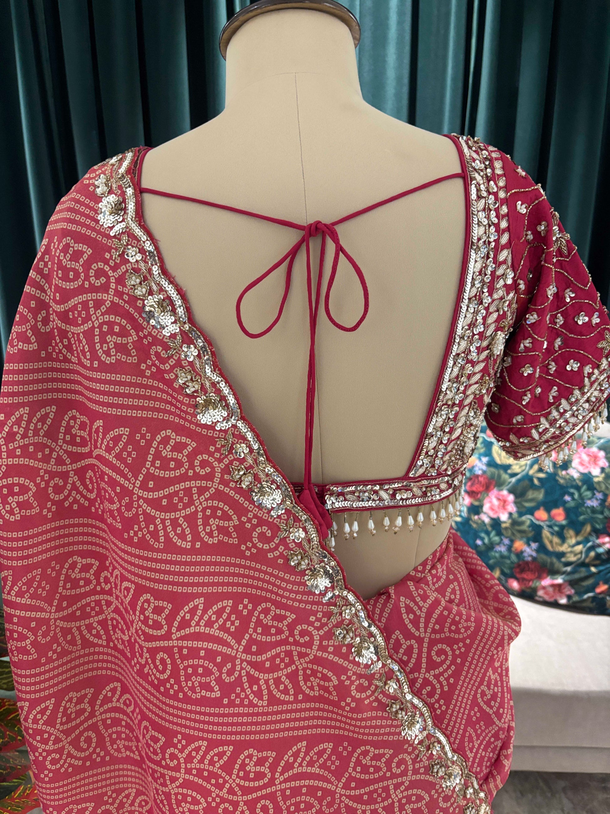 Add timeless charm to your ethnic wardrobe with this beautiful dusty rose Bandhani saree, designed to celebrate traditional artistry with a refined touch. The saree features classic Bandhani-inspired patterns gracefully spread across the body, creating a rich and elegant visual appeal.
