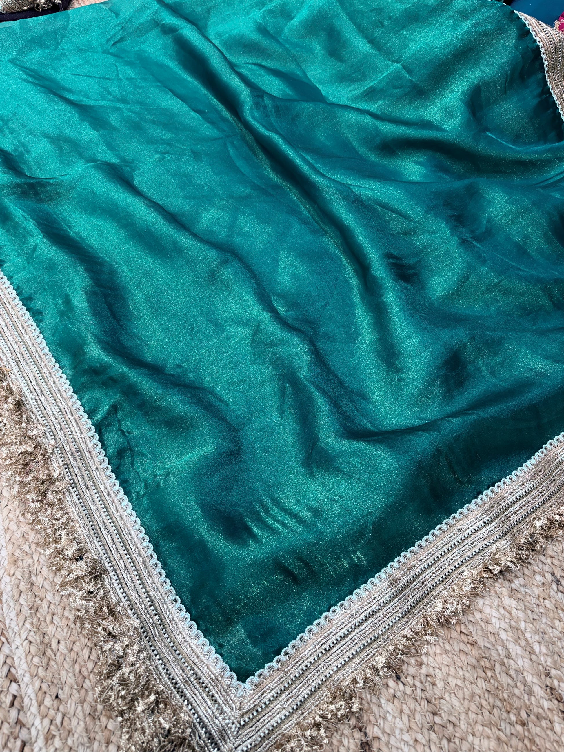 Stunning green Banarasi saree featuring a rich golden zari border that adds a royal and graceful touch. Perfect for weddings, festive occasions, receptions, and traditional celebrations. This Banarasi saree offers a smooth drape, premium fabric feel, and timeless design, making it an ideal choice for special Indian occasions.