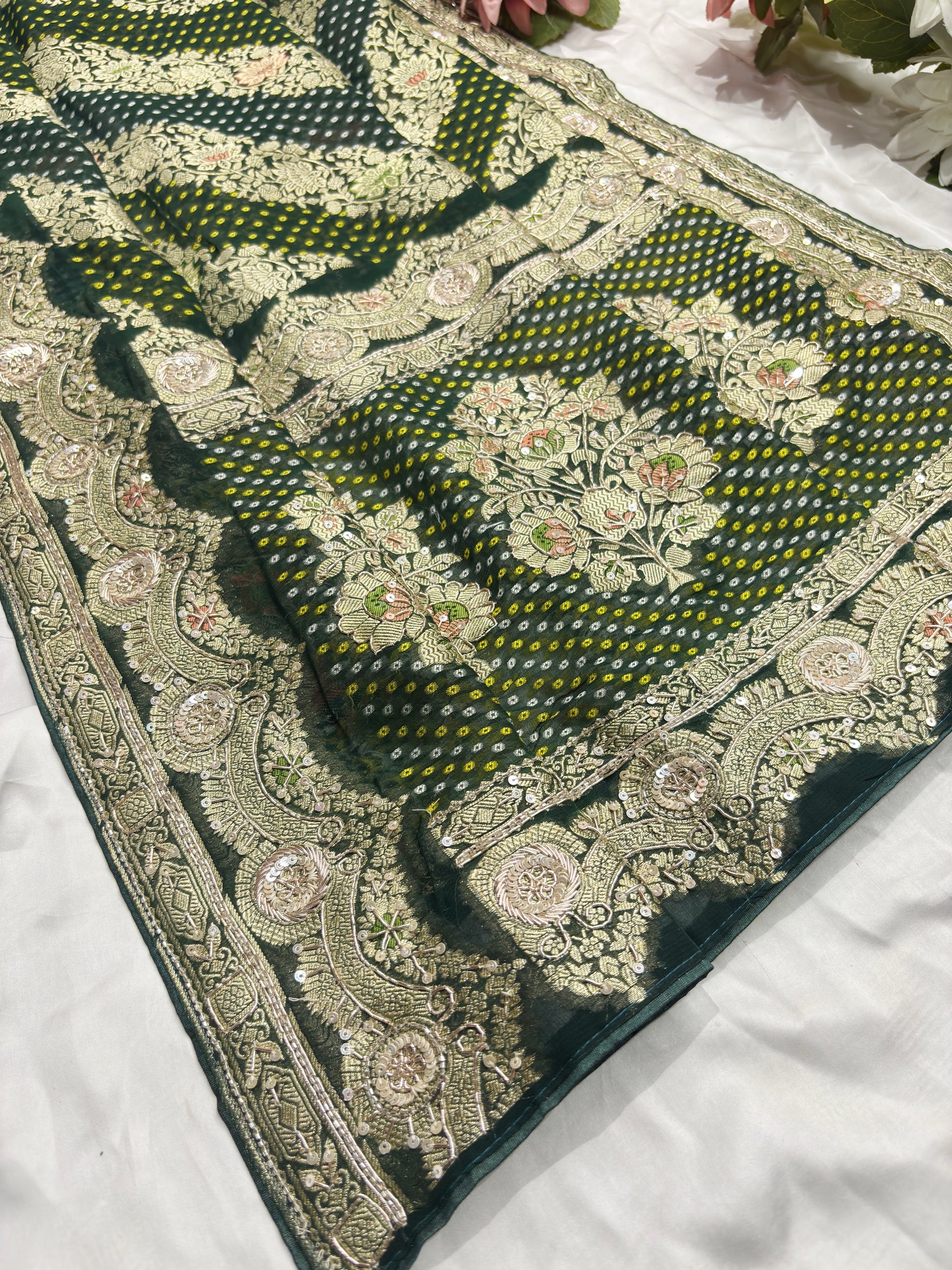 Add royal charm to your ethnic collection with this beautiful green Bandhani silk saree, featuring traditional Bandhej patterns and intricate floral zari embroidery. The richly crafted designer border with heavy zari, sequins, and detailed thread work enhances its luxurious appeal. Perfect for weddings, festive occasions, and traditional celebrations, this saree blends heritage craftsmanship with timeless elegance for a graceful and sophisticated look.
