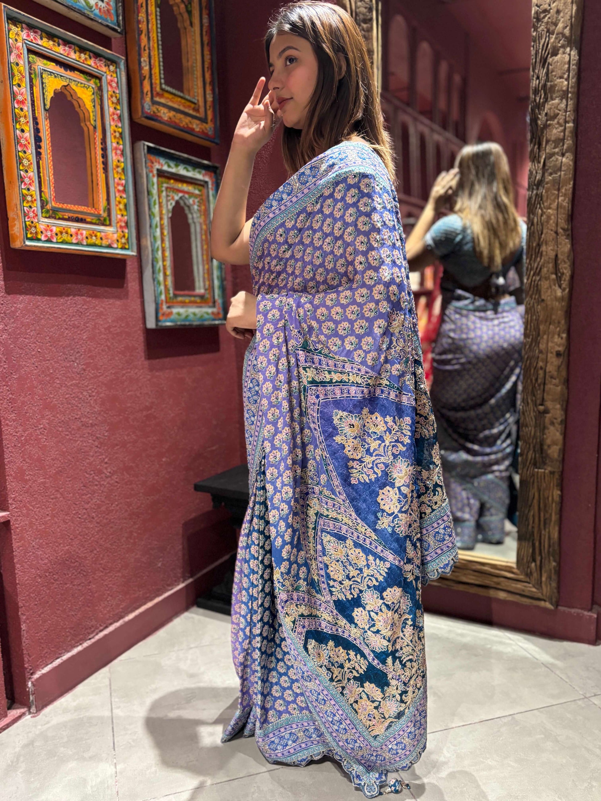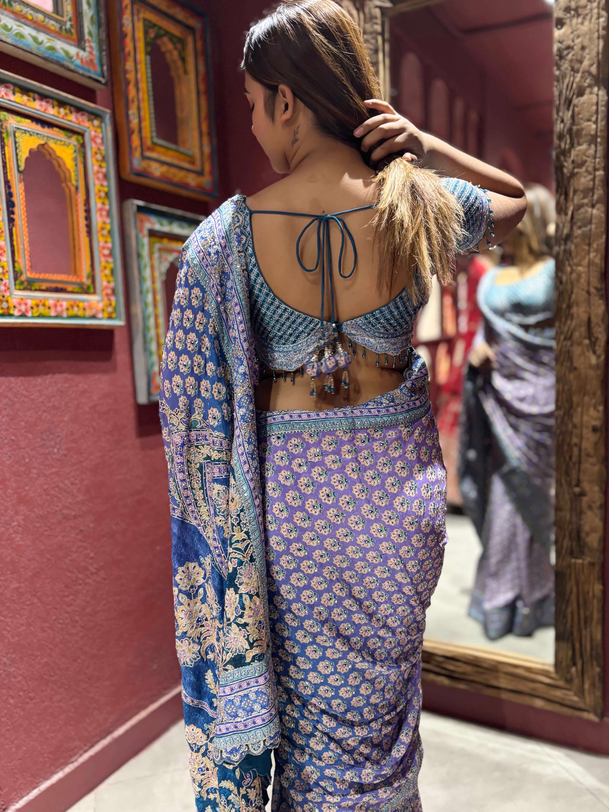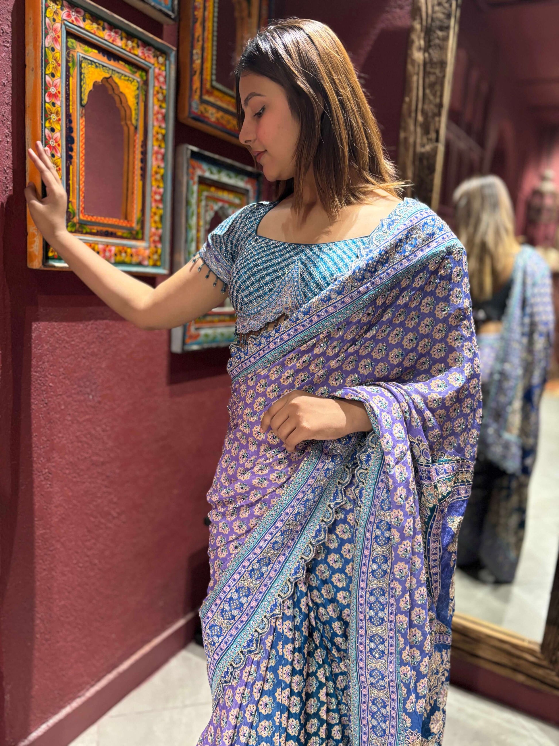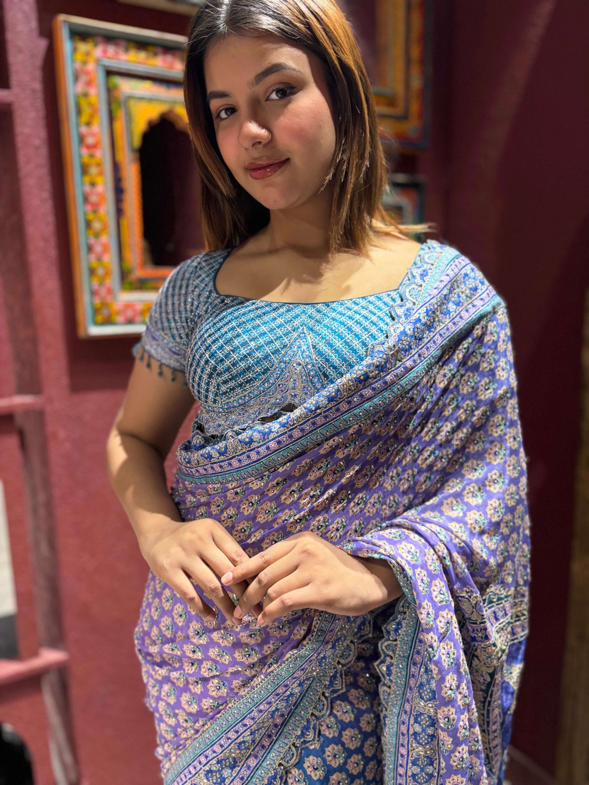 Grace meets heritage in this beautiful lavender and teal saree, designed for women who love timeless prints with a regal twist. Crafted from smooth, flowy silk blend fabric, this saree drapes effortlessly and feels light yet luxurious.