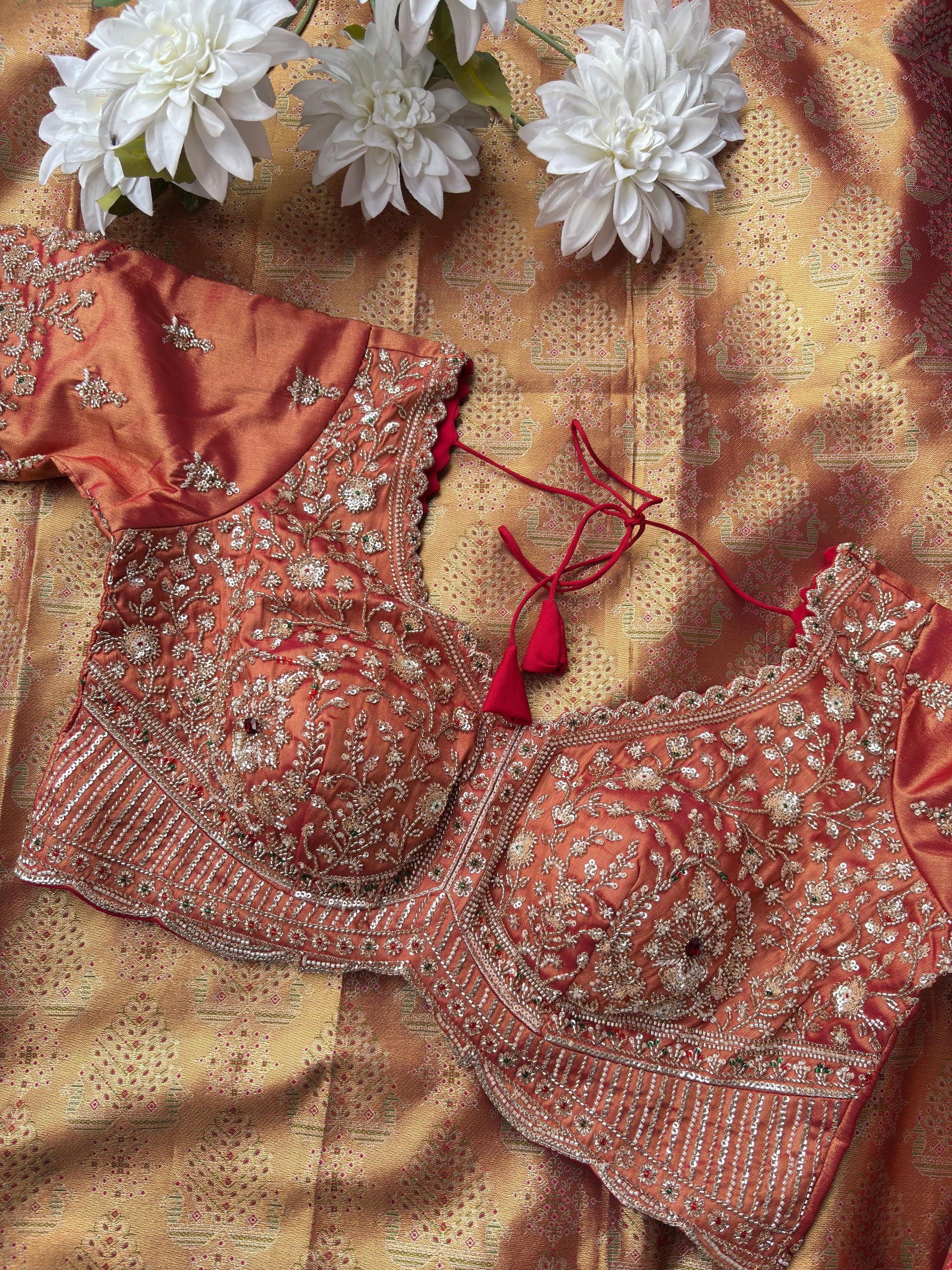Grace your special occasions with this exquisite gold Kanchipuram saree paired with a peach bridal blouse. The saree features rich zari weaving with traditional motifs, offering a regal and timeless appeal. The blouse is beautifully designed with heavy embroidery, sequins, and intricate handwork, adding a luxurious touch. Perfect for weddings, receptions, and festive celebrations, this ensemble blends elegance with traditional charm effortlessly.