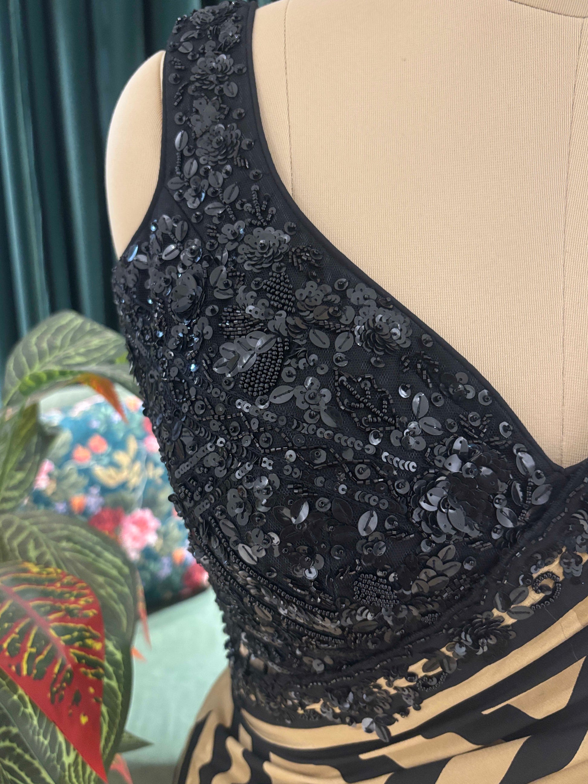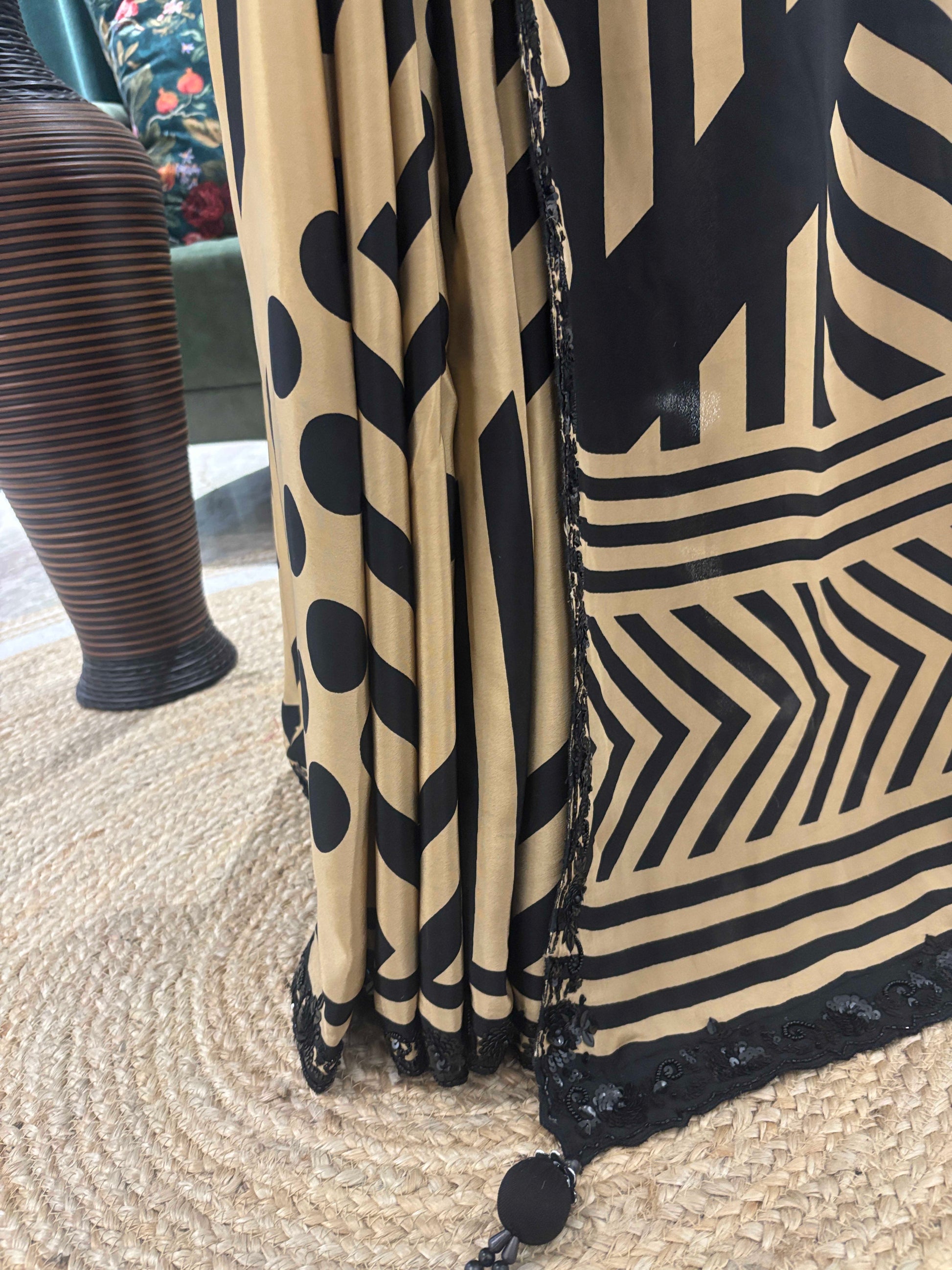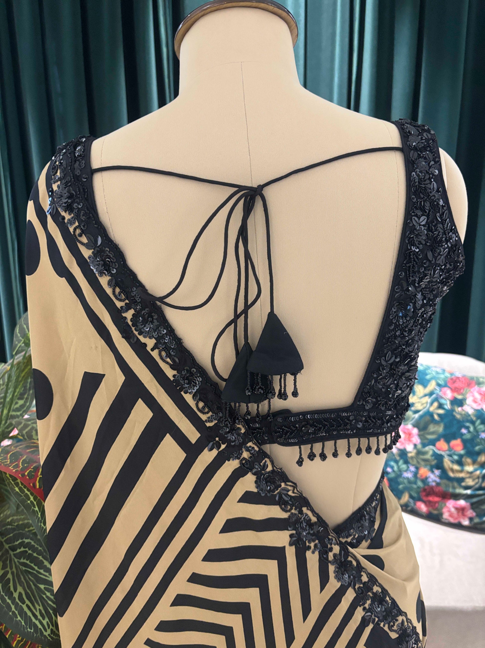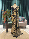 Make a bold style statement with this contemporary beige and black printed saree, designed for women who love modern elegance with a touch of glamour. The saree features striking geometric and abstract prints in black, beautifully contrasted against a warm beige base for a chic, eye-catching look.