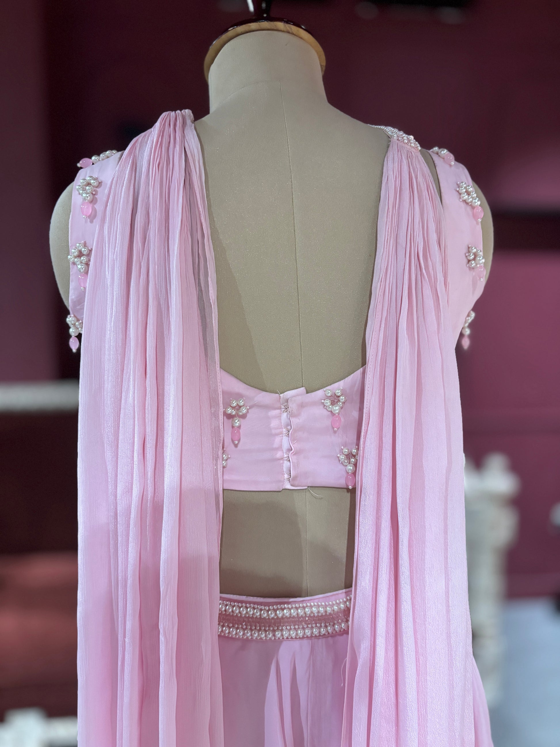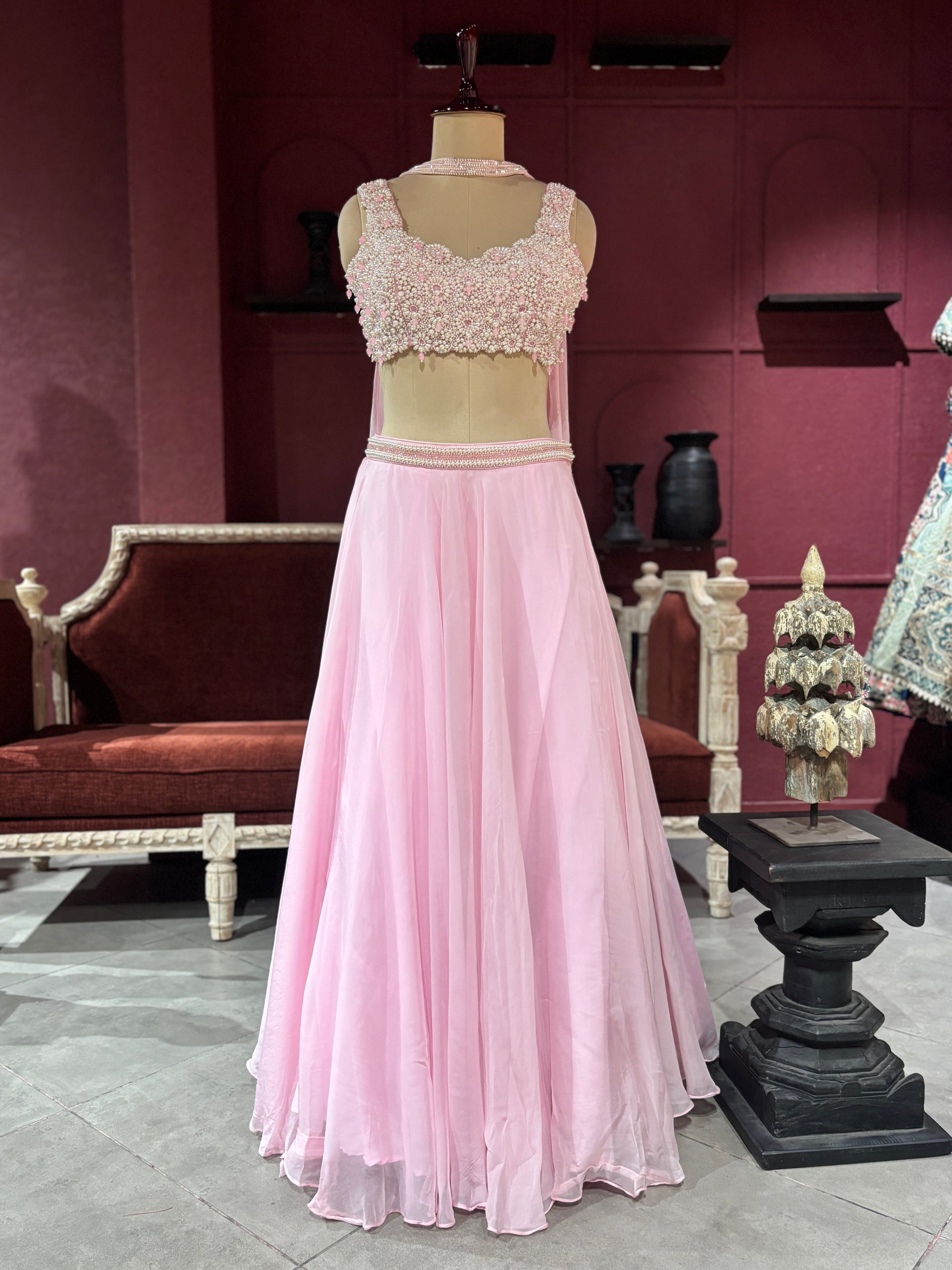 This graceful blush pink lehenga features a heavily embellished sleeveless choli with intricate beadwork and embroidery. The flowing sheer skirt adds elegance and charm, making it a perfect ensemble for bridal receptions, festive occasions, and grand celebrations.
