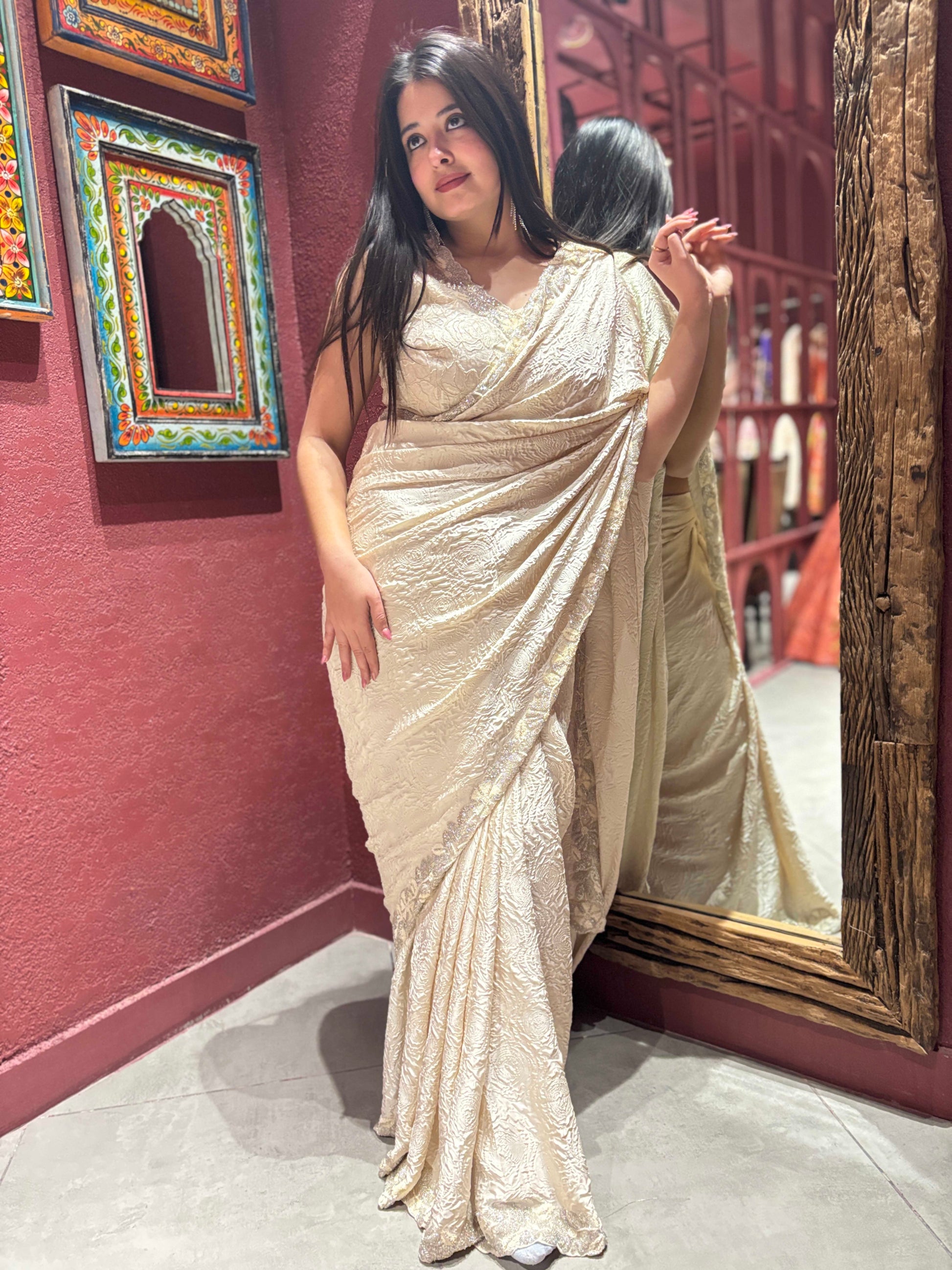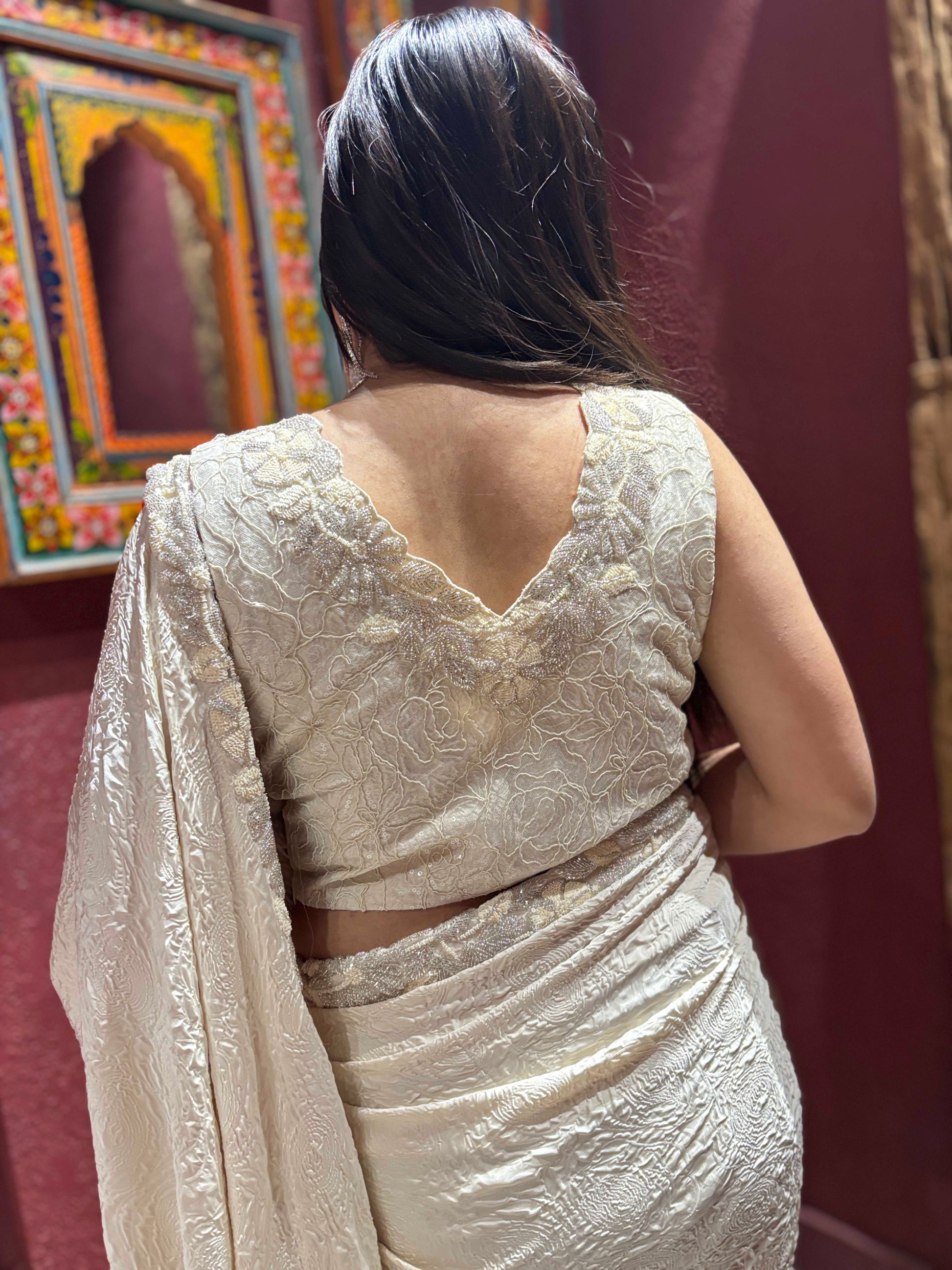 This crepe ivory colour readymade blouse saree features elegant textured work that adds subtle depth and sophistication to its graceful drape. Crafted from soft, flowy crepe, it offers a flattering silhouette and all-day comfort. The soothing ivory tone enhances its timeless appeal, making it an ideal choice for festive occasions, parties, and elegant evening gatherings. Perfect for those who love understated luxury with a modern touch.