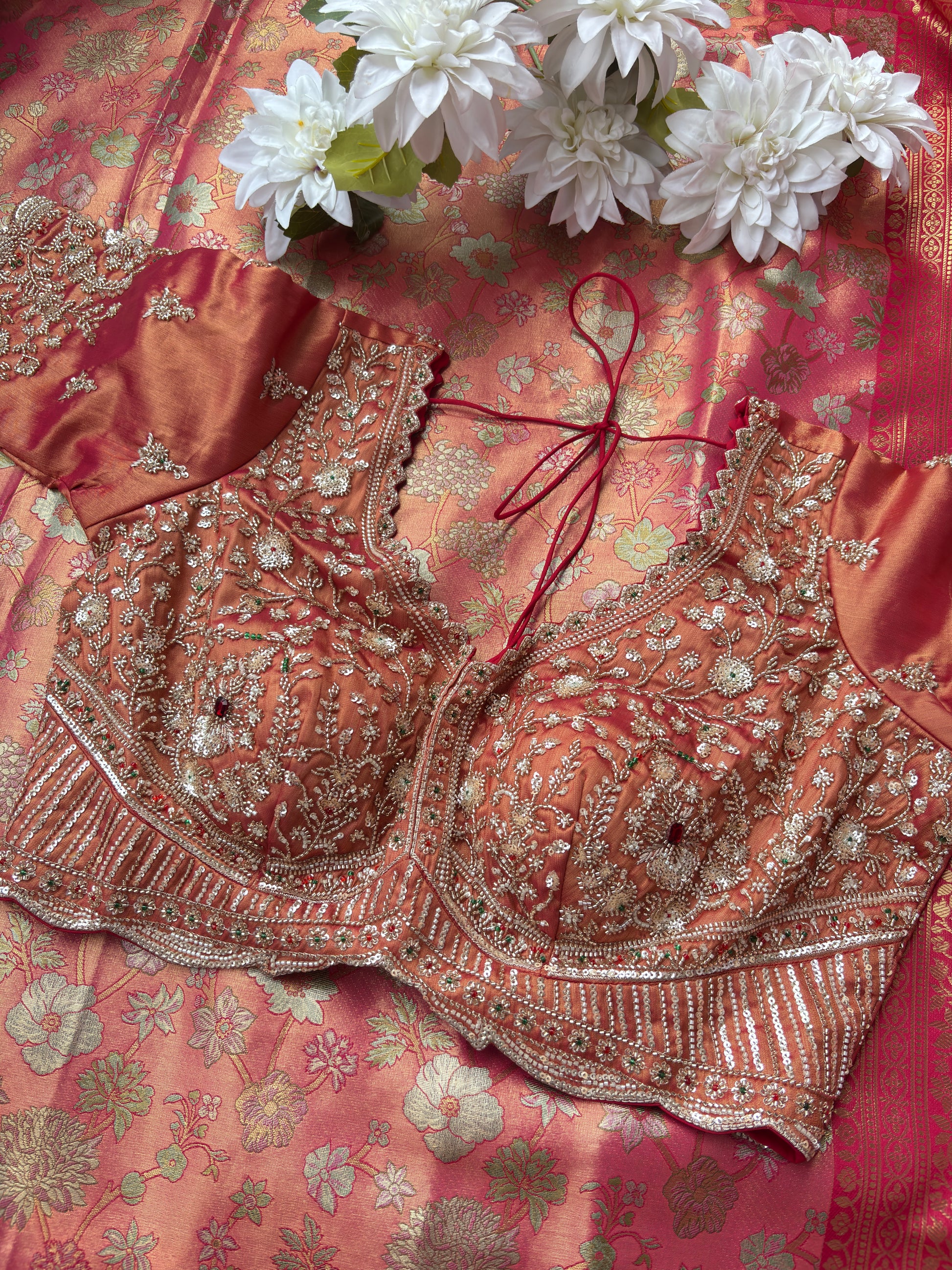 Make a royal statement with this stunning Kanchipuram saree paired with a peach designer blouse. The saree features rich golden zari weaving with traditional motifs, giving it a luxurious and festive appeal. The blouse is beautifully crafted with intricate embroidery, sequins, and fine detailing, adding elegance and charm. Perfect for weddings, festive occasions, and grand celebrations, this combination offers a timeless ethnic look.