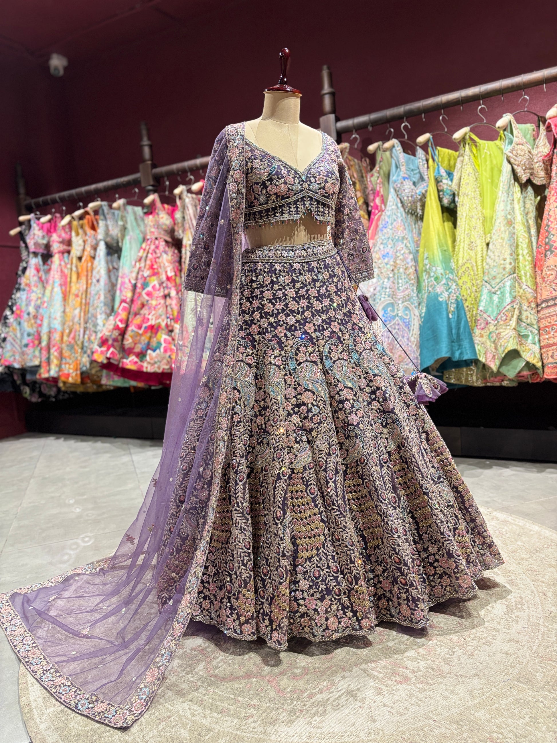 Make a grand entrance with this stunning royal purple bridal lehenga, crafted to reflect timeless elegance and intricate artistry. The lehenga is beautifully adorned with dense zari, thread, and sequin embroidery featuring detailed floral and paisley motifs that create a majestic and luxurious appeal. The heavily embellished flare adds volume and richness, giving the outfit a regal silhouette perfect for special occasions.
