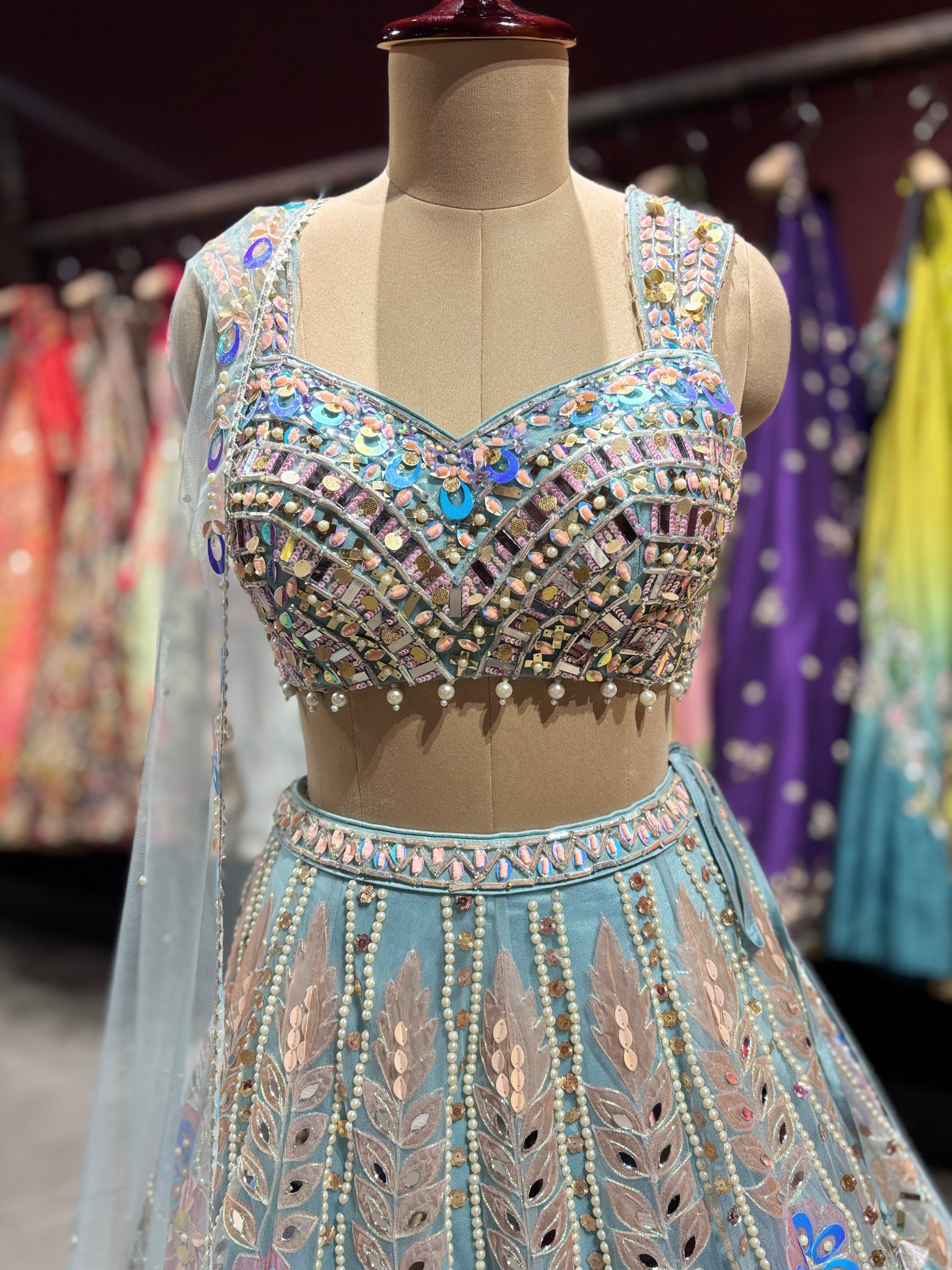 Step into elegance with this pastel blue and mauve designer lehenga set, crafted for brides and festive occasions. The flared skirt showcases intricate thread embroidery, mirror accents, stone detailing, and delicate floral motifs that create a rich, luxurious look. The beautifully structured blouse features heavy handwork with shimmering embellishments, offering a perfect blend of tradition and modern style.